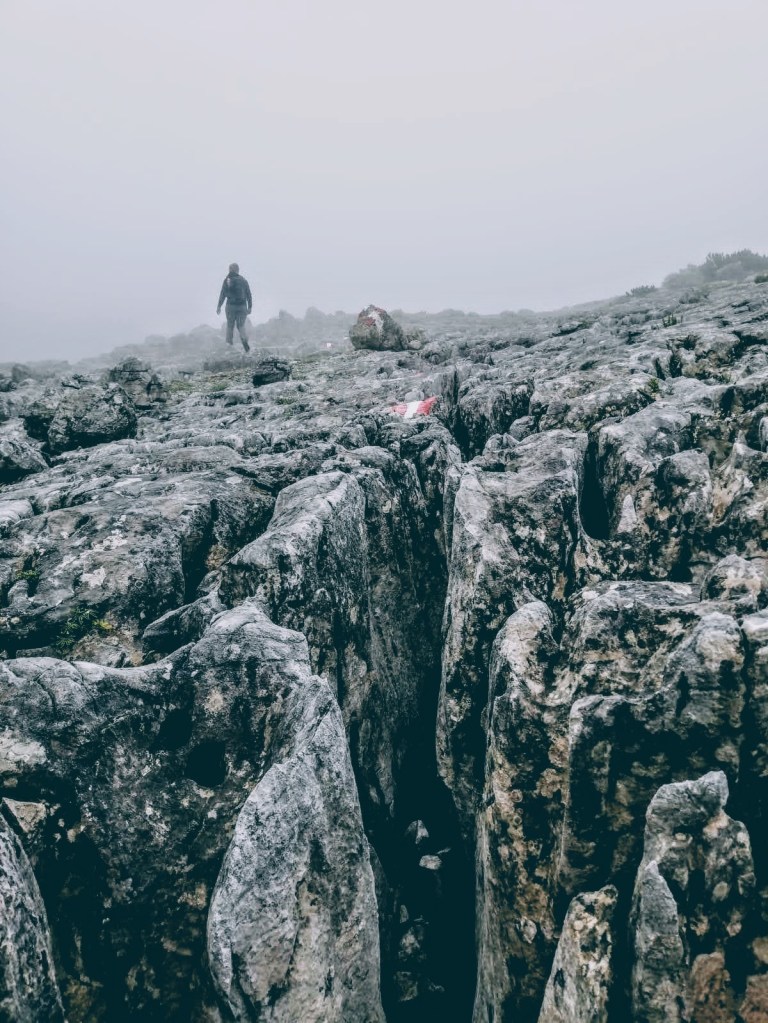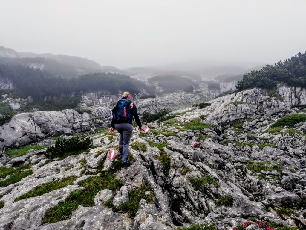 Die Gjaid Alm, einer dieser besonderen Kraftplätze am Krippenstein. Bei Nebel noch mystischer als mit fetzblauem Himmel. Natürlich ist dieser Steig auch bei Schönwetter für Trittsichere zu empfehlen – bei Nässe etwas mit Vorsicht zu geniessen, weil die Felsen teilweise rutschig sind und bei Nebel die Orientierung schwer fallen kann. Lohnend aber immer.