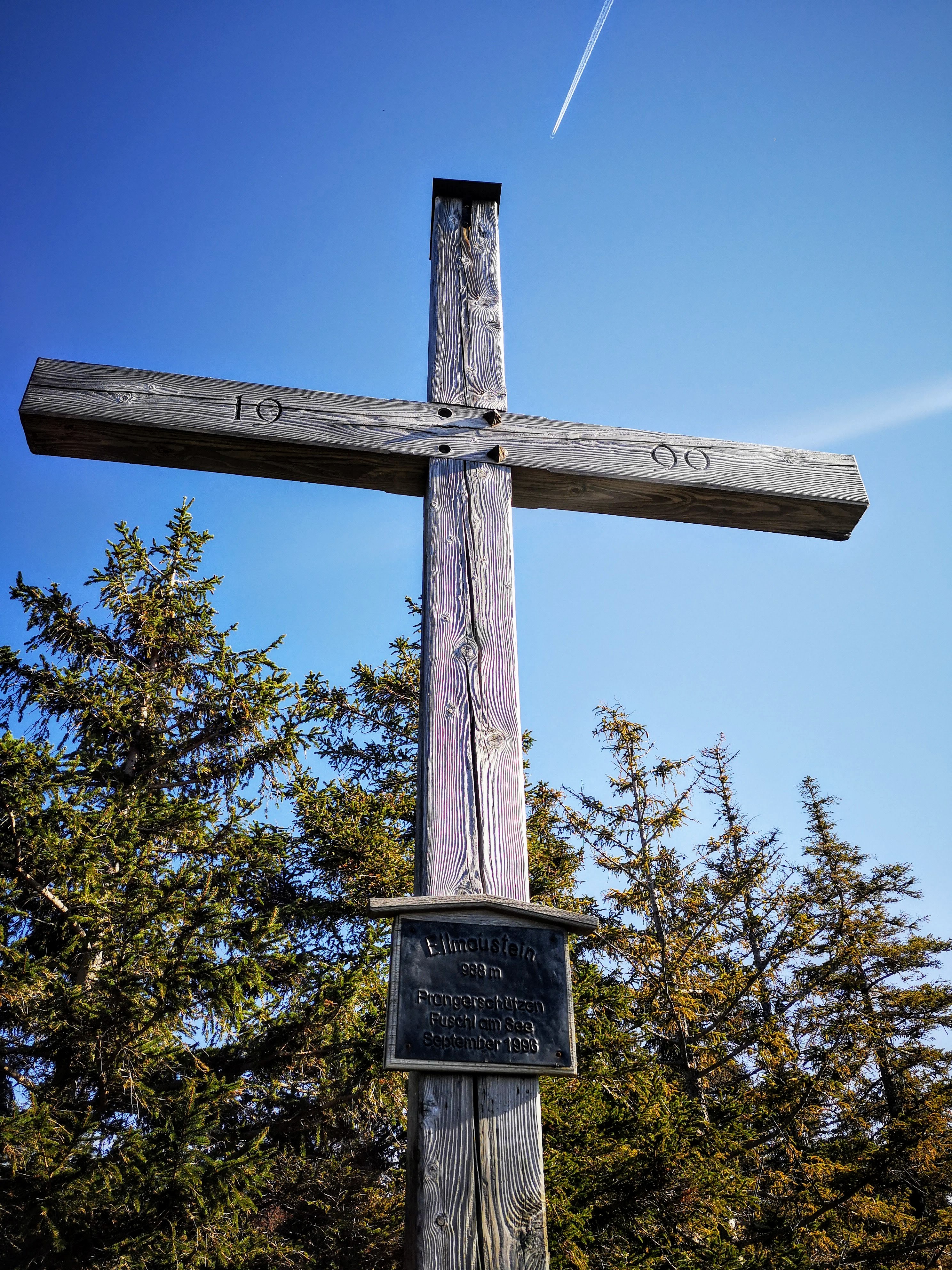 Bis zur Abzweigung und dem eigentlichen Aufstieg im Ellmautal verläuft der Weg unspektakulär auf der Strasse (bzw in meinem Fall komme ich über die Forststrasse von der Vorderseite ins Ellmautal). Danach gehts auf der SOseite erst über einen mal steinigen, mal wurzeligen Pfad und nach oben, der zu einer Forststrasse führt. Der markierte Weg führt im Graben rechts weiter und durch den Steilwald linkerhand stetig bergauf, bis man am Ostrücken entlang dann zum Gipfelkreuz gelangt. Das steht übrigens auf 988m, die höchste Stelle liegt aber auf 1047m (weglos und keine Aussicht).