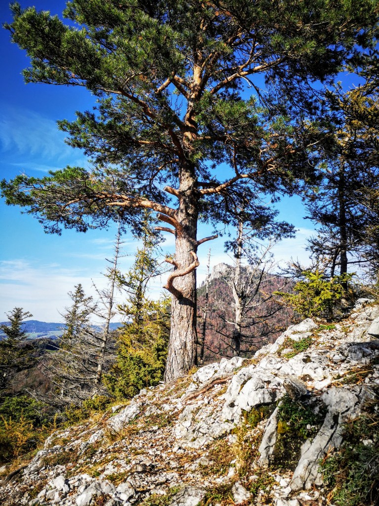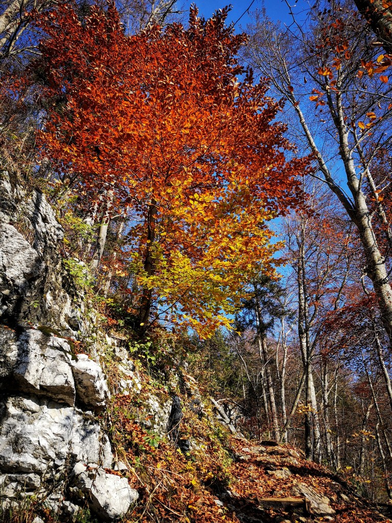 Oben angekommen bin ich fast a bissal baff – mit dieser wirklich wunderschönen Aussicht auf den kompletten Fuschlsee & die Region hab ich ehrlich gesagt so nicht gerechnet. Da zahlt es sich aus, nicht vorher nach Bildern vom Gipfel zu suchen und sich einfach mal überraschen zu lassen. Fast a bissal mediterranes Gefühl verbreiten die knorrigen Kiefern & Föhren. Am Holzkreuz von 1990 steht übrigens 988m – in den Karten 994m. Wie auch immer. Beim Abstieg entdecke ich noch einen schmalen Pfad, der nach rechts führt und von dem der Wolfgangsee zu sehen ist. Ansonsten gehts genauso retour wie rauf, als Souvenir nehme ich einen blauen Fleck am Popsch mit – Laubrutschpartie. Und jetzt lasse ich einfach die Bilder dieser Tour sprechen…