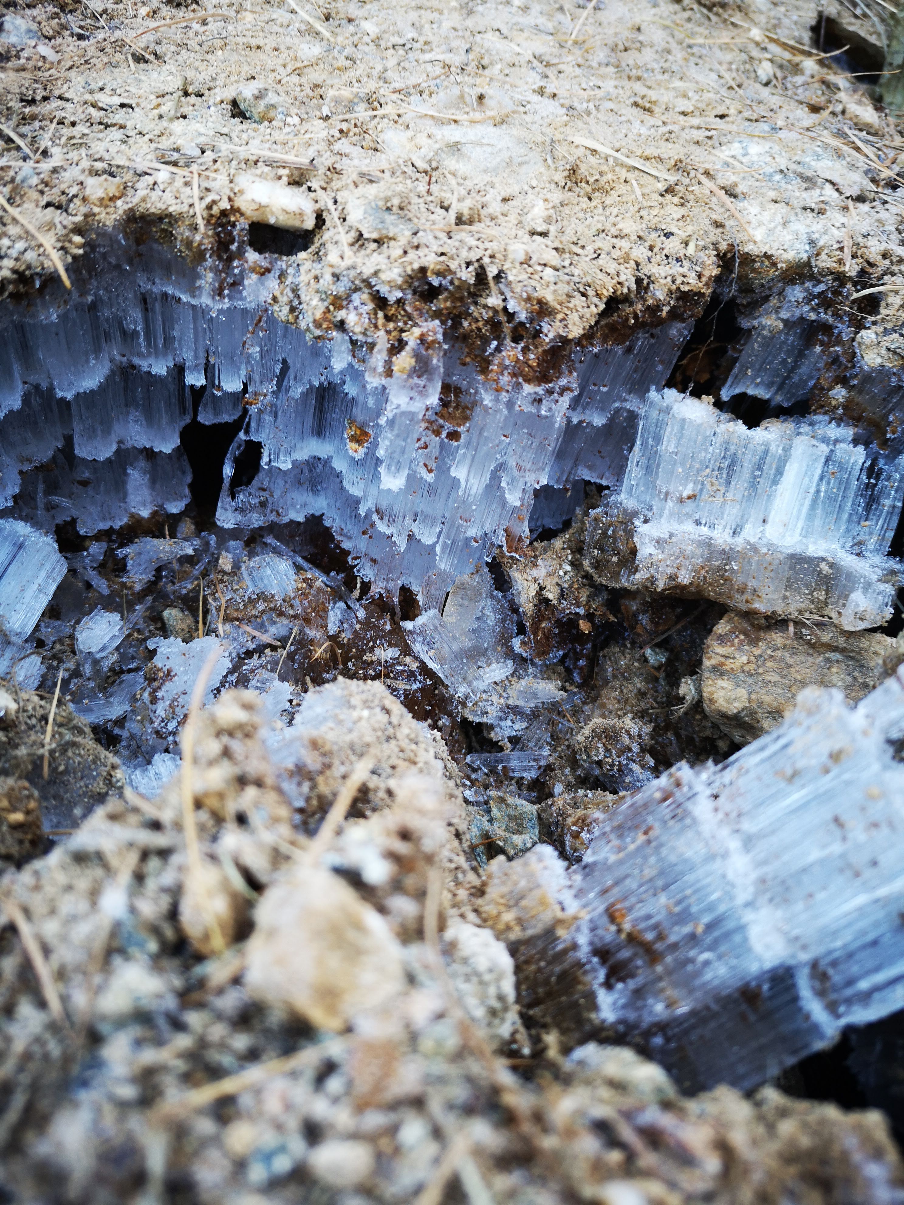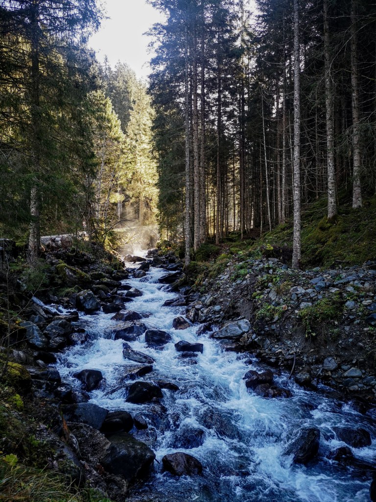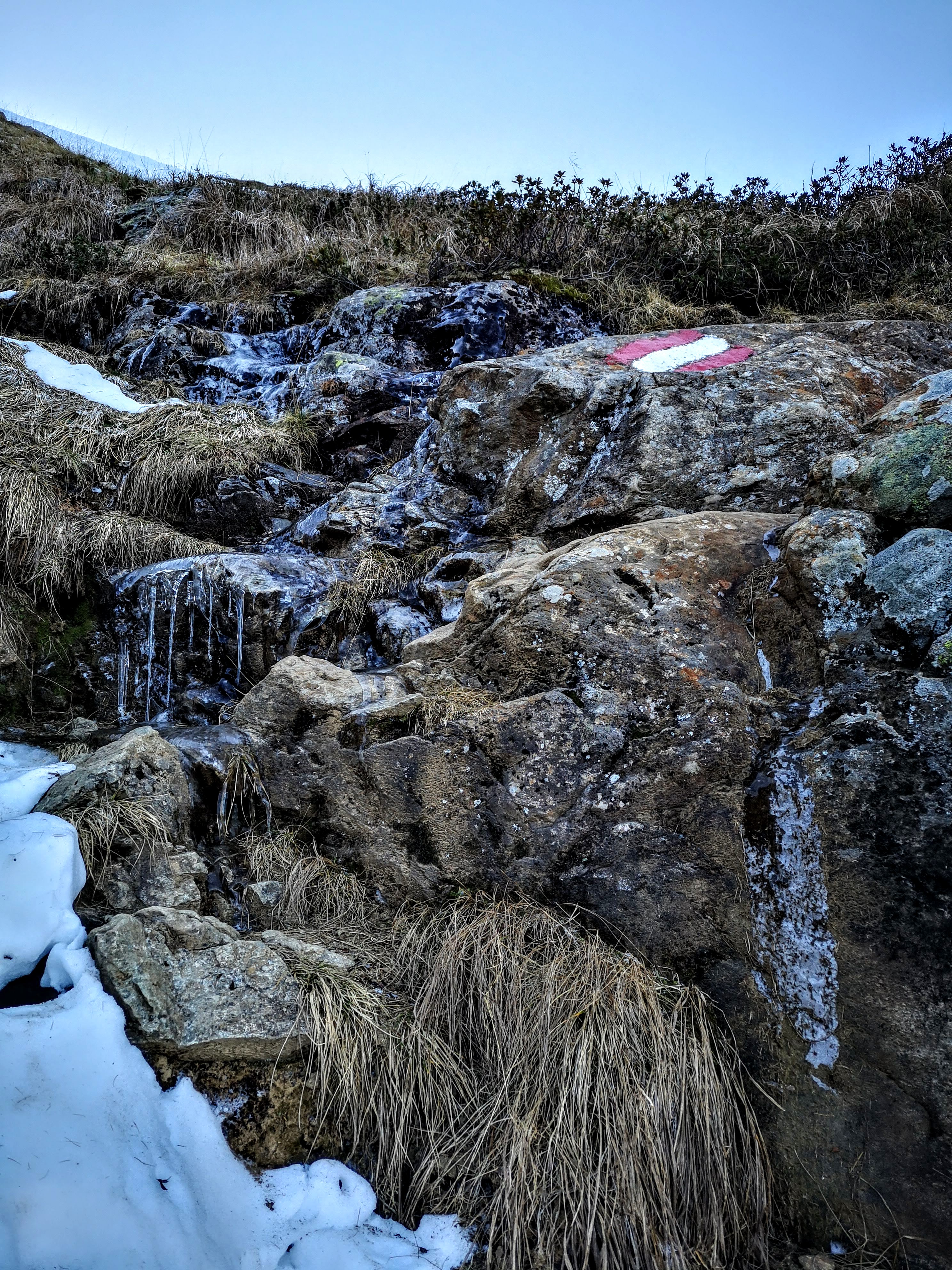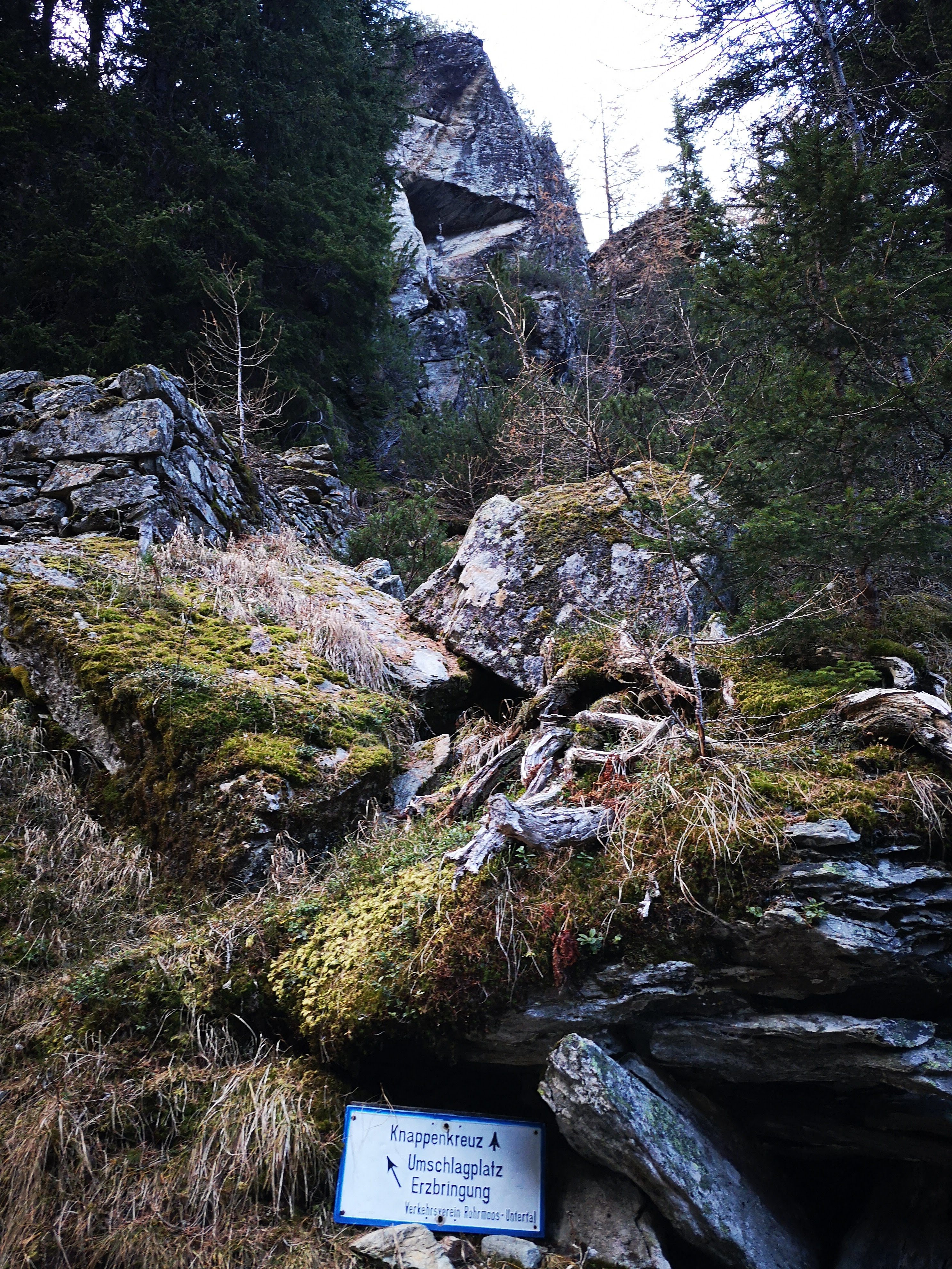 Ein alter, teilweise steiler Karrenweg (eisige Abschnitte) führt weiter bergab, der Landauersee (ein Abstecher würde ca. 30 Min dauern) zur Linken und vorbei am Knappenkreuz. Versteckt in einer Felsnische, nur ein kleines Schild weist darauf hin. Der Forststrasse so lange folgen, bis links der Wegweiser auf einen schmalen Pfad nach unten führt. Dieser trifft erneut auf die Forststrasse und lässt dann ein zweites Mal abkürzen. Über eine kleine, komplett vereiste Holzbrücke geht es via Lackneralm 1360m auf einem schmalen Steig durch den Wald bergab, eine weitere große Holzbrücke führt abermals über den wilden Giglachbach und zurück in den Wald. Alternativ kann man aber auch auf der Forststrasse bleiben (länger aber einfachere Variante). Ausgespuckt wird man dann in der Nähe des Nickelmuseums, zum Parkplatz Hopfriesen gehts ein kurzes Stück vorbei an Wiesen und Almhütten. Zum Sonnenuntergang ein letztes Mal eine frostige Brücke queren, der Bach raucht, die Luft eisig – der Himmel rosa…