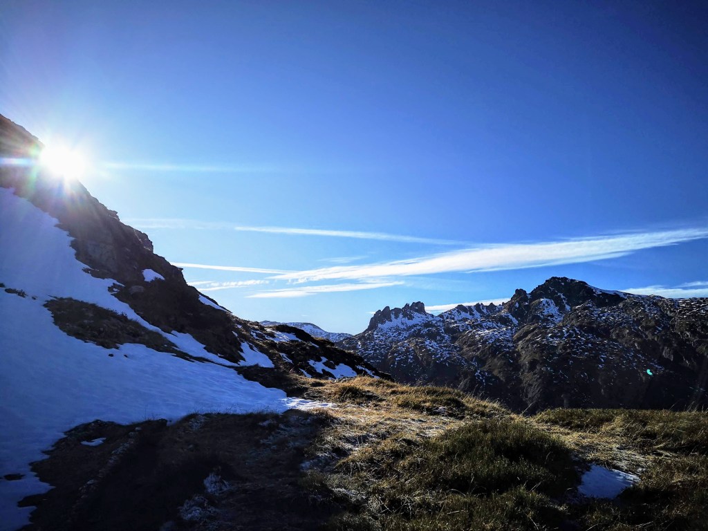 Vom rechten Seeufer 1648m schlängelt sich auf der Westseite der 775 Steig in Serpentinenform bergauf bis zum Murspitzensattel auf 2013m – Tiefblicke inklusive! Kurz vorm Sattel gibt es eine seilversicherte Stelle, die bei uns defekt und bereits abgebaut bzw. das Seil teilweise ausgezogen war. Wird sicher nach dem Winter repariert. Auch das Gipfelbuch war leider schon in der Winterpause… Keine Pause hat das Panorama – Dachstein inklusive! Und auch der Duisitzkarsee zeigt sich hier oben nochmal von seiner besten Seite. Die folgende Querung rüber ins Giglachkar ist allerdings schon etwas mit Vorsicht zu geniessen zu dieser Zeit. Schattig und dementsprechend vereist sind viele Stellen – höchste Vorsicht ist geboten! Grödel von Vorteil! Die ersten Sonnenstrahlen gibts erst wieder beim Abstieg ins weite Giglachkar 1887m.