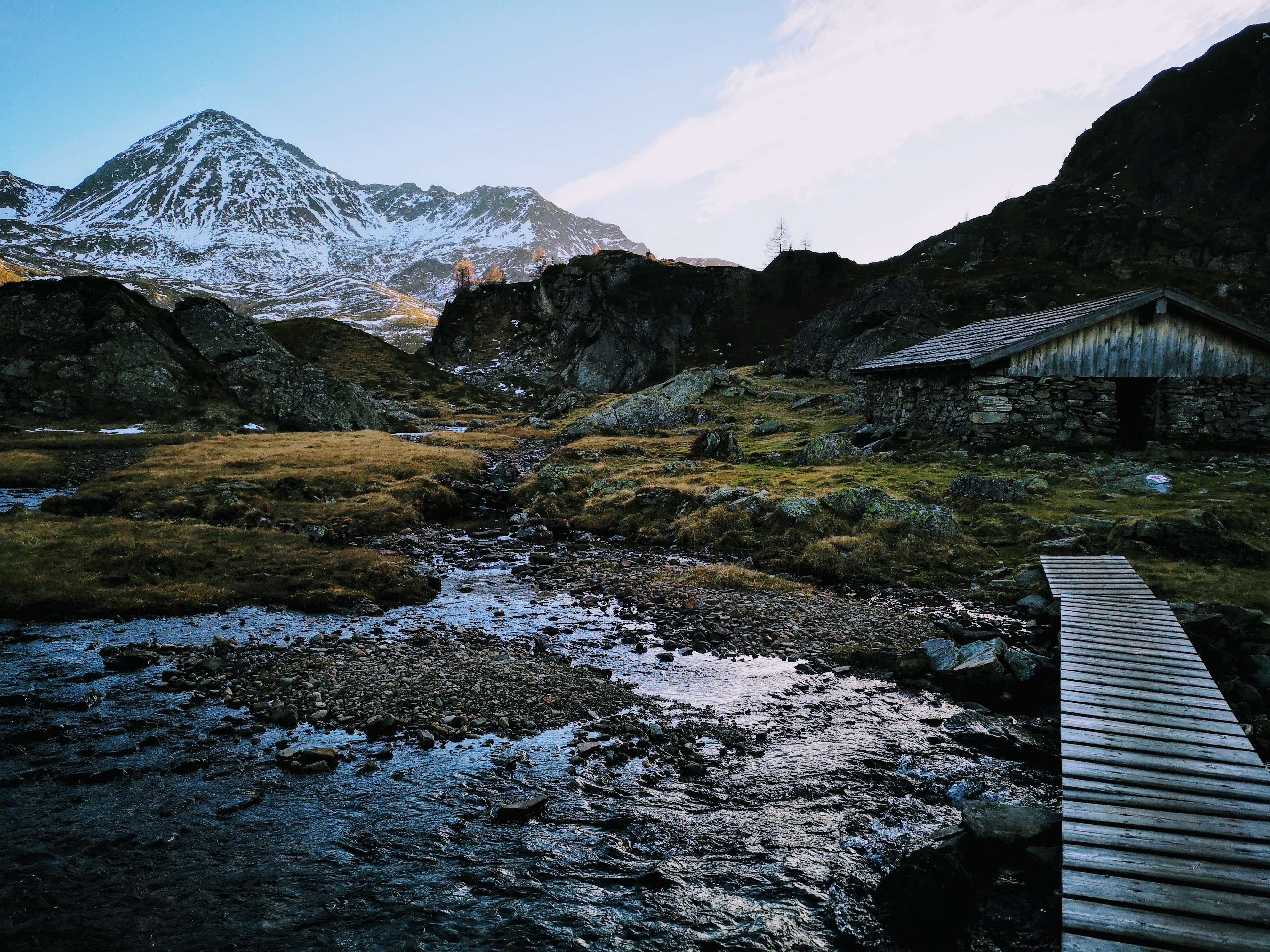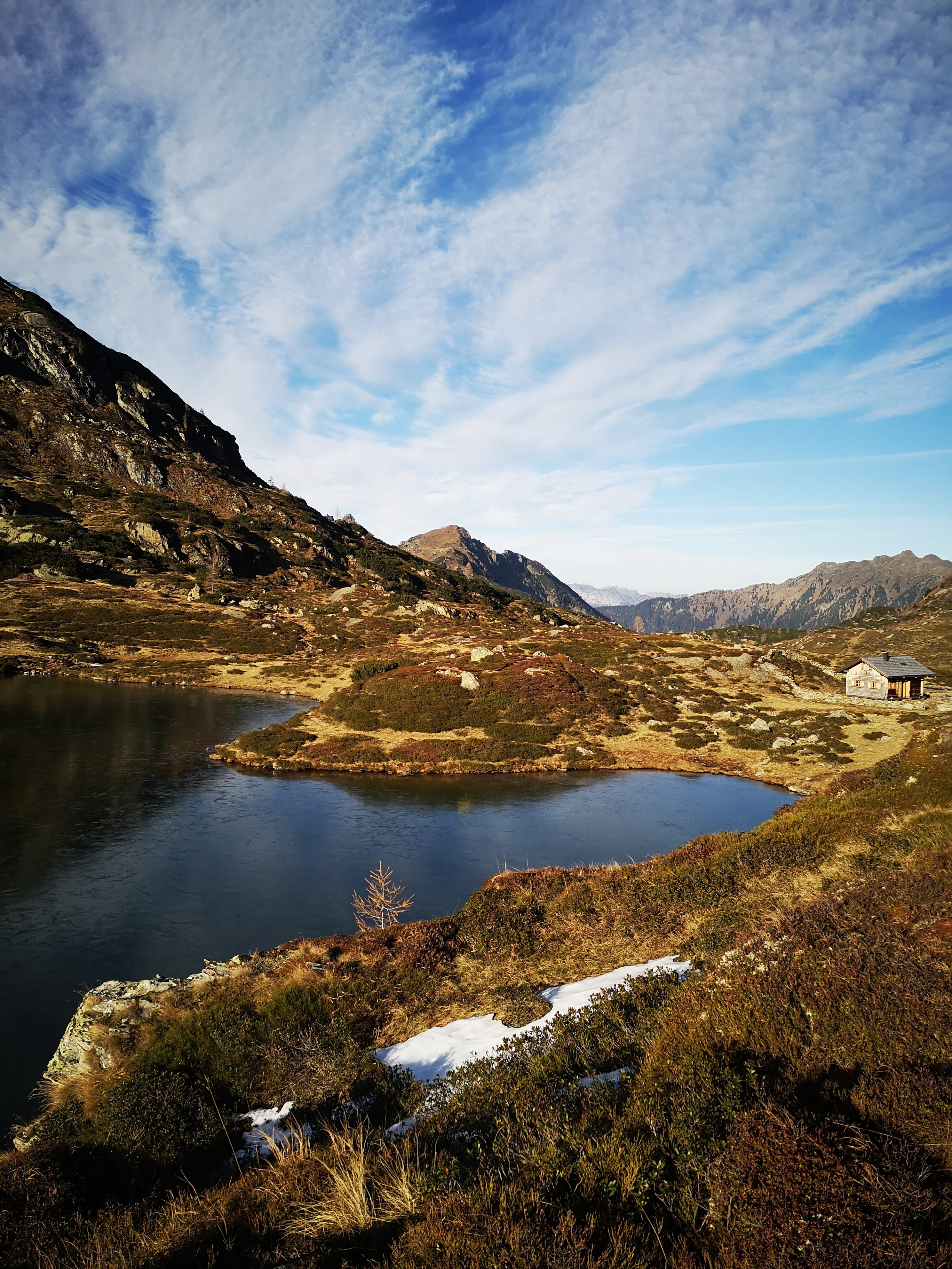 Die beiden Giglachseen – den unteren erreicht man zuerst, er liegt auf 1921m und mit 16,5 Hektar der größere. Fast komplett gefroren und fjordähnlich. Die beiden sind übrigens das Herzstück der westlichen Schladminger Tauern und fast so beliebt wie der Duisitzkarsee. Eingerahmt von der Steirischen 2459m und Lungauer Kalkspitze 2471m im Westen, Kampspitze 2390m im Norden und Znachspitze 2225 m, Hading 2332 m, Freying 2131 m im Süden. Der Obere Giglachsee 1930m ist mit einer Fläche von etwa 3,5 Hektar deutlich kleiner. Am rechten Ufer lädt die Ignaz-Matthis-Hütte 1986m zur Einkehr (natürlich nicht im November), des wegen geht es nach kurzem Fotostopp retour – der Abstieg lang, das Tageslicht schon kurz. Der Giglachbach (gleichzeitig auch Zufluss) begleitet zurück durch das weite Giglachkar, zu den Almen und den ehemaligen Knappenbehausungen. Eine der niederen Steinhütten mit Holzdach steht noch direkt am Weg. Erinnert mich fast a bissl an Schwedisch Lappland.