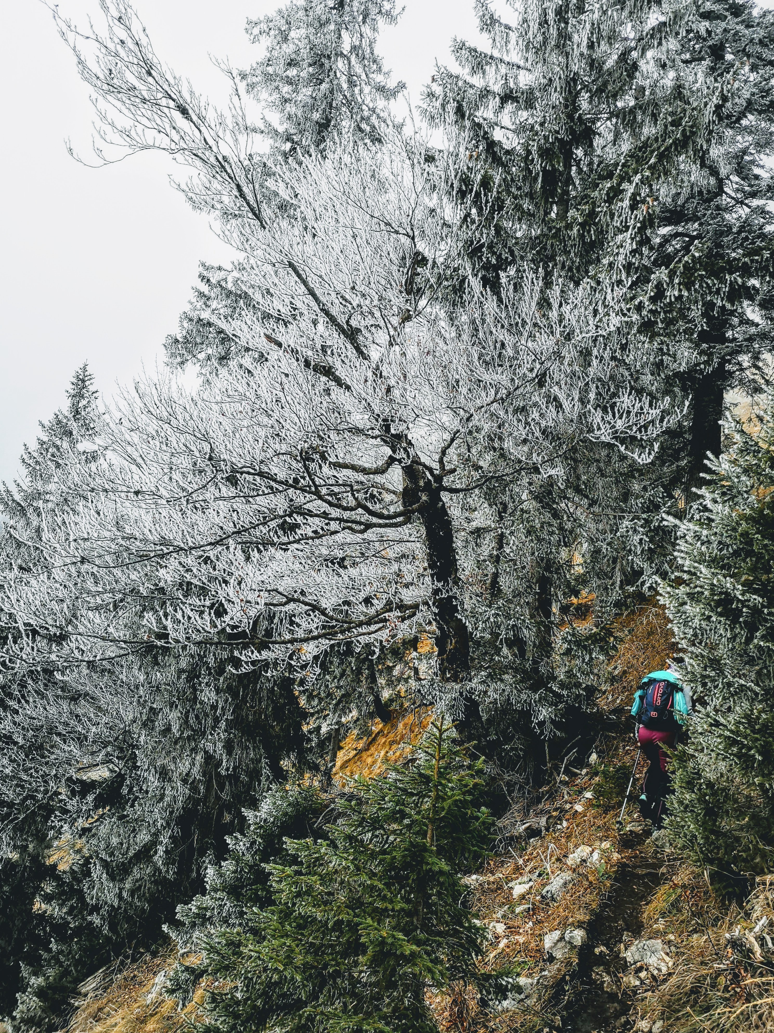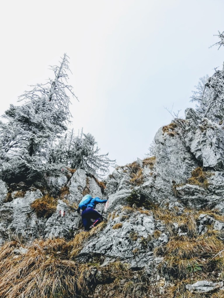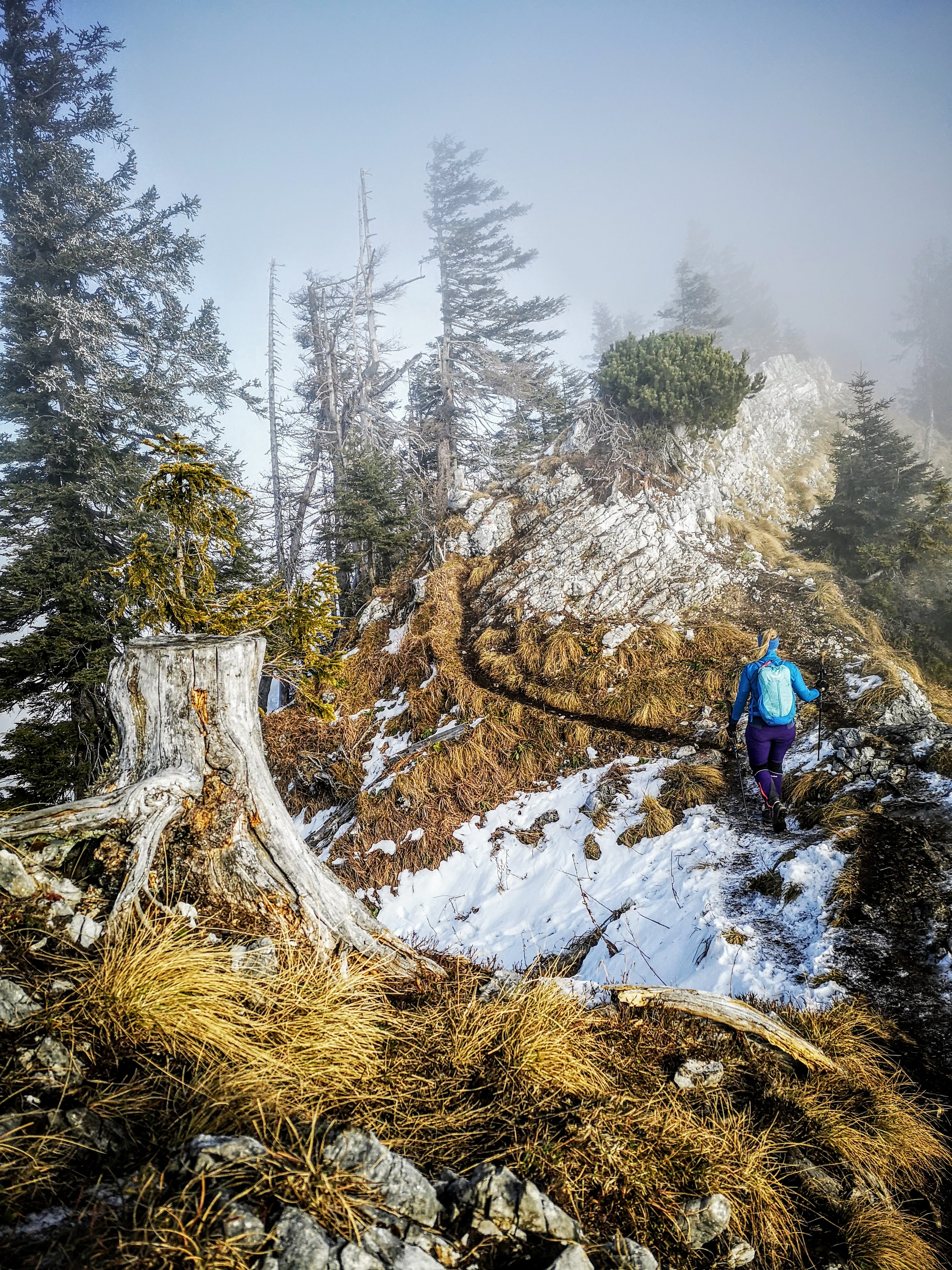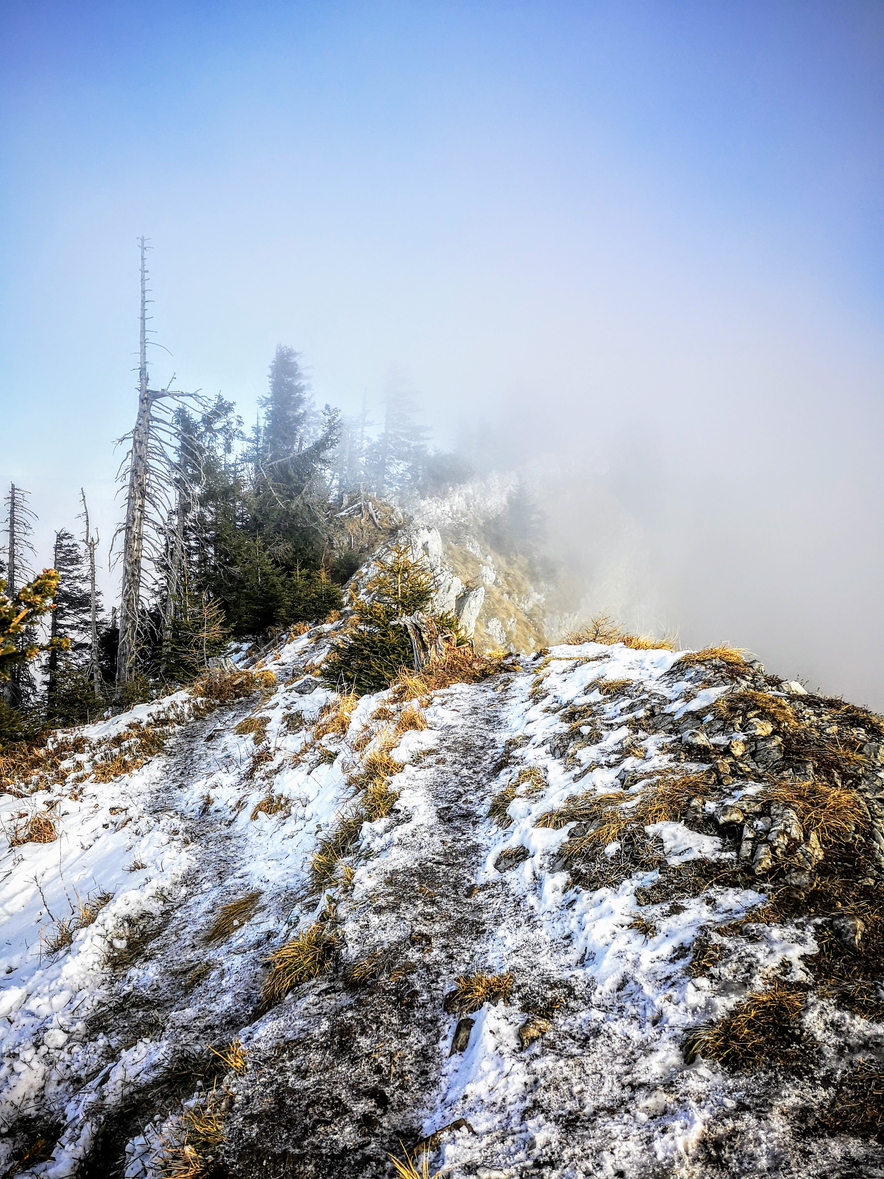 Danach wird’s steiler. Der Boden teilweise gefroren, Wurzeln mit einer dünnen Schicht Eis überzogen. Oder einfach nur mit Gatsch – rutscht genauso. Der Steig verschmälert sich und wird nach oben hin auch etwas anspruchsvoller. Kurze Felsstufen, bei denen die Hände verwendet werden dürfen, einzelne Stahl-Trittstifte. Immer wieder Windwurf, der zum kraxeln auffordert. Mal unter dem Baum durch, mal oben drüber oder doch seitlich vorbei? Alles dabei beim Mikado. Sogar eisige Passagen. Fad wird der Aufstieg dabei garantiert nicht. Das Gelände wird anspruchsvoller, je näher sich der Steig zum Grat nach oben schraubt. Die Stimmung ist eine ganz eigene, die Äste und Blätter vom Raureif überzogen, dichter Nebel immer wieder. Und Stille. Am letzten Sonntag im November. Bin i nu im Salzkammergut, oder schon in Mordor? Langsam wird es heller, erste blaue Fetzen am Himmel. Grelle Strahlen von der Seite – angekommen auf der Eibenbergschneid. Ein Grat, sie zu knechten. Ihr teilweise ausgesetzter und vereister Grat muss erst komplett überwunden werden, bevor das Gipfelkreuz in Sichtweite kommt. Höhenmeter macht man kaum noch, nur eine lange Querung. Kein Blick zurück, den dort wabern Nebelschwaden und verschlucken den Rest vom Grat…