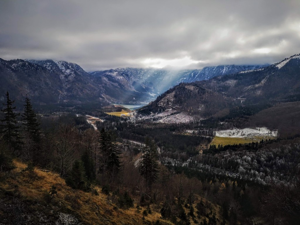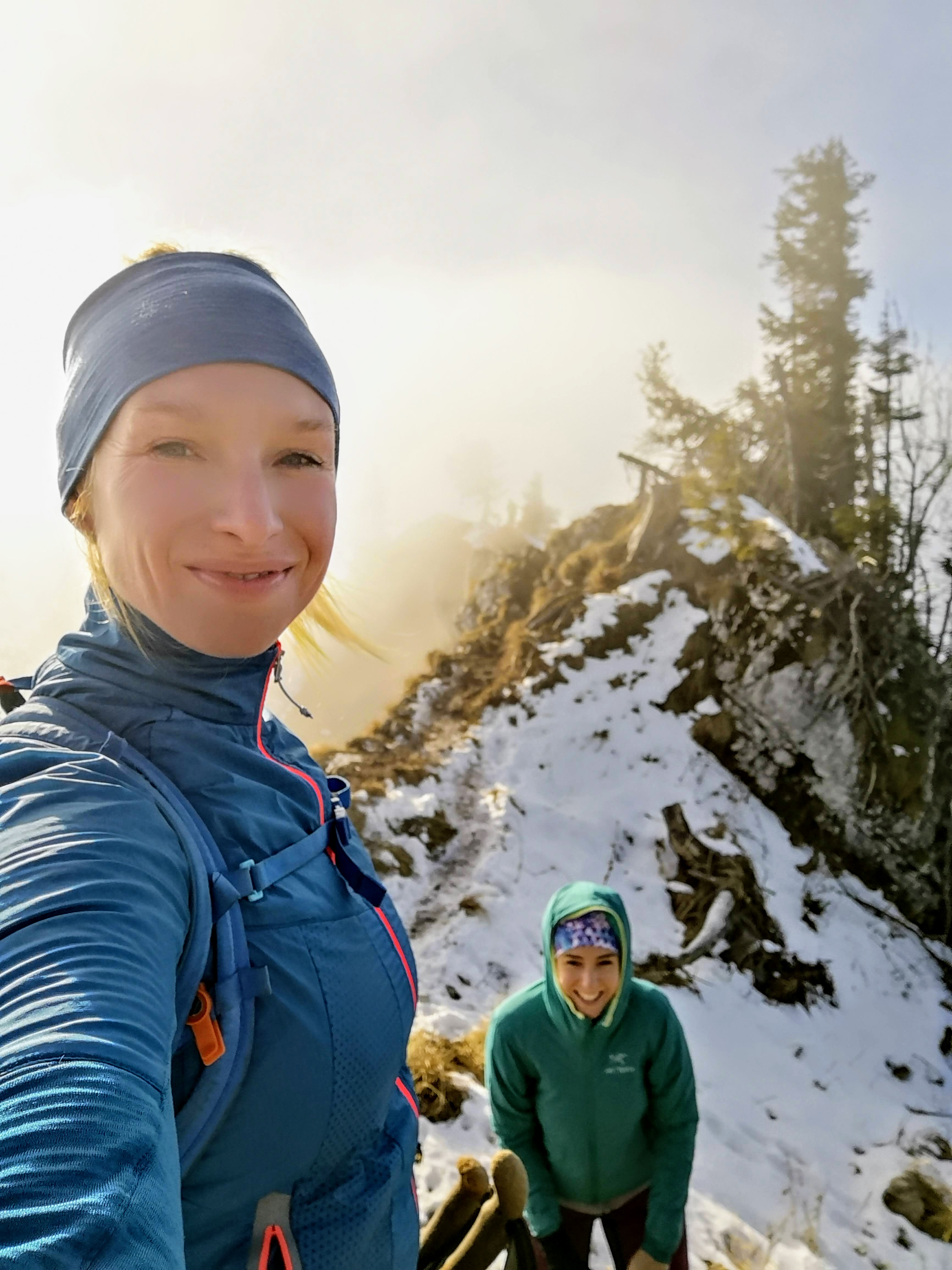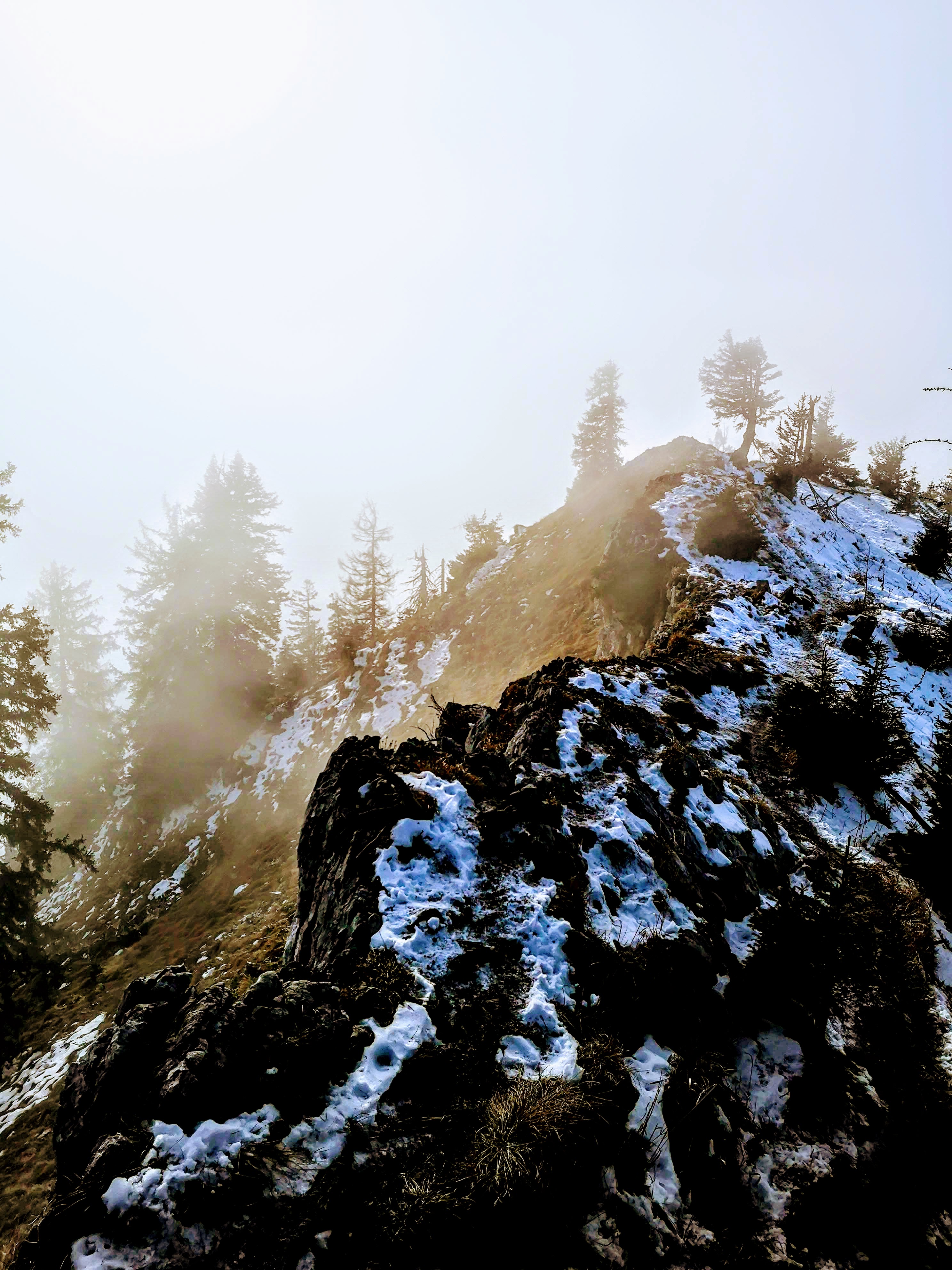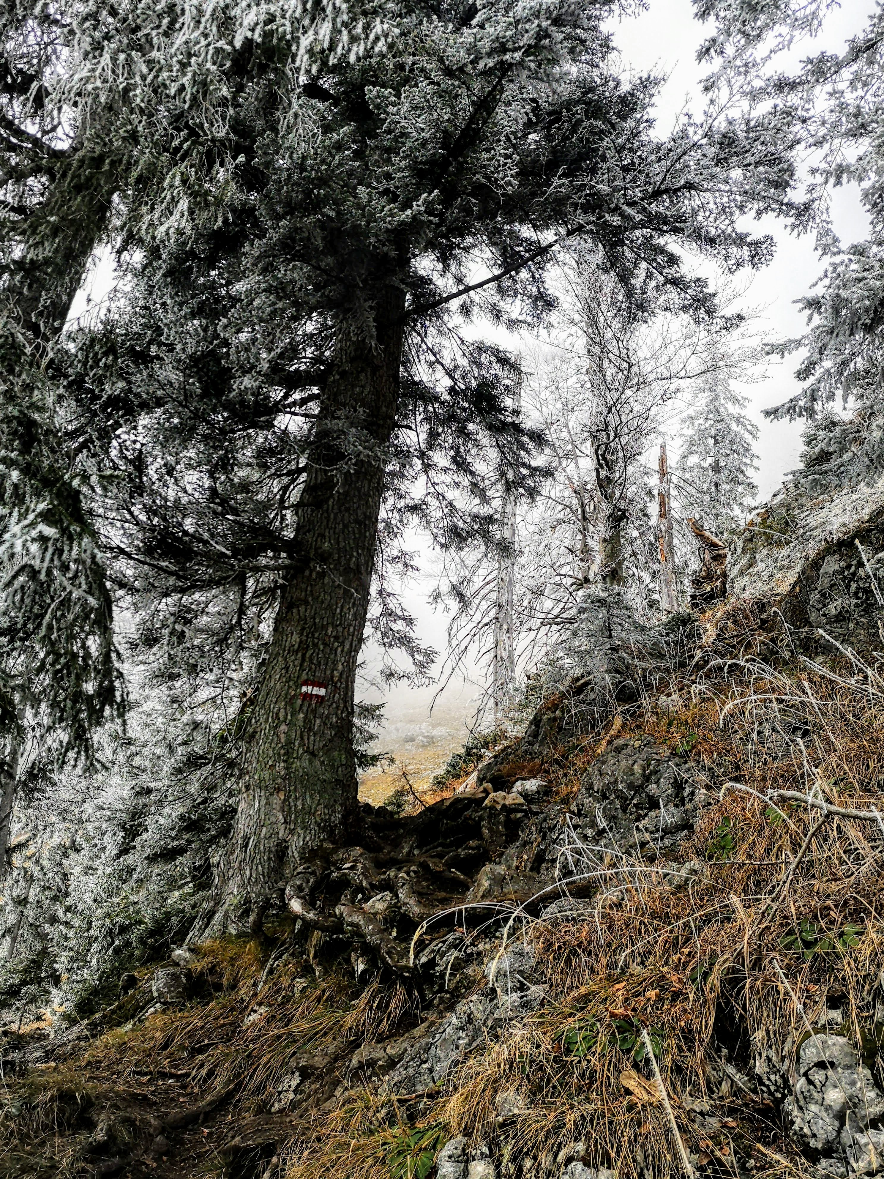 Danach wird’s steiler. Der Boden teilweise gefroren, Wurzeln mit einer dünnen Schicht Eis überzogen. Oder einfach nur mit Gatsch – rutscht genauso. Der Steig verschmälert sich und wird nach oben hin auch etwas anspruchsvoller. Kurze Felsstufen, bei denen die Hände verwendet werden dürfen, einzelne Stahl-Trittstifte. Immer wieder Windwurf, der zum kraxeln auffordert. Mal unter dem Baum durch, mal oben drüber oder doch seitlich vorbei? Alles dabei beim Mikado. Sogar eisige Passagen. Fad wird der Aufstieg dabei garantiert nicht. Das Gelände wird anspruchsvoller, je näher sich der Steig zum Grat nach oben schraubt. Die Stimmung ist eine ganz eigene, die Äste und Blätter vom Raureif überzogen, dichter Nebel immer wieder. Und Stille. Am letzten Sonntag im November. Bin i nu im Salzkammergut, oder schon in Mordor? Langsam wird es heller, erste blaue Fetzen am Himmel. Grelle Strahlen von der Seite – angekommen auf der Eibenbergschneid. Ein Grat, sie zu knechten. Ihr teilweise ausgesetzter und vereister Grat muss erst komplett überwunden werden, bevor das Gipfelkreuz in Sichtweite kommt. Höhenmeter macht man kaum noch, nur eine lange Querung. Kein Blick zurück, den dort wabern Nebelschwaden und verschlucken den Rest vom Grat…