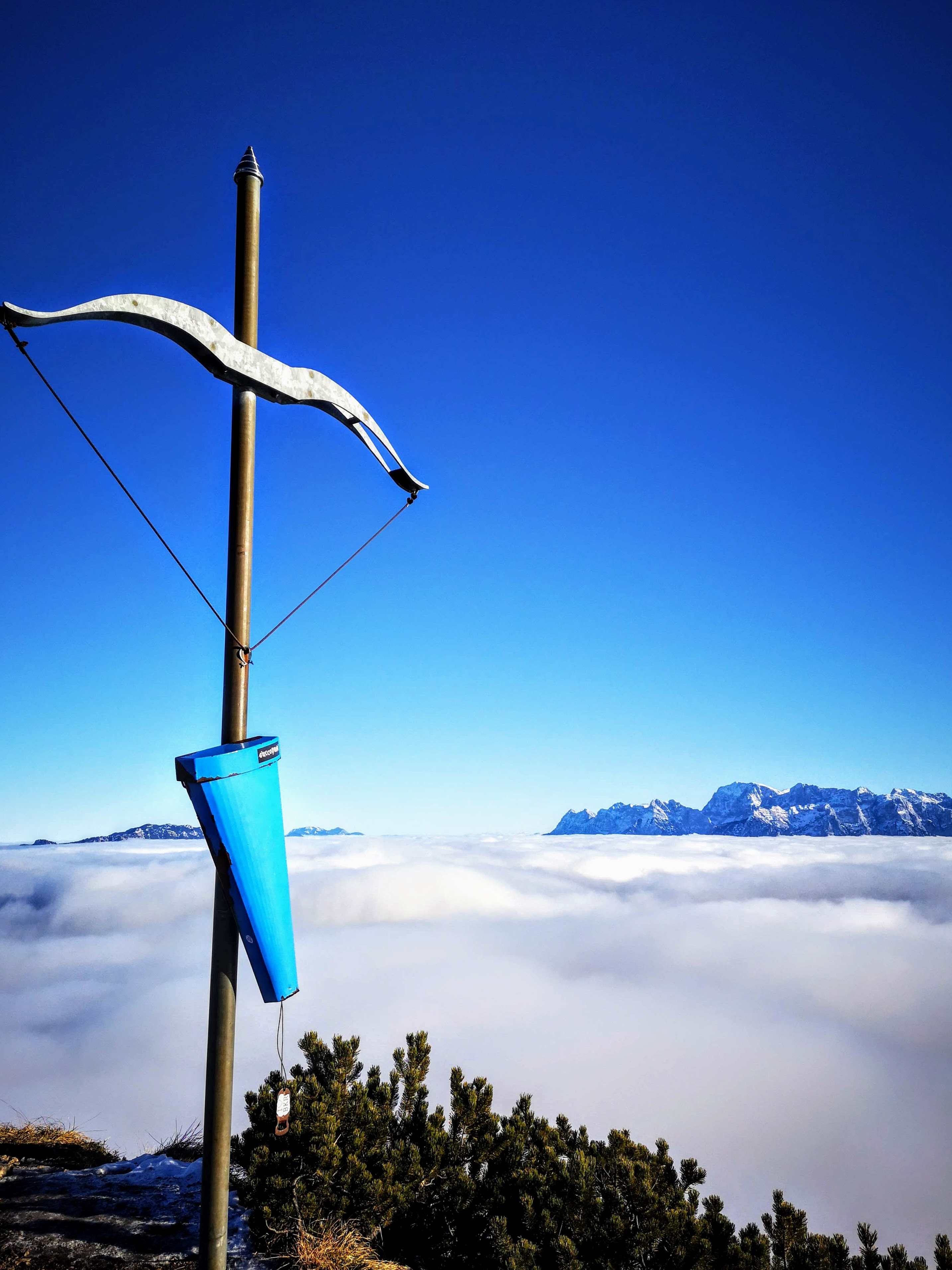 Auf dem von Latschen bedeckten Kamm (ohne Nebel) liegt links (Richtung NW) der Traunsee, rechts (Richtung SO) glitzert der Offensee herauf. Das Tote Gebirge, der Traunstein, Feuerkogel, Schafberg, Hohe Schrott,… ein gewaltiges Panorama. Eiben wachsen übrigens kaum mehr hier am Berg. Und dann: Pfeil und Bogen statt klassischem Kreuz. Amor hat allerdings nicht wirklich was damit zu tun, die Geschichte vom Gipfelkreuz am Eibenberg ist eine andere. Und auch die der Namensgebung ansich ist interessant…