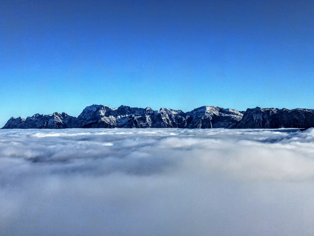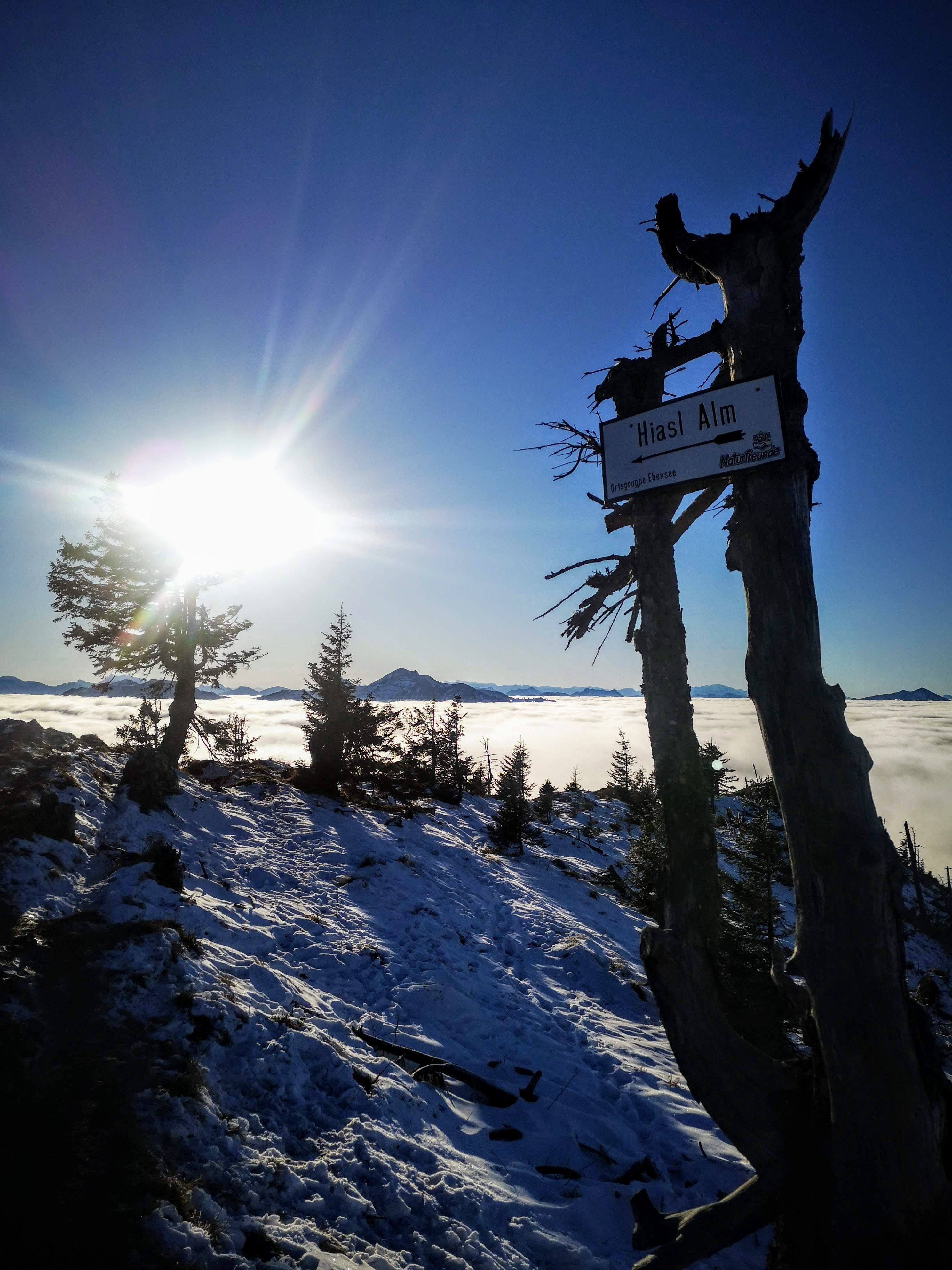 Ein Grat der über dem Nebel liegt – die Eibenbergschneid hoch über dem Offensee. Im Winter nur mit Vorsicht zu geniessen, bei Schneemangel eine anspruchsvolle Genusswanderung am schwarz markierten Steig ab Hiaslalm – schmal, teils ausgesetzt und vereist. Besonderes Gipfelkreuz inklusive (ca. 980hm & 8km)