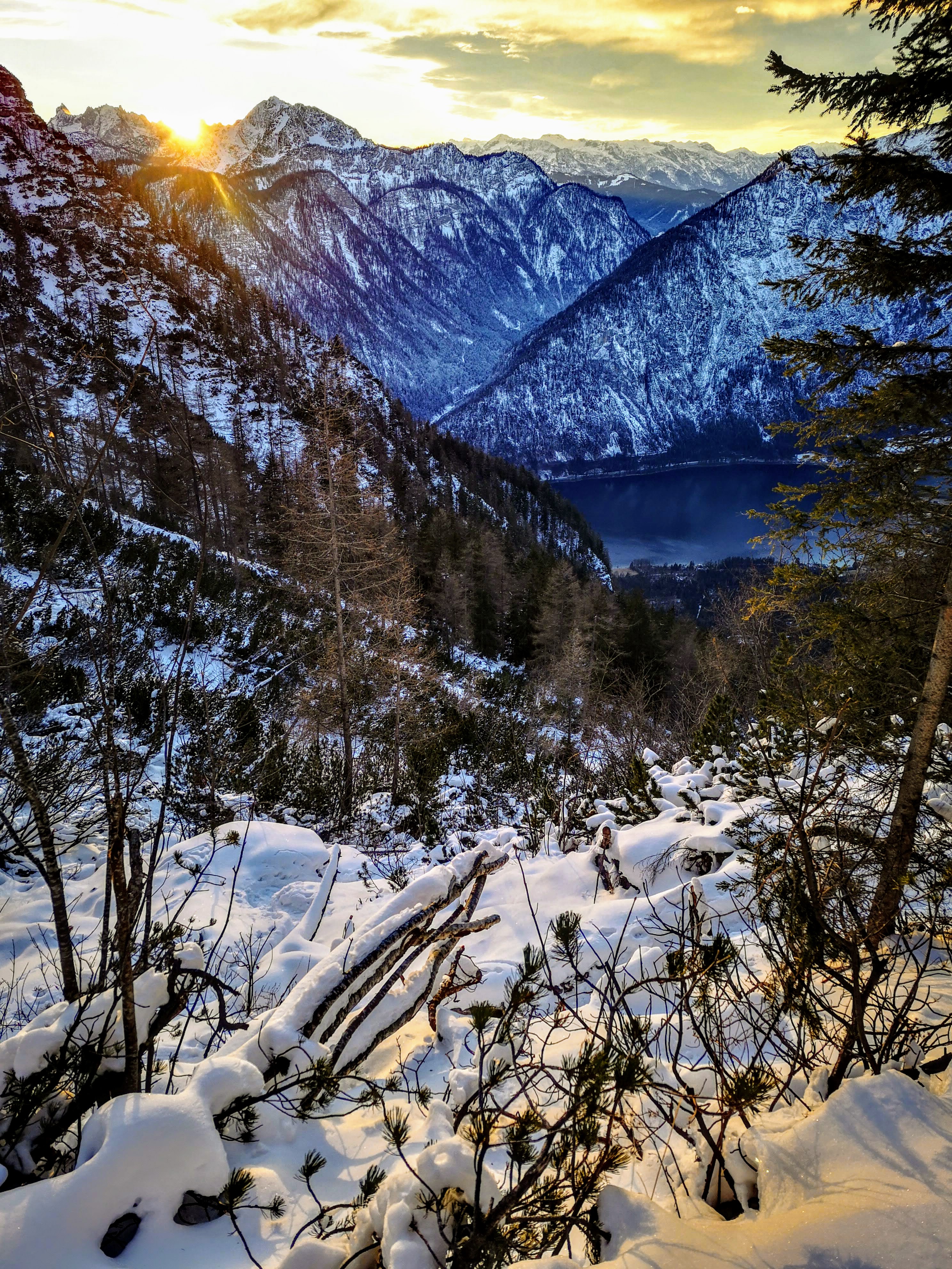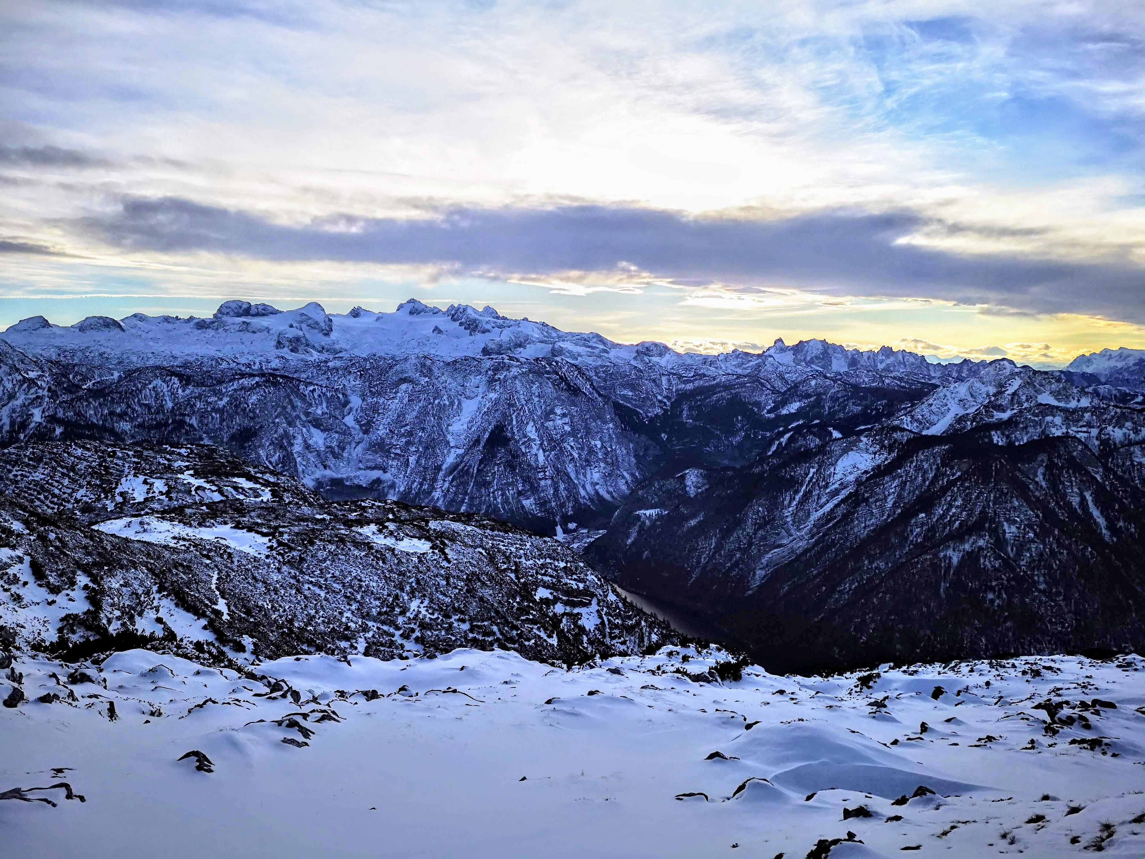 Die Aus- und Tiefblicke ins Salzkammergut vom Gipfel des Hohen Sarstein auf 1975m sind legendär. Höllengebirge, Totes Gebirge, Ausseerland, Dachstein, Gosaukamm, ins Tennengebirge im Salzburger Land,… Oben verläuft übrigens die Grenze zum steirischen Salzkammergut, dem Ausseerland (Steiermark). Es ist kalt, der Wind frischt auf – meine Jausenpause begrenzt sich deswegen auf 2 Becher heissen Ingwertee und a Semmal. Die Sonne zeigt sich nicht bzw kaum. Deswegen lieber an den Abstieg denken – immerhin muss ich die 1280hm auch wieder retour, meine Knie freuen sich. Nicht. Dass es sich mehr als lohnen sollte, zur rechten Zeit auf der vorderen Sarsteinalm zu sein – ein echtes Geschenk. Glitzernder Pulverschnee, Wintersonnenuntergangs-Himmel. Da brauchts keine Extra-Erklärung, a Stimmung zum niederknien. Das letzte Licht…