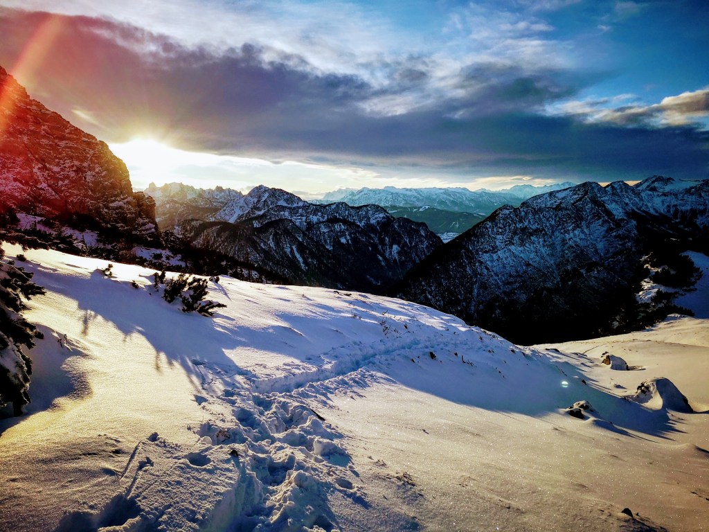 A wenn ma’s vielleicht nit direkt siagt – unterwegs sans trotzdem. Die Abdrücke von Reh, Schneehas- od Hendl kreuzen links und rechts den Aufstieg. Hab ma Zeit gnommen und bewusst hingschaut. Und deswegen a den Sonnenuntergang nit auf der Sarstoaalm komplett angschaut, sondern im Abstieg mitgnommen. Damit de Tiere, wenns dumper wird, zur Ruhe kommen kinnan. Besonders jez im Winter – a wenn es koa ausgewiesenes Ruhe- od Schutzgebiet is. Und i mit Einbruch der Dunkelheit ausm Wald draussen bin.