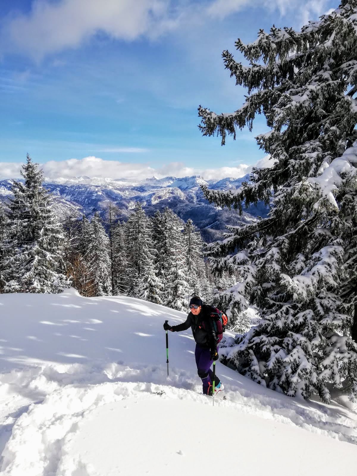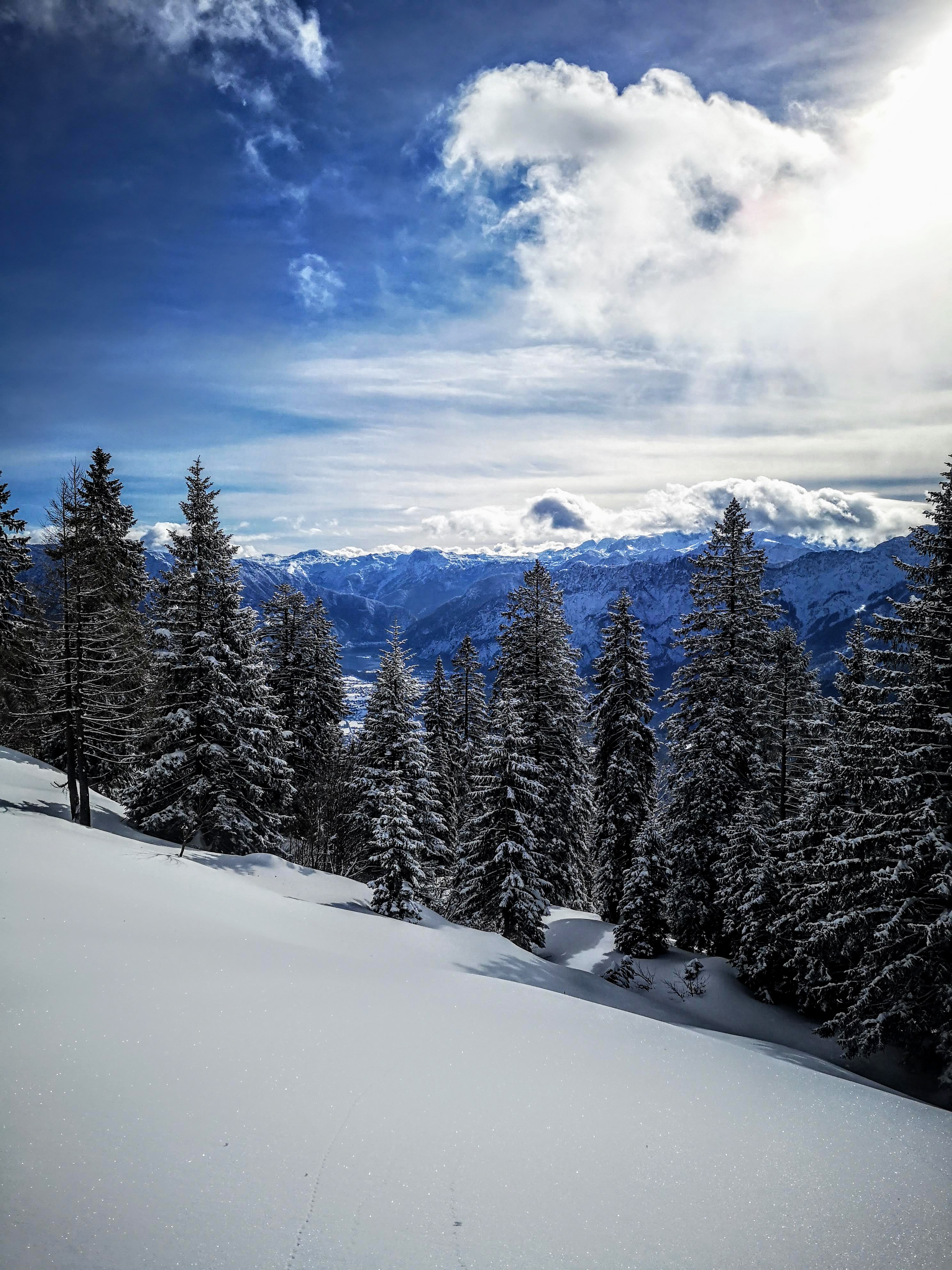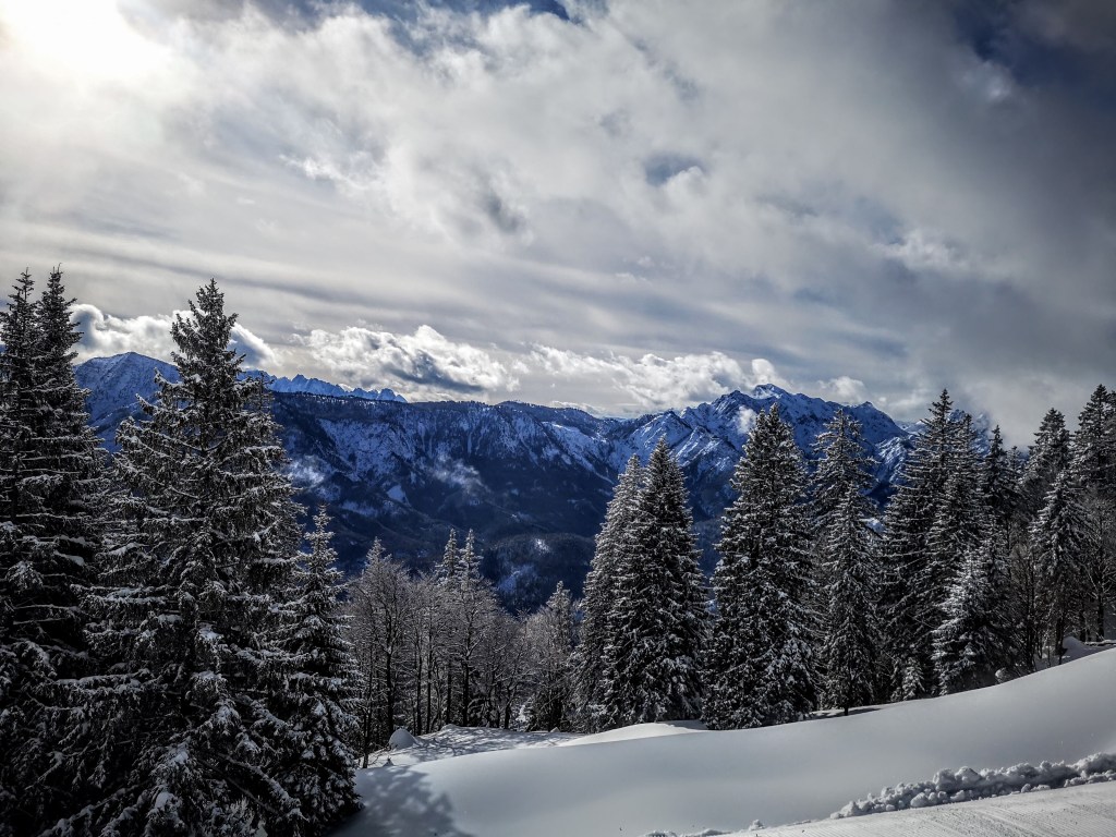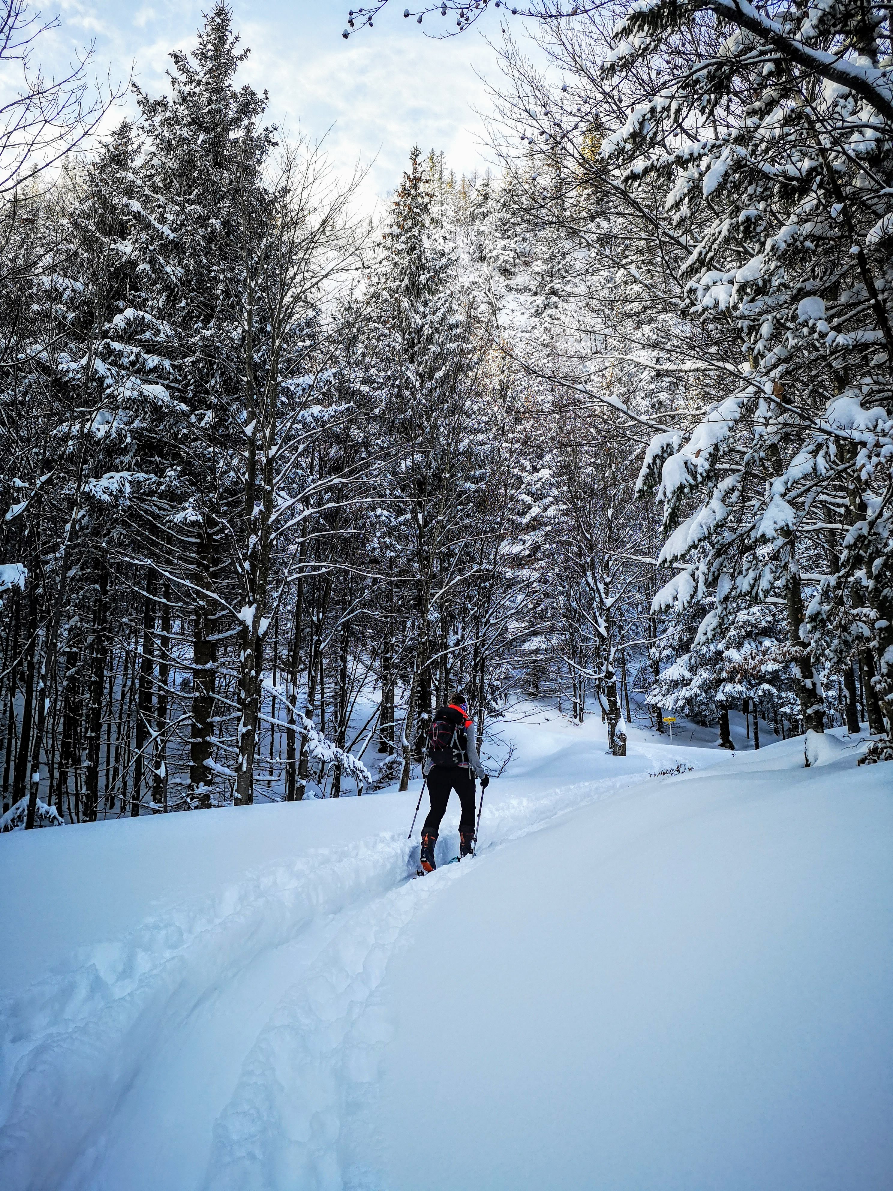 Wenns zwei Tage zuvor fett schneit und dann Sonnenschein in der Prognose auftaucht – Jackpot! Das viele andere den Wetterbericht auch im Auge gehabt haben, merkt man daran, dass an einem Mittwoch (!!) gegen 9 der Parkplatz an der Katrin Seilbahn in Bad Ischl schon gut voll ist. Kolonnen von Skitourengehern hirschen auf der alten, aufgelassenen und nur teilpräparierten Piste nach oben. Alle? Nein, ich garantiert nicht – da gibts schönere Varianten für den Aufstieg zur Katrinalm. Welche mit glitzernden Pulver, tief verschneiten Winterwunderwald und gewaltigen Panorama. Touren wie diese hier…