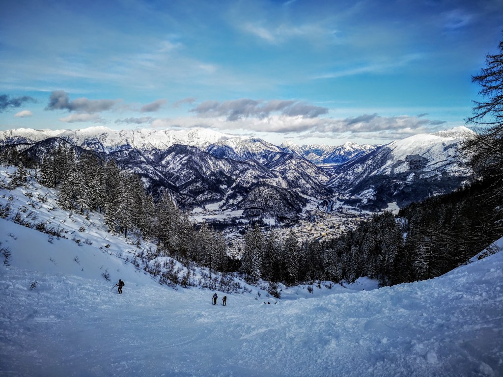 Und irgendwann muss man ja leider auch wieder runter in die Kaiserstadt. Die alte Piste mit Ischlblick – je später desto zerfahrener. Eisig sind Teilpassagen schon immer, da ändert sich auch heute nichts daran. Nur eine Spur ist vom Pistengerät bis nach oben hin präpariert, der Rest komplett sich selbst überlassen. Hier wären jetzt einige sichtlich froh um Harscheisen unter den Tourenski (im Aufstieg natürlich). Während meine Begleitung juchzend durch die letzten Pulverreste pflügt, schau ich ehrlich gesagt einfach nur, gut unten an zu kommen. Bei den vielen Leuten im Aufstieg (auch gerne mal zu dritt nebeneinander – zum Glück aber mehr die Ausnahme als die Regel) hält sich meine Begeisterung stark in Grenzen. Aber mei, dafür war unsere Tourenvariante viel zu schön, als darüber mehr als einen Gedanken zu verschwenden… oder?