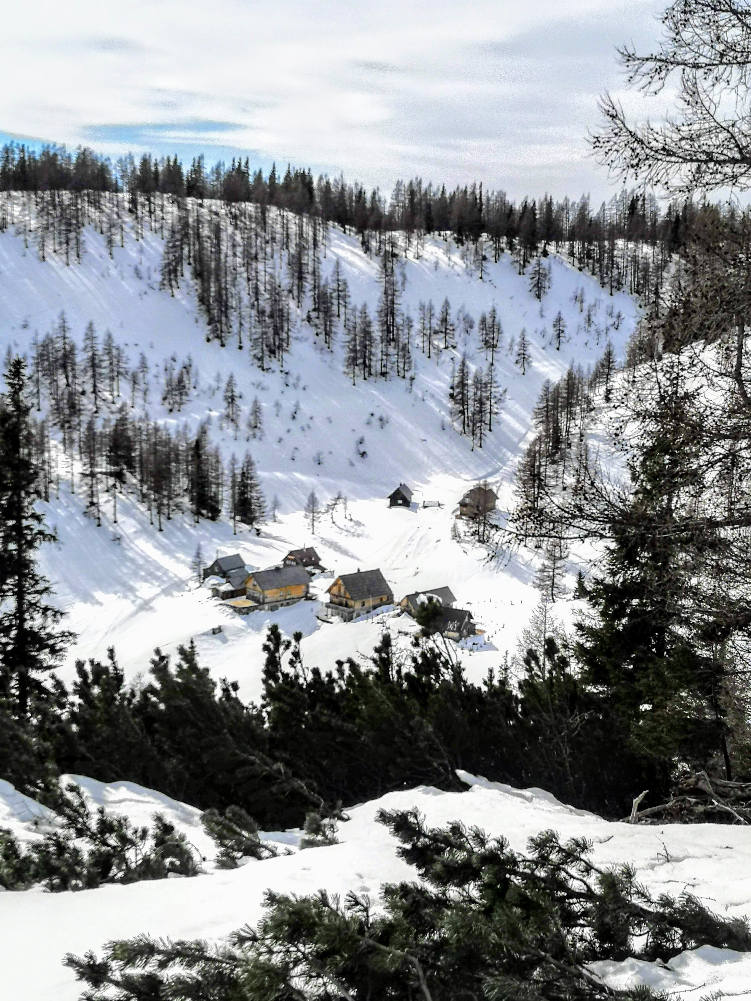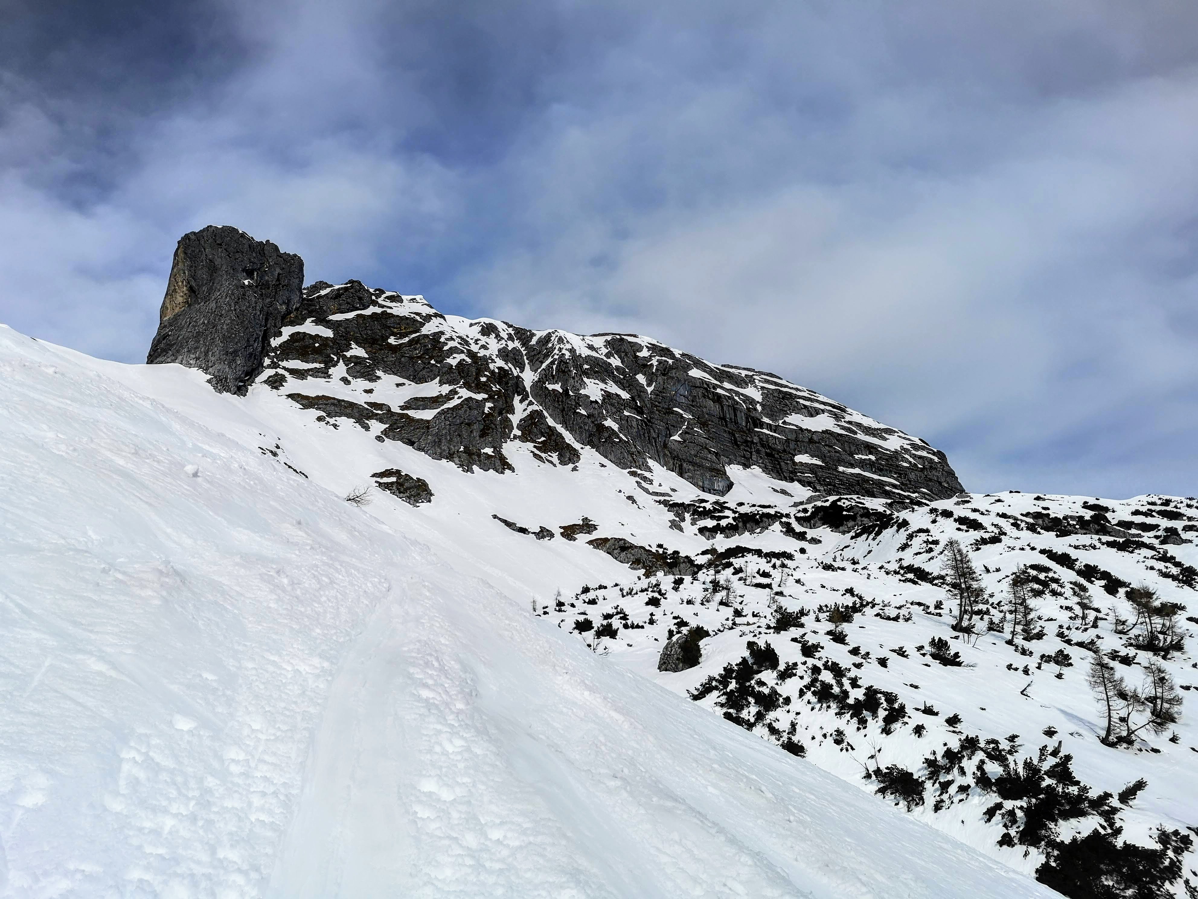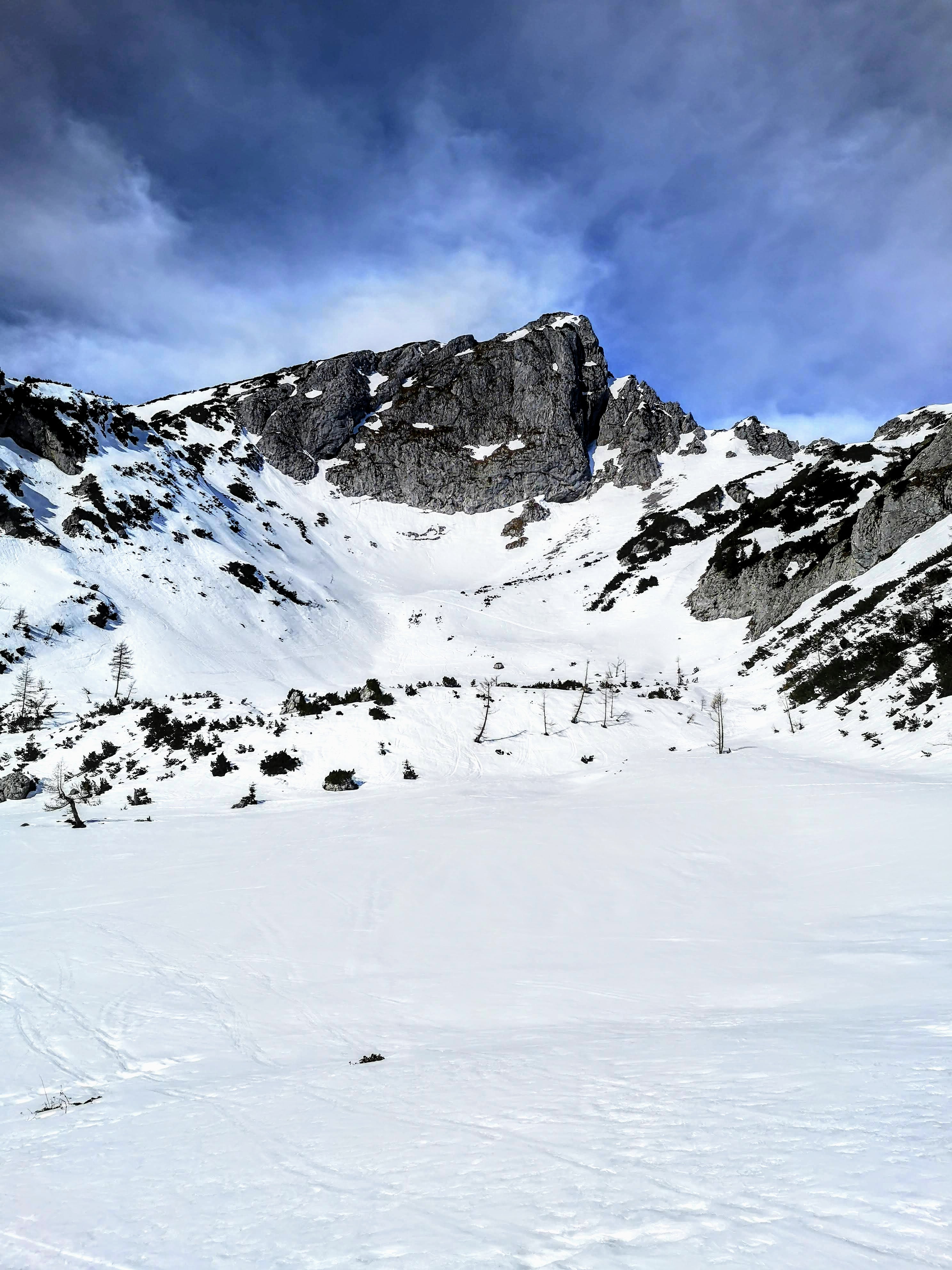 Die Hütten und der See tief verschneit, das Bankerl oberhalb kaum zu sehen. Für die kurze Abfahrt runter wird abgefellt, nur um unten dann für den weiteren Aufstieg wieder aufzufellen… Immer weiter. Den Steirersee im Blick. Auf dem Weg zum Jungbauernkreuz schlägt das Wetter plötzlich um. Sturzhahn 2028m im Blick. Mausgrau statt fetzblau. Eisiger Wind frischt auf und passend dazu geht mein Körper in den Streik. Die Schulter schmerzt, die rechte Hand schwillt vom Sturz merklich im Handschuh an und quittiert beleidigt den Dienst – Stockeinsatz im Aufstieg nur mehr als mühsam machbar. Deswegen gibt es nur eine richtige Entscheidung für mich: umdrehen und a anderes Mal auffi zum Tragl. Abfahren, unten bei den Steirerseehütten a Pauserl mit an Jauserl einlegen, neue Tourenziele studieren, anderen bei Spitzkehren anlegen ri Traweng bzw Steirertor zuschauen und dann gemütlich retour gehen. Und spätestens dann kommt wieder die Sonne raus – wie immer…