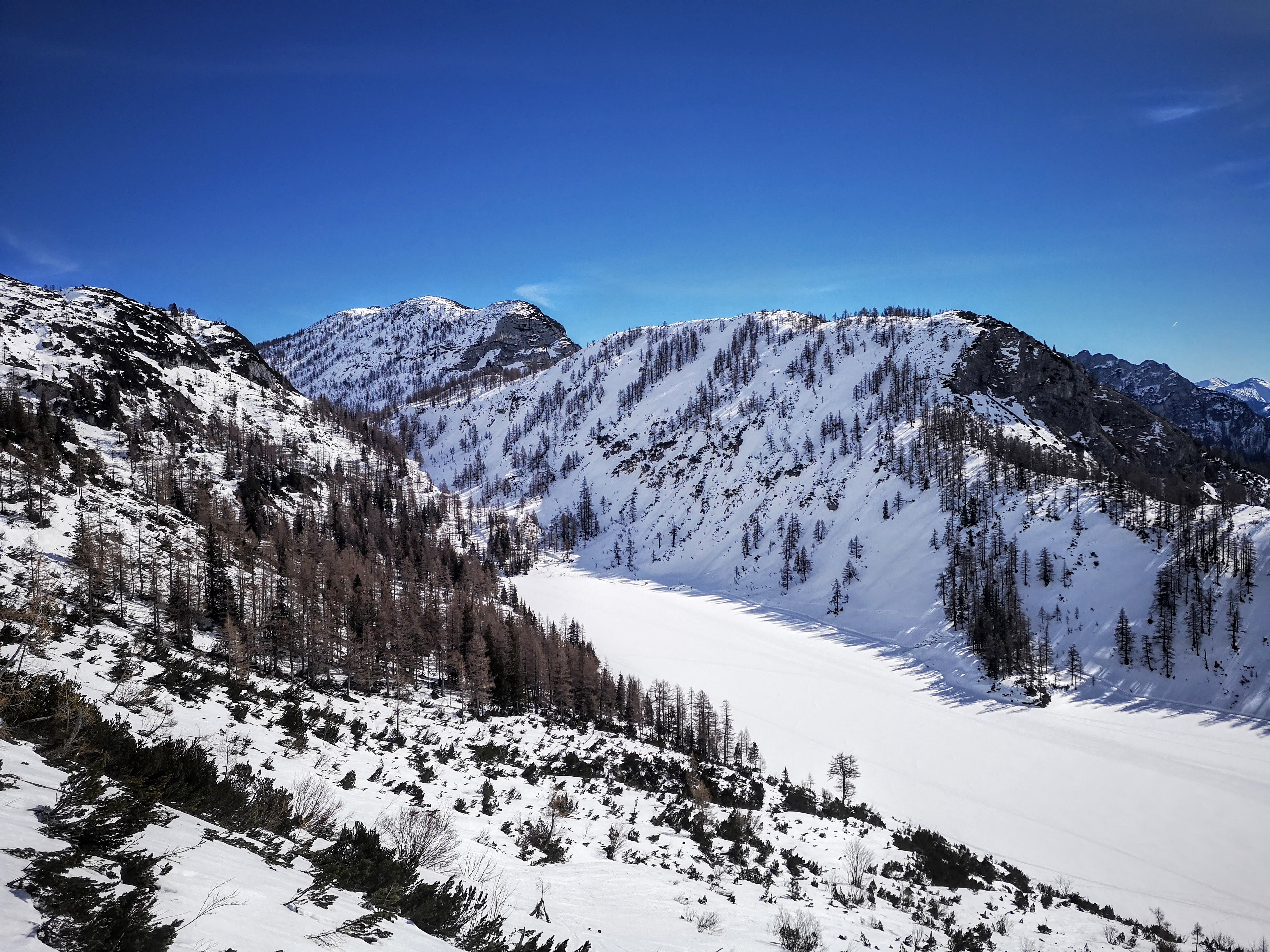 A kleines Malheur im Zustieg bzw beim queren des Plateaus. Nur einen kurzer Moment nicht konzentriert oder aufgepasst. Und dann fliegt man bevor man liegt dann… Nur eine kurze Passage zum Abrutschen mit den Fellen, der Schnee weich, die Sonne blendet. Ein tiefes Schneeschuh-Loch – exakt eingespitzelt. Rechte Hand und Schulter werden hart abgefangen, bevor Lippe und Wangen ausgiebig beim bergab rutschen mit dem Bruchharsch schmusen. Bravo. An dem Punkt hätte ich mir einfach schon denken sollen, a Runde um den Steirersee sollt reichen… Aber weil des anfangs nicht so schlimm is wie es ausschaut, setze ich die Tour fort.