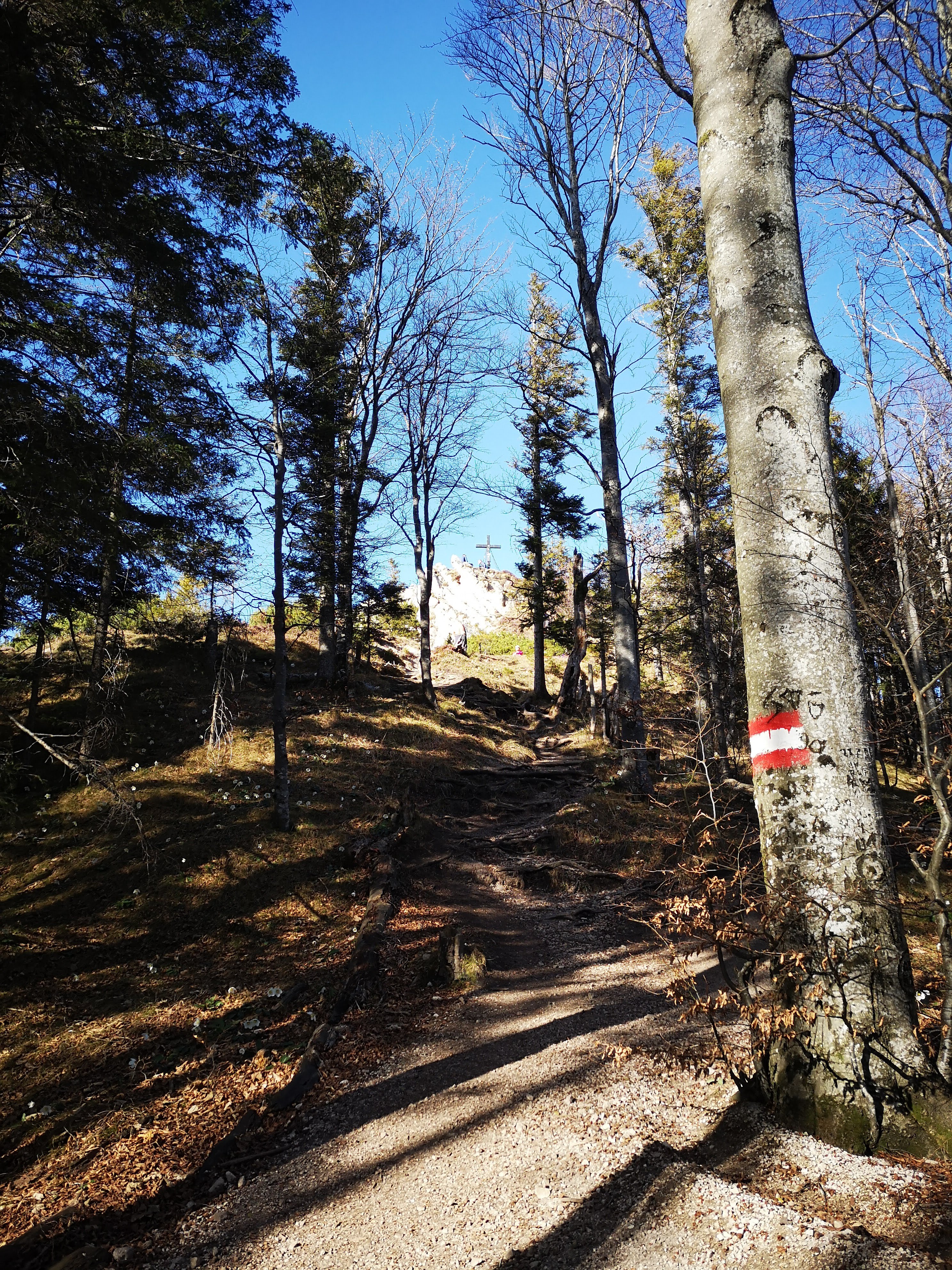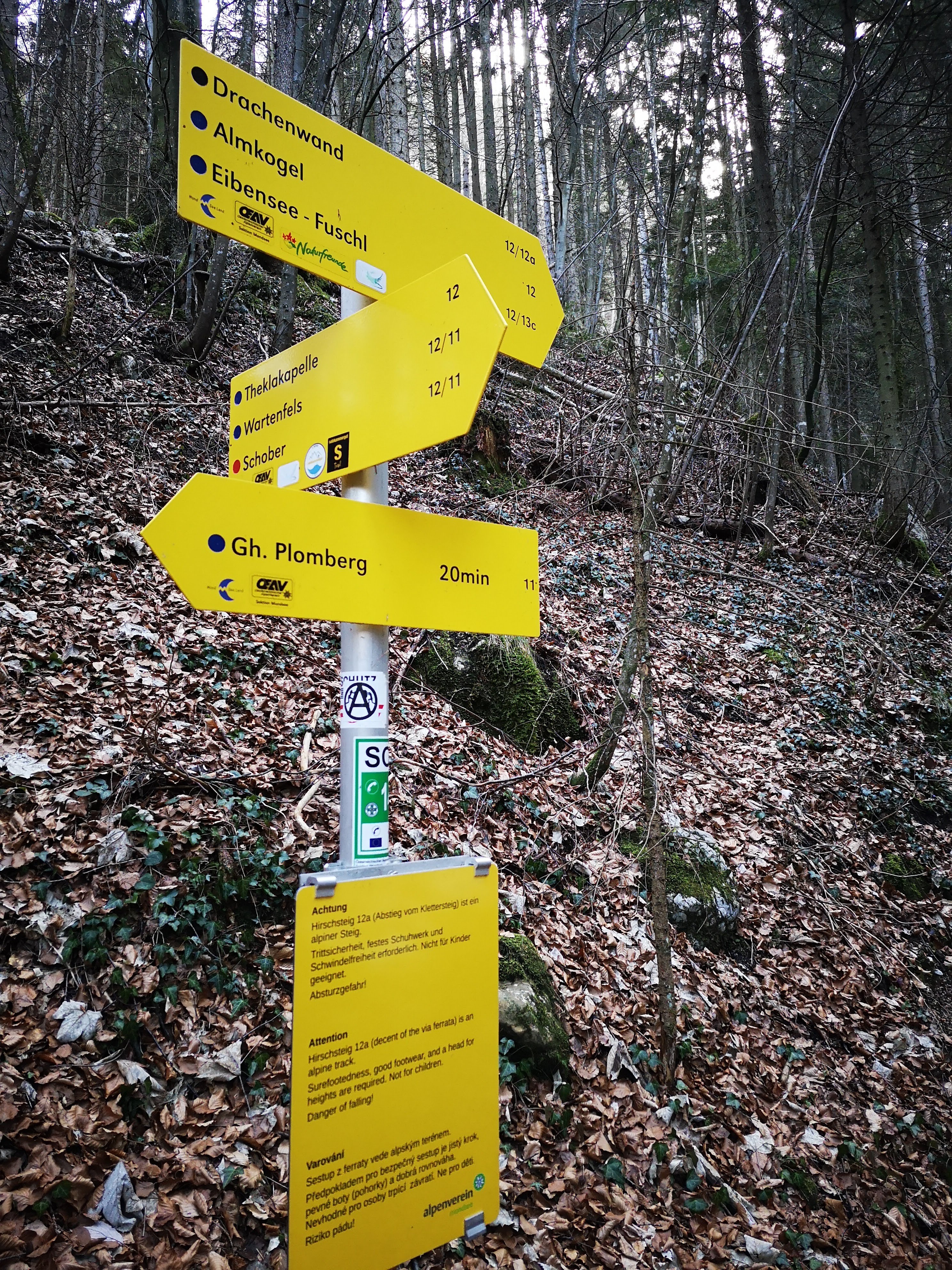 Die Sonne scheint, die Vögel zwitschern – es ist warm. Viel zu warm für Ende Februar. Kurze Hose, Shirt – vollkommen ausreichend an diesem Tag. Saharastaub sei Dank! Für den Start fahre ich nach Plomberg, parke das Auto neben dem See und gehe dann gute 5 Minuten retour bis zur Bushaltestelle (bei Treml Punsch). Daneben steht das ehem. Gasthaus Plomberg. Die private Zufahrt endet in einem kleinen Spazierweg (Nr. 11), der oberhalb des Sees Richtung Theklakapelle in den Wald führt. Wird diese rechts neben der Brücke sichtbar, ist man schon fast an der Abzweigung zum Almkogel (Nr. 12) – gut beschildert geht’s links nach oben. Zur Drachenwand würde man geradeaus bzw leicht rechts weiter gehen.