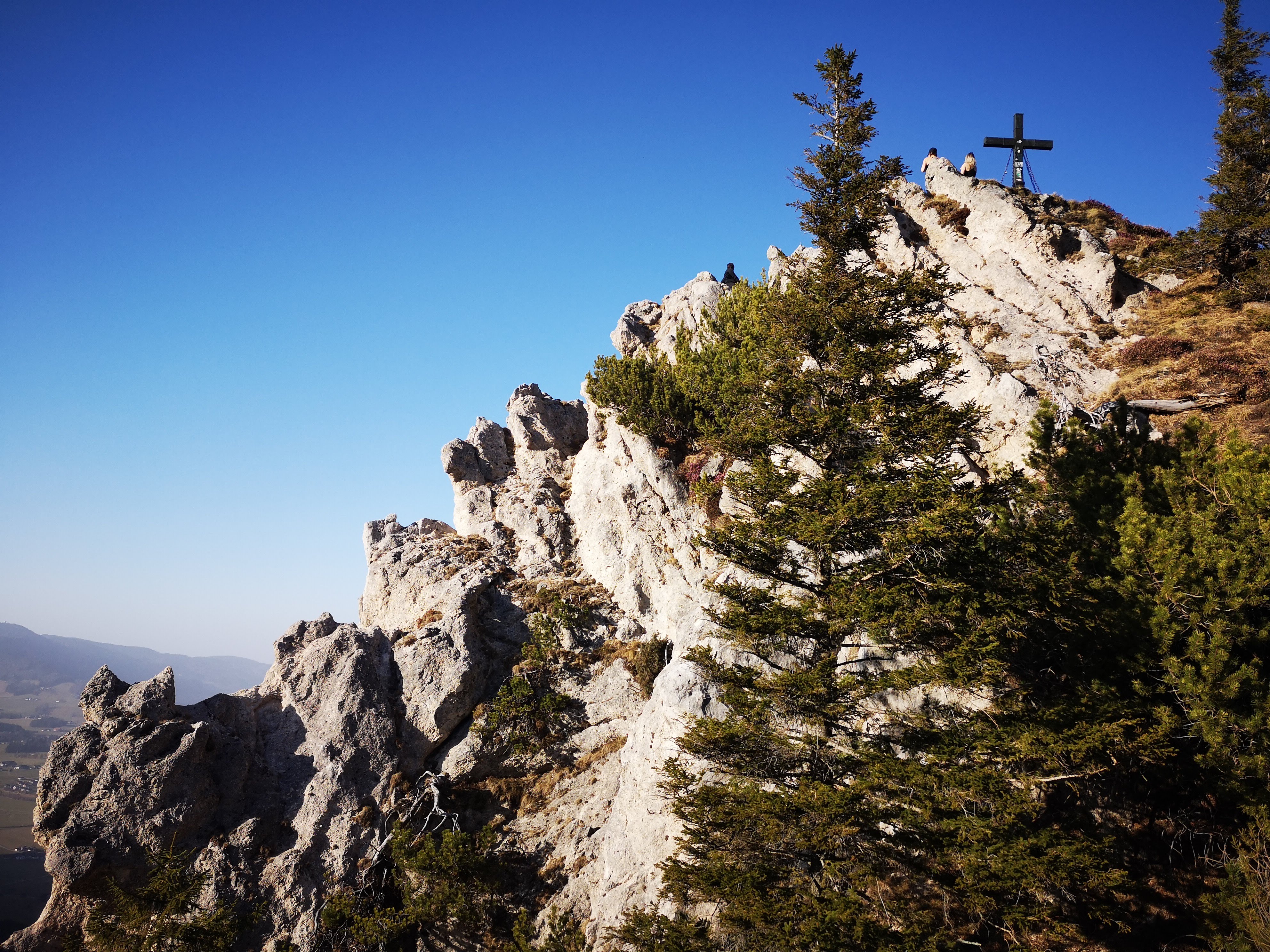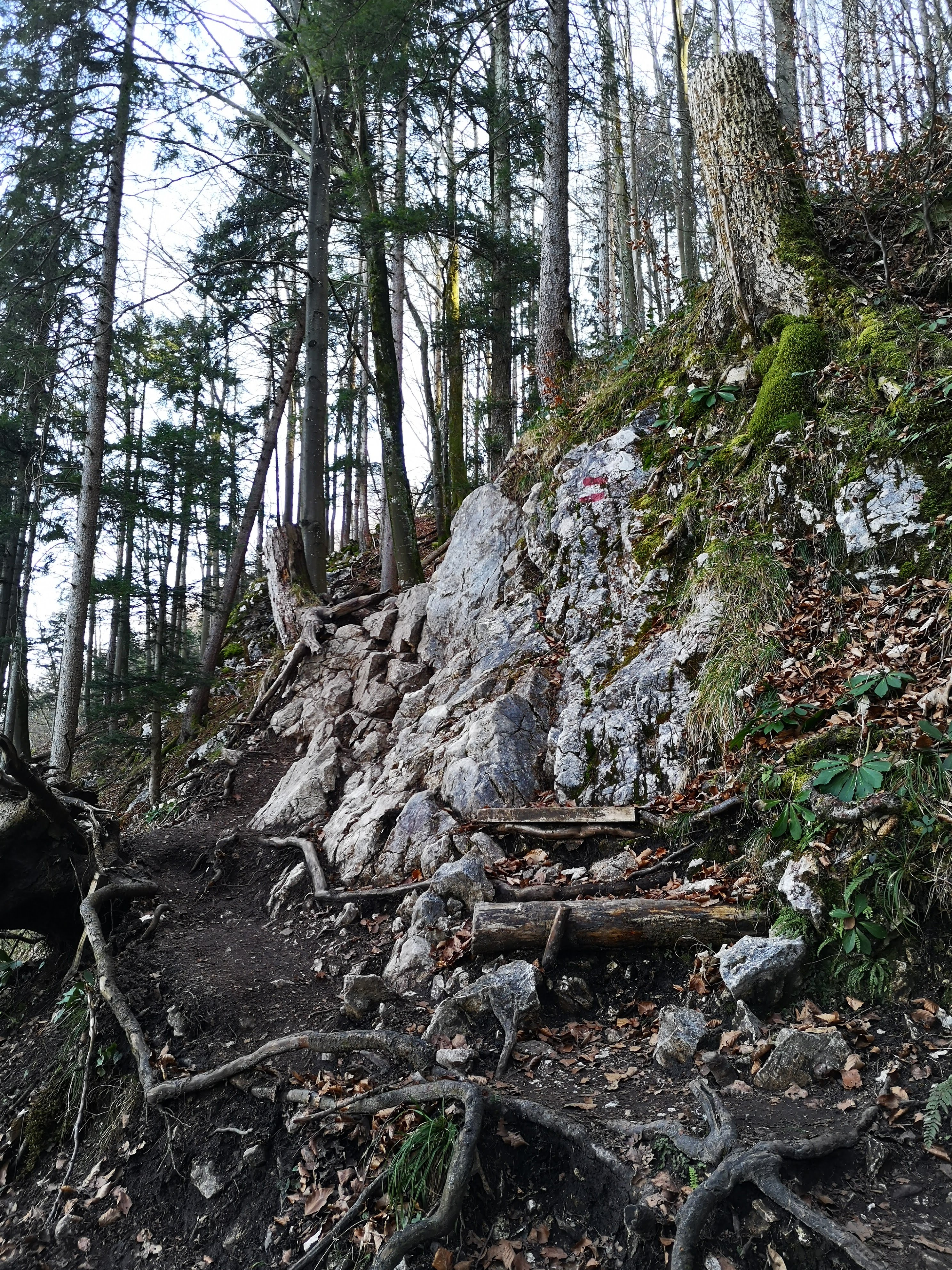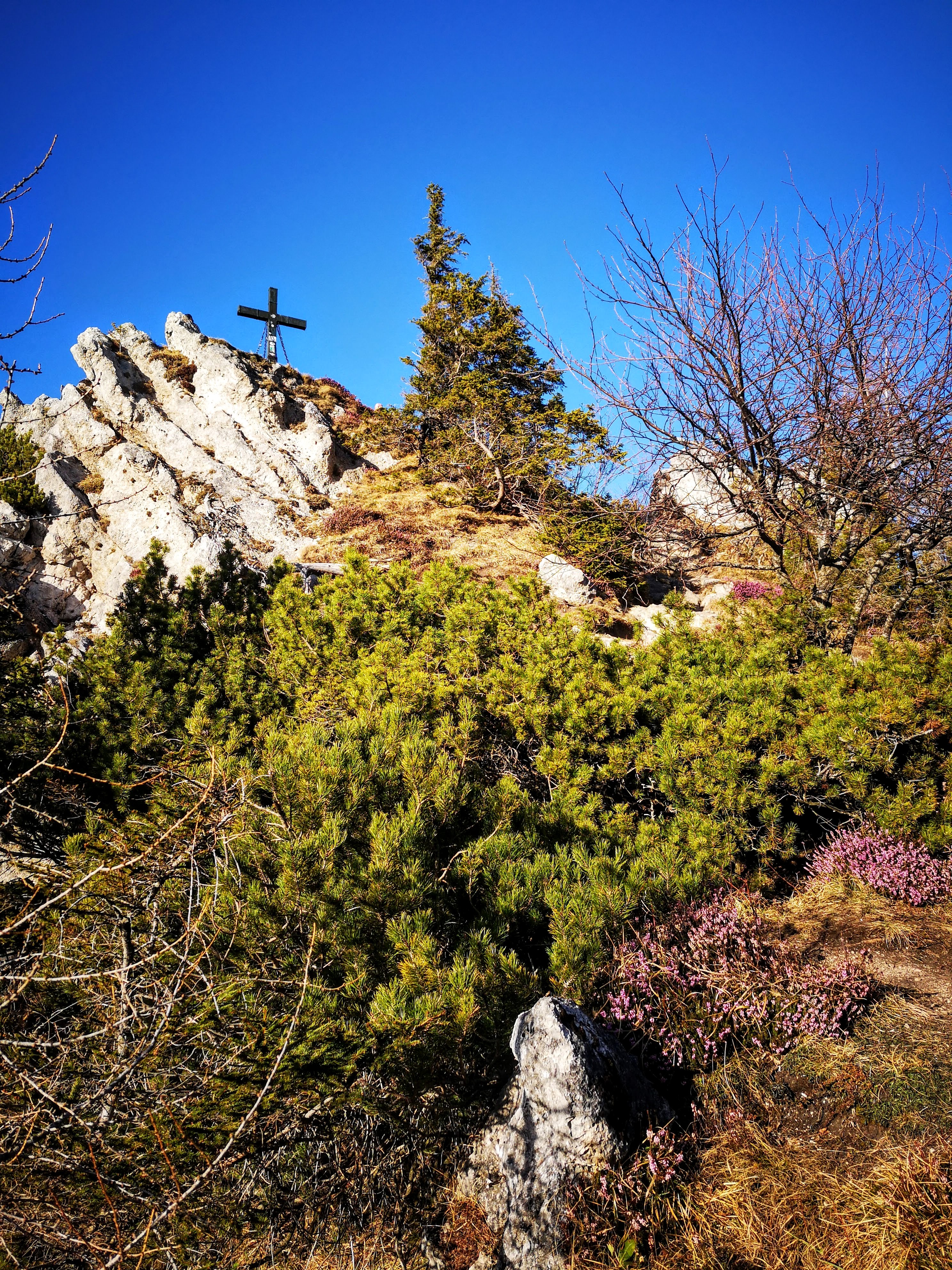 Durch ein Meer aus Schneerosen gehts im Wald serpentinenartig und kaum ausgesetzt nach oben. So extrem viele dieser wunderbaren Frühlingsboten habe ich selten gesehen. Wunderschön! Der Weg ist schmal, wurzelig und nässebedingt ziemlich gatschig stellenweise. Eine kurze Schrofenstufe, ein paar querliegende Bäume (nicht nur aus diesem Winter). Ab und zu mal umdrehen lohnt sich – die Drachenwand ragt steil empor! Rechts von einem (aktuell trockenen) Bachgraben geht es nach einer kurzen Querung in steilen Serpentinen bis zu einem Sattel hinauf. Spitze Felsformationen ziehen meinen Blick wie magisch an und auch der Gipfel lässt sich ausmachen. Links vor dem Gipfelaufschwung wartet eine gestufte Rinne, danach flach über Schrofen zum schönen Kreuz. Sogar da Sendl (Erika) blüht hier heroben schon im schönsten Pink!