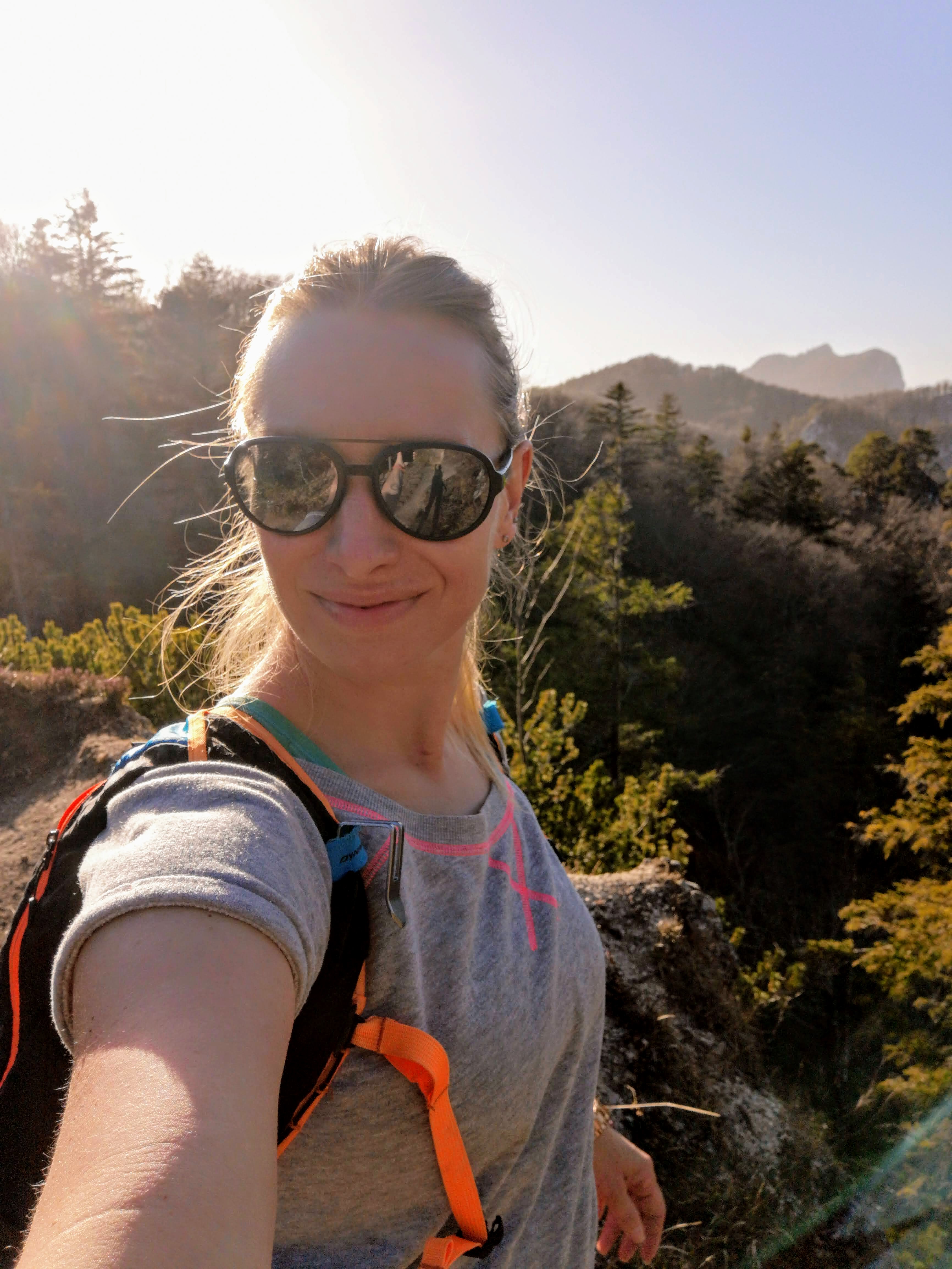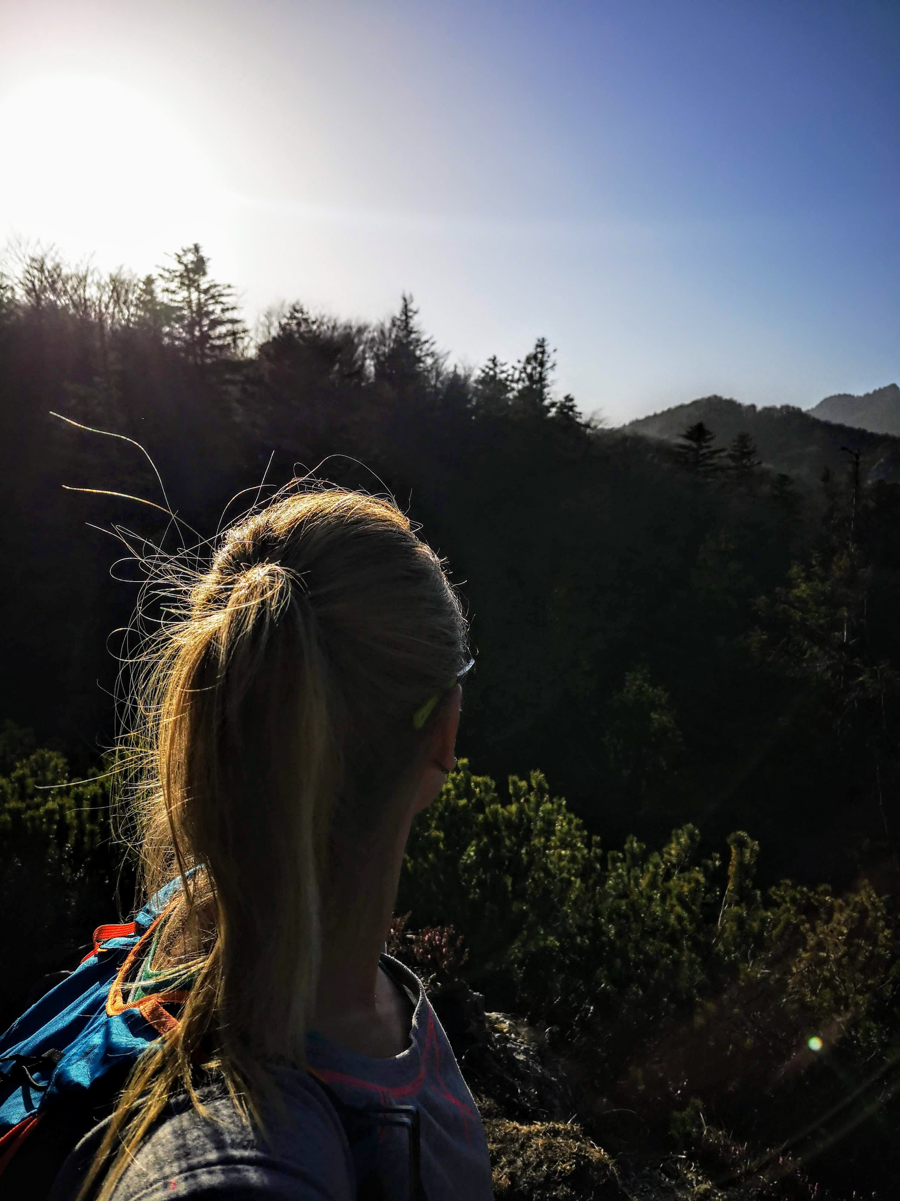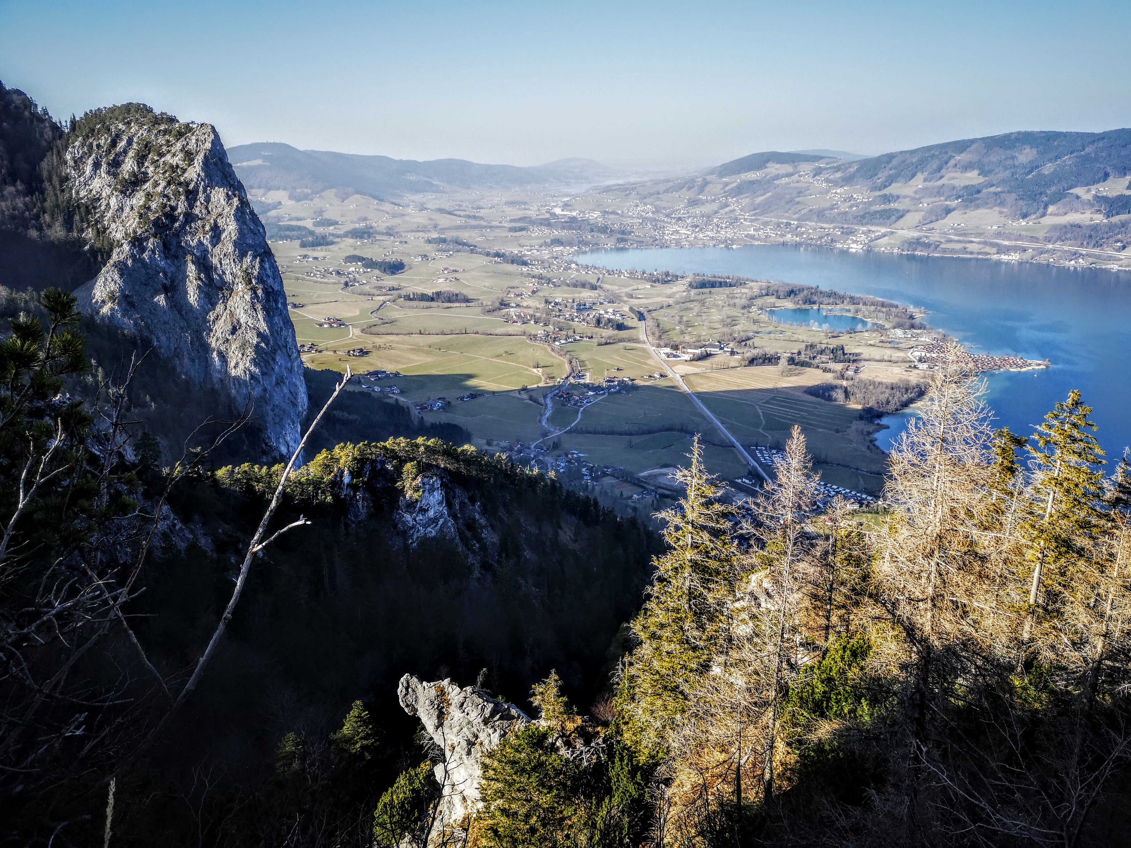 Von oben hat man nicht nur das gesamte Mondseeland und natürlich den Mondsee zu Füssen – ein Blick rüber ins Salzburgerland, zum Schafberg und sogar auf der Wolfgangsee spitzelt blau hervor. Salzkammergut Liebe. Das obligatorische Gipfelbild mit Kreuz und Mondsee gibt’s nicht. Zuviele Leute, zu wenig Platz. Aber mei! Die Drachenwand winkt von gegenüber – zu dem Zeitpunkt ist der Klettersteig noch in der Wintersperre (seit April wieder offen), keiner hängt am Fels. Beim Abstieg hat man die steile Wand stellenweise besonders gut im Blick!