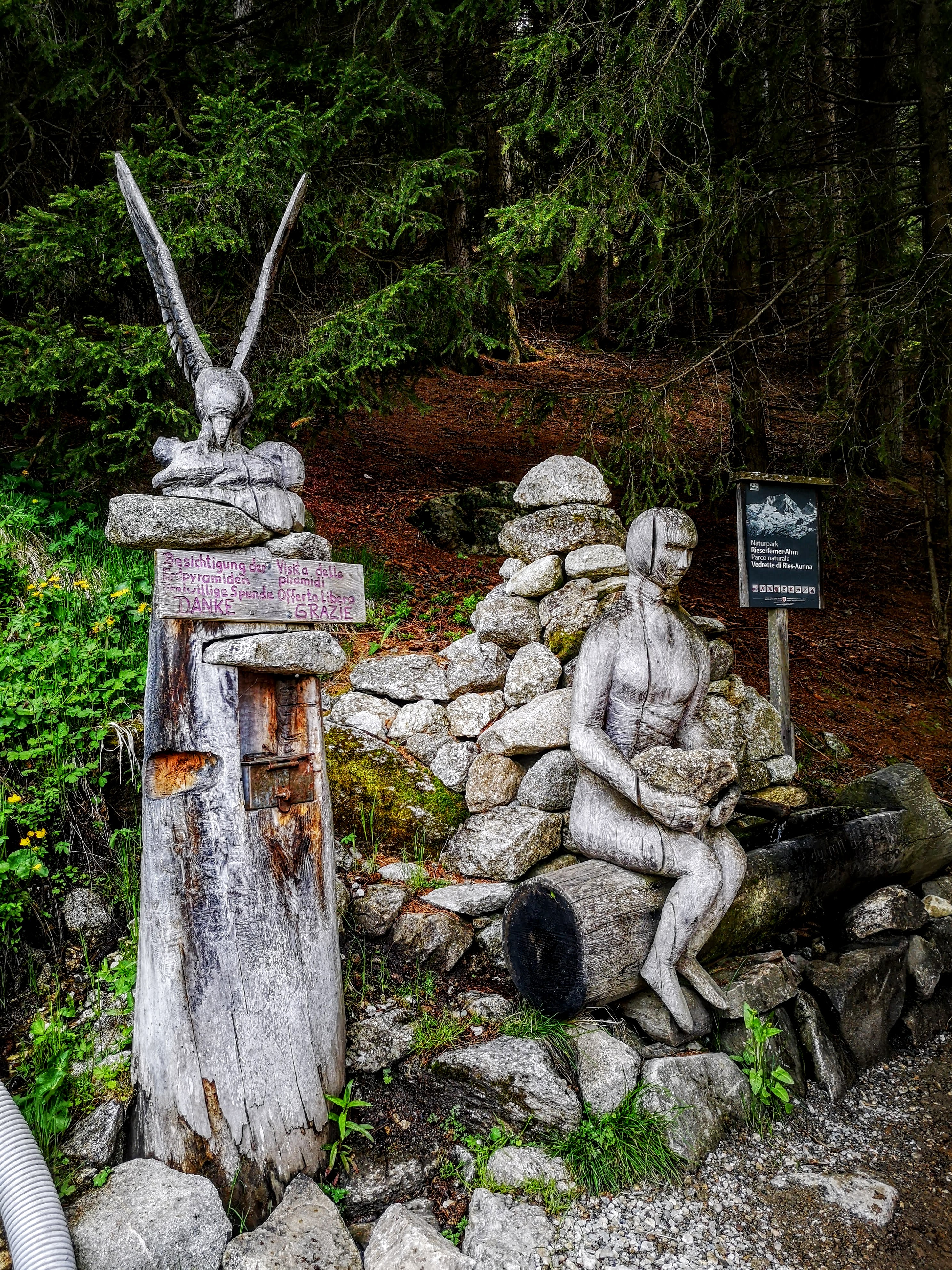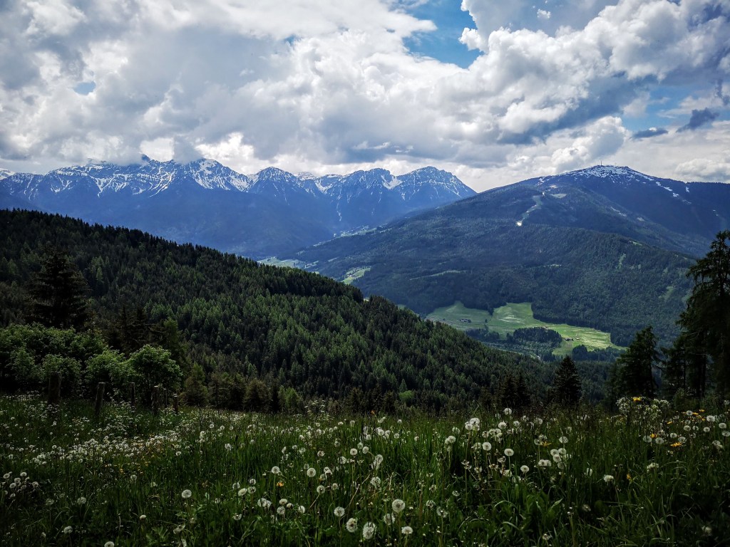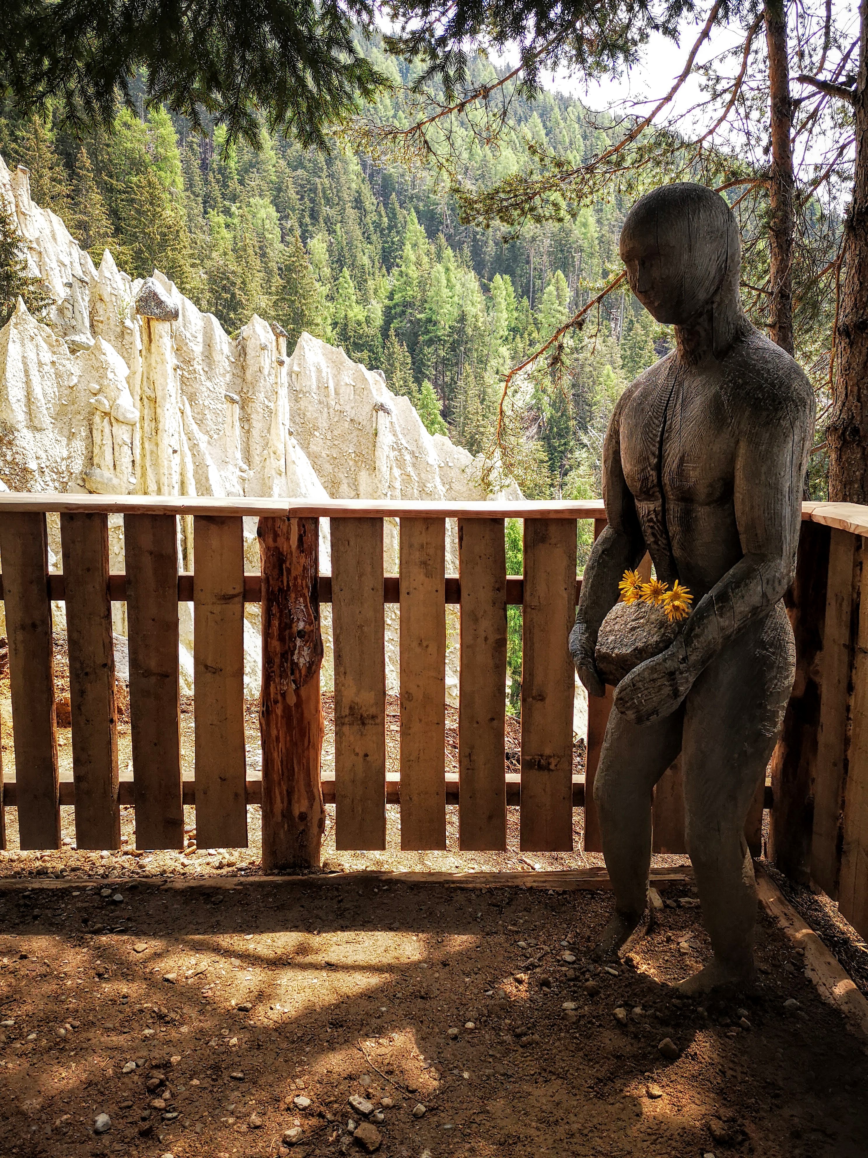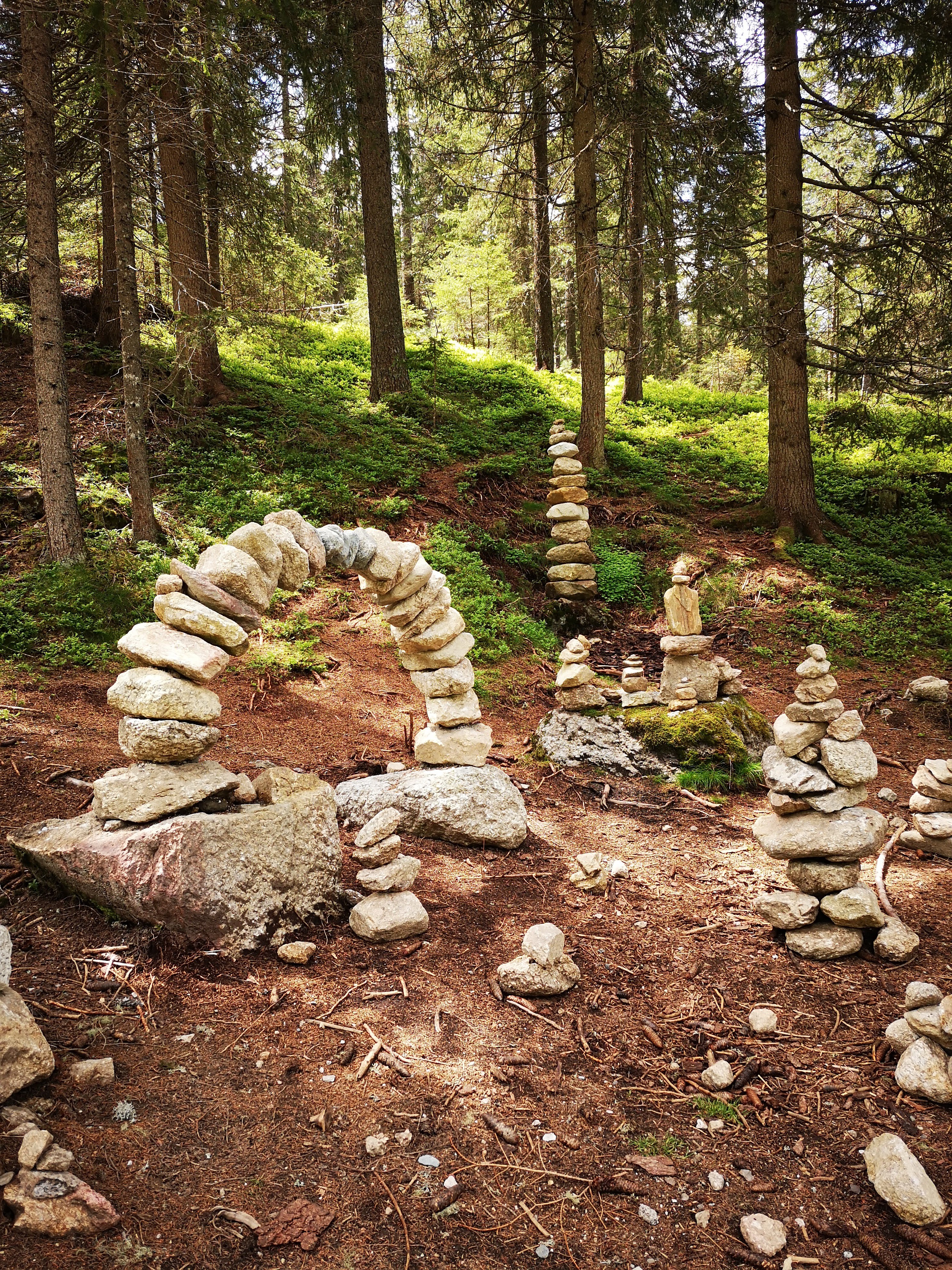 Schön schattig geht es zu Beginn stetig bergauf – im Wald gibts die ersten liebevoll angelegten Kleinigkeiten zu entdecken. Beschriftete Felsen, Traumfänger, unzählige Stoamandln (Stuamandal), Kreise oder Hinweistafeln zu den verschiedenen Gesteinsarten. Vorbei an einem kleinen Wasserfall, mal schmaler, dann wieder ein breiter. Aussi ausm Wald, am Sattel eröffnet sich der Blick auf das Pustertal – Kronplatz und die Pragser Dolomiten. Fette Blumenwiesen und Stille. Von diesem Punkt sind es nur mehr wenige Meter – max 5 Minuten – bis man ins Reich der Erdpyramiden eintaucht.