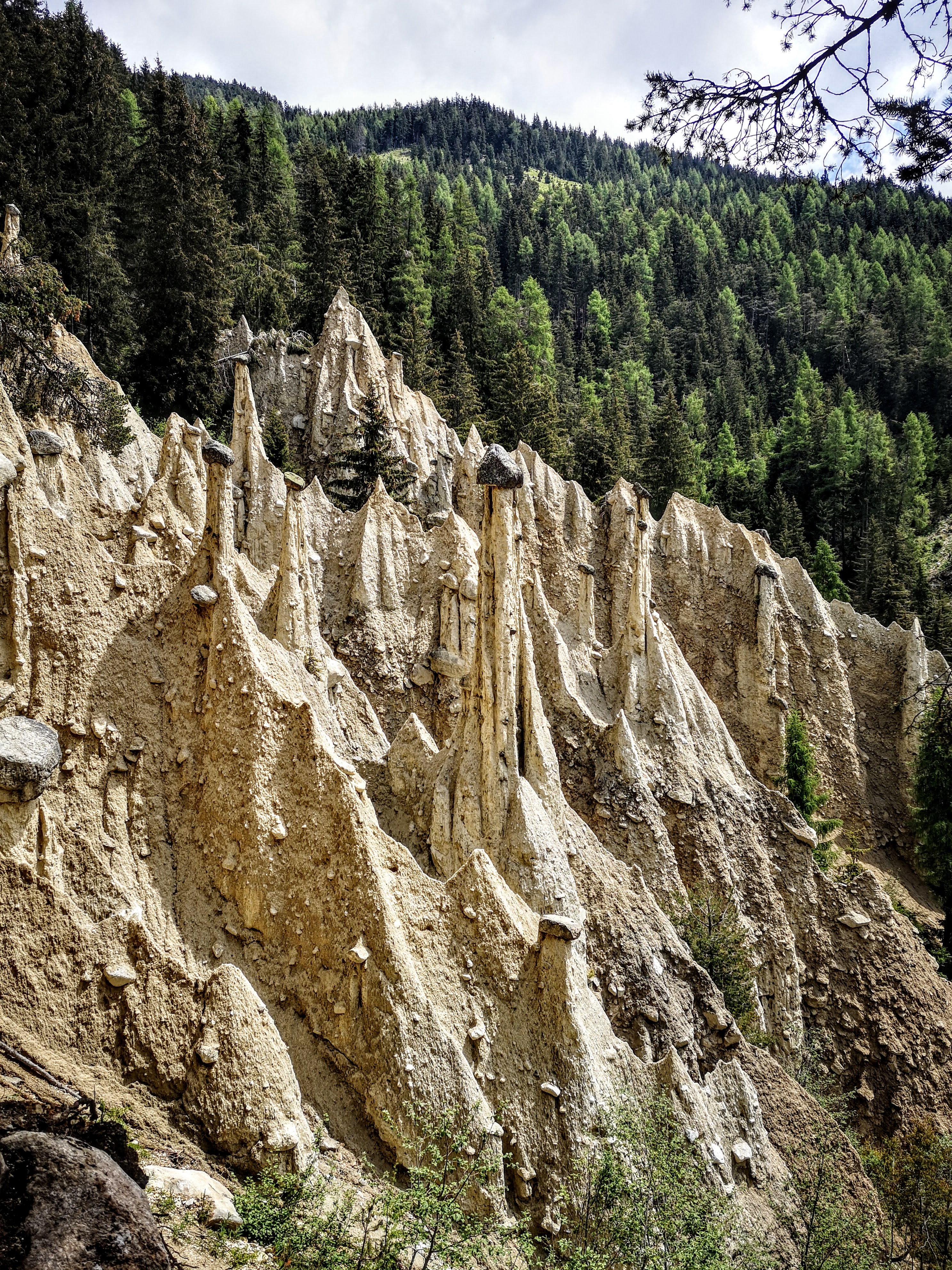 Enstanden sind sie übrigens 1800 irgendwann. Ein Unwetter löste einen Erdrutsch aus, der den damals zwischen Thalerhof und Aschbach bestehenden Karrenweg unterbrochen hatte. Die Abbruchstelle wurde damals aufgrund der fehlenden Verkehrsanbindungen – glücklicherweise – nicht wieder mit Erde aufgefüllt. Im Jahr 1882 kam es erneut zu einem Unwetter, im Rahmen dessen ein großer Graben entstand. Im Laufe der Zeit wurden die Seitenhänge durch die Niederschläge abgeschwemmt und abgewaschen. Dadurch entstanden lehmartige Säulen, auf denen jeweils ein Stein liegt. Diese Steine oder auch Gesteinsplatten schützen die darunter liegende Erdsäule vor Auswitterung. Mehr dazu gibts hier: http://pustertal-direkt.com/…/116-erdpyramiden-percha.html