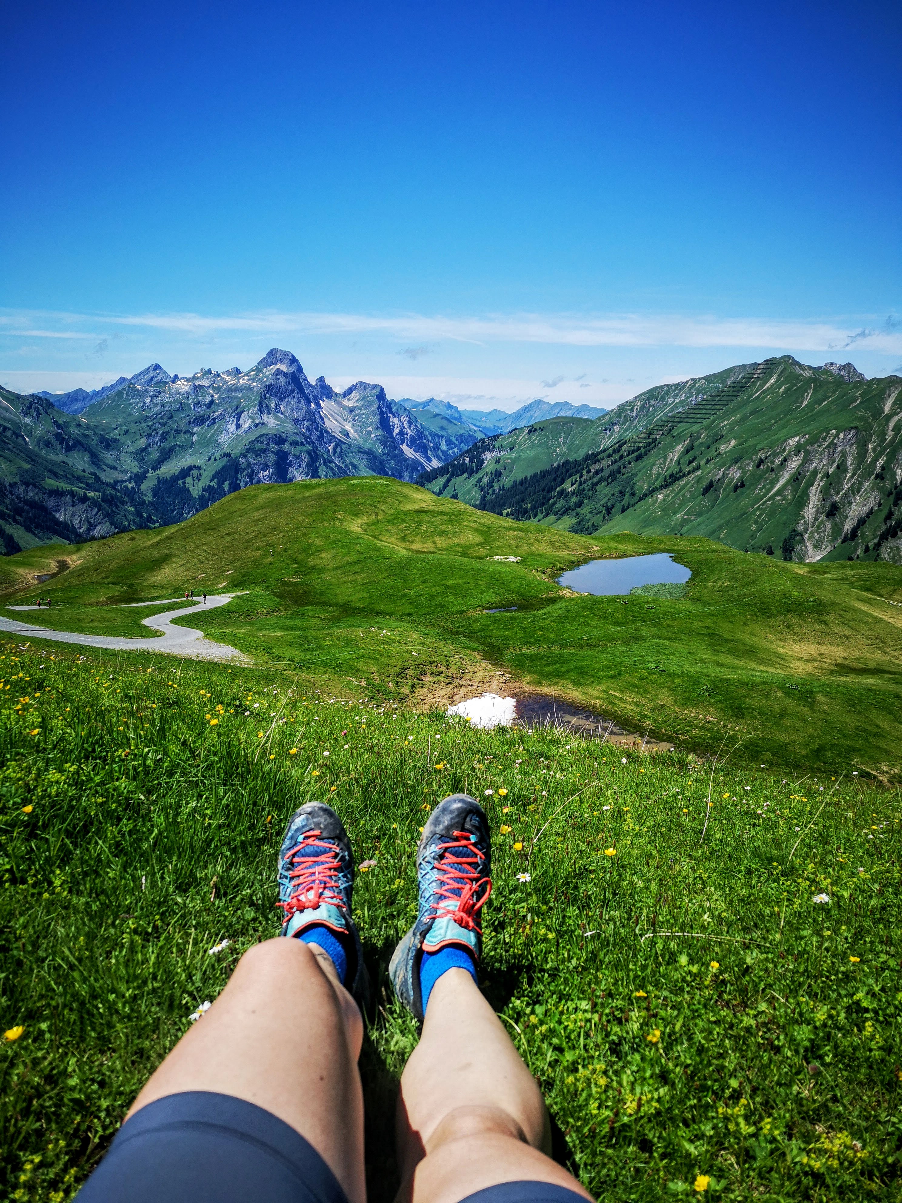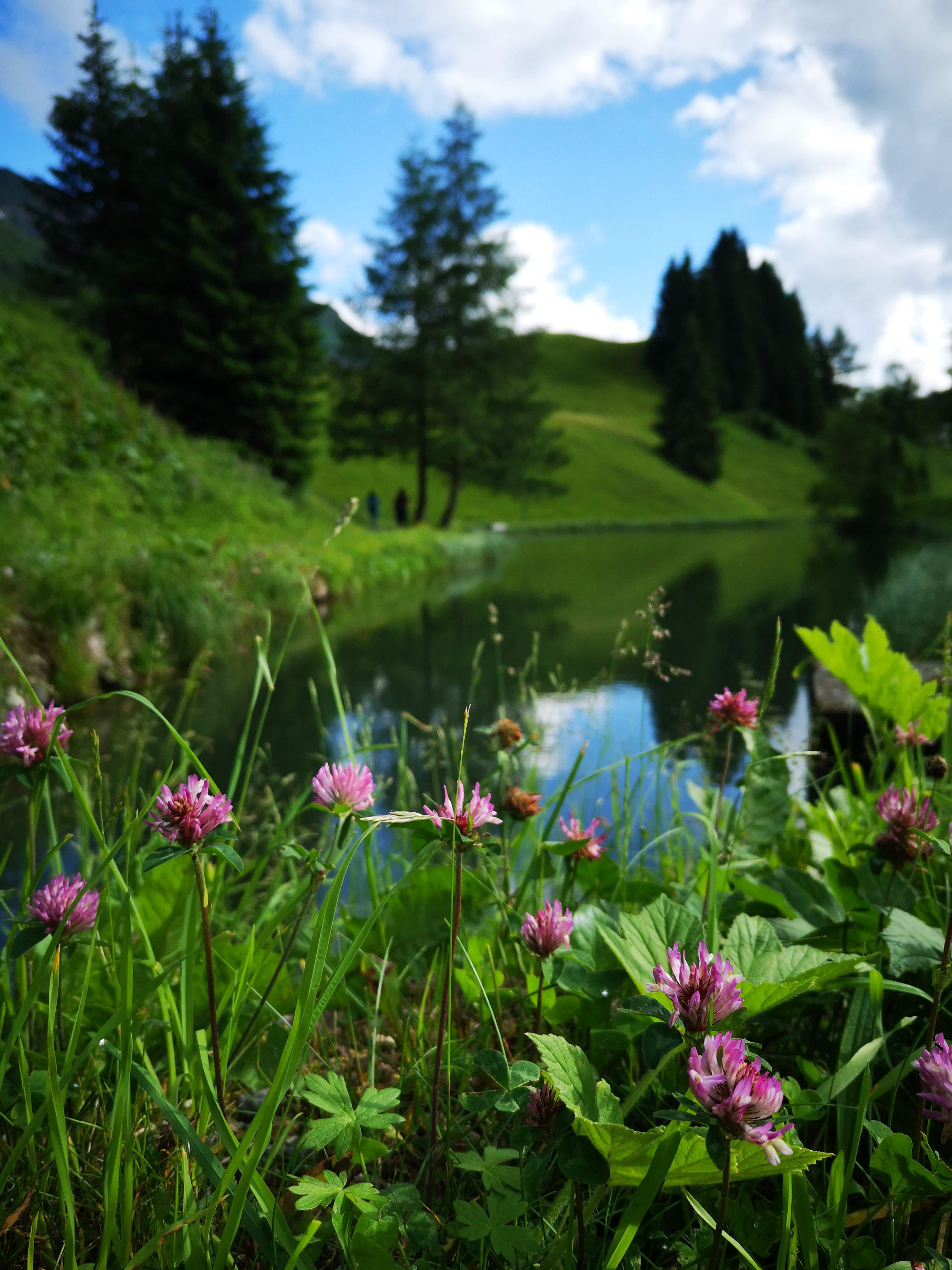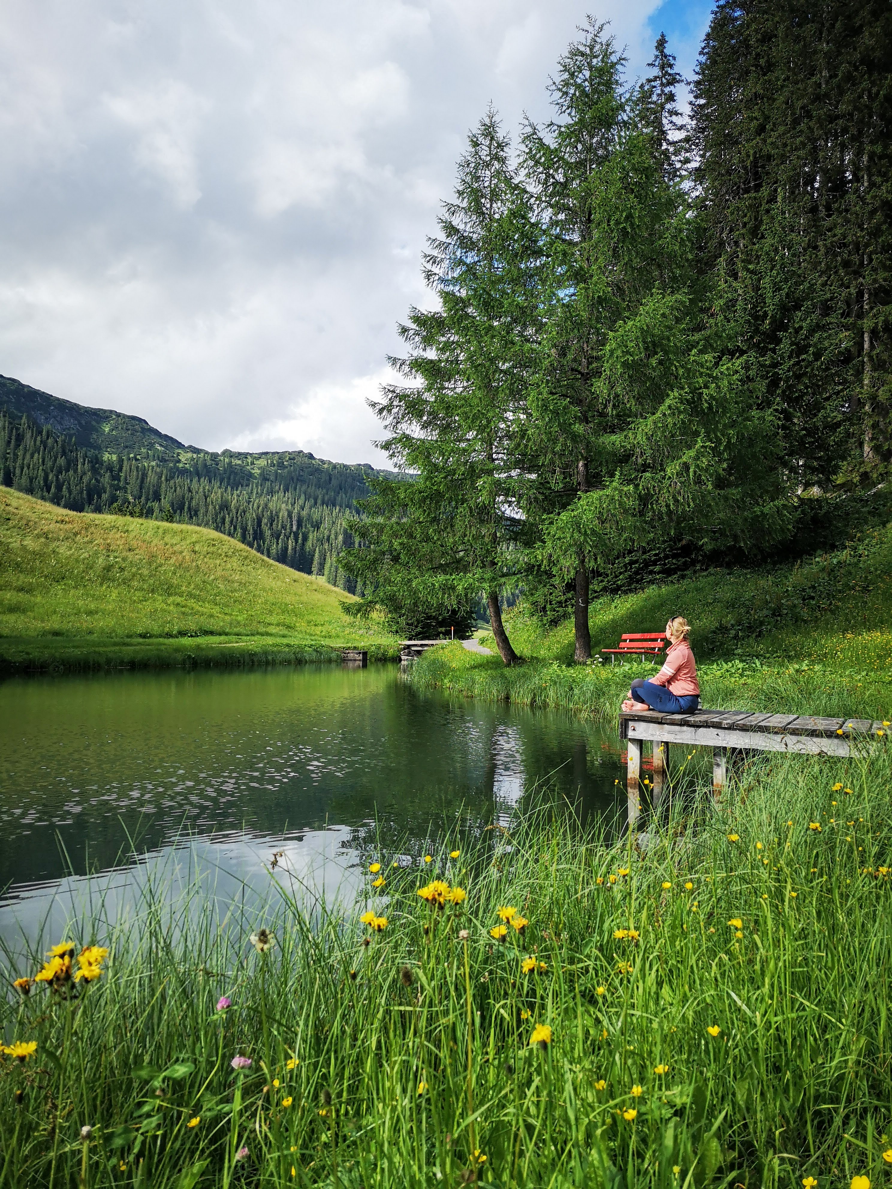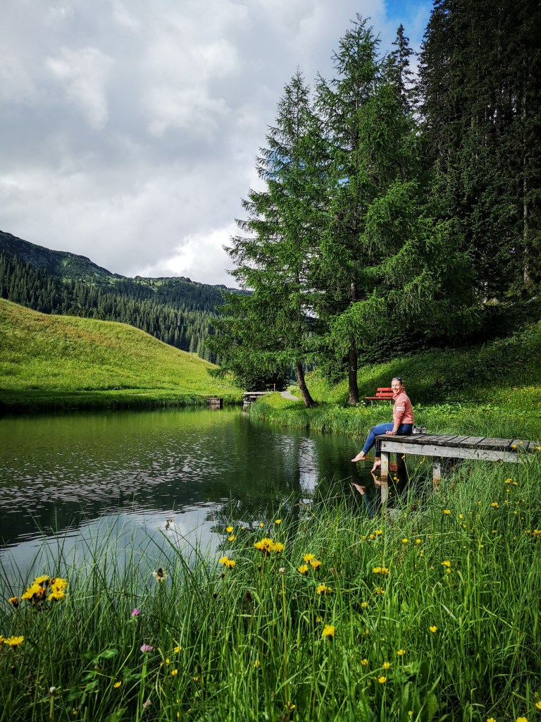 Nach 6,5h Anfahrt aus dem Salzkammergut wollte ich einfach nur eins: die Füsse vertreten…. Keine 10 Minuten vom Berghotel Biberkopf entfernt (liegt direkt am Dorfplatz) hat mich unerwartet das erste Kraftplatzerl überrascht: ein kleiner See! Übrigens: auch ein kurzer Spaziergang wird in Warth direkt zum sanften Höhentraining… von hier aus kann man verlängern und den Waldrundweg in 2 Varianten wählen. Die grosse Spazier-Runde hat 5k & 200hm, die kleine 2km & 55hm. Kurz nach dem Seebachsee geniesst man diese schöne Aussicht – erreichbar ohne viel Anstrengung.