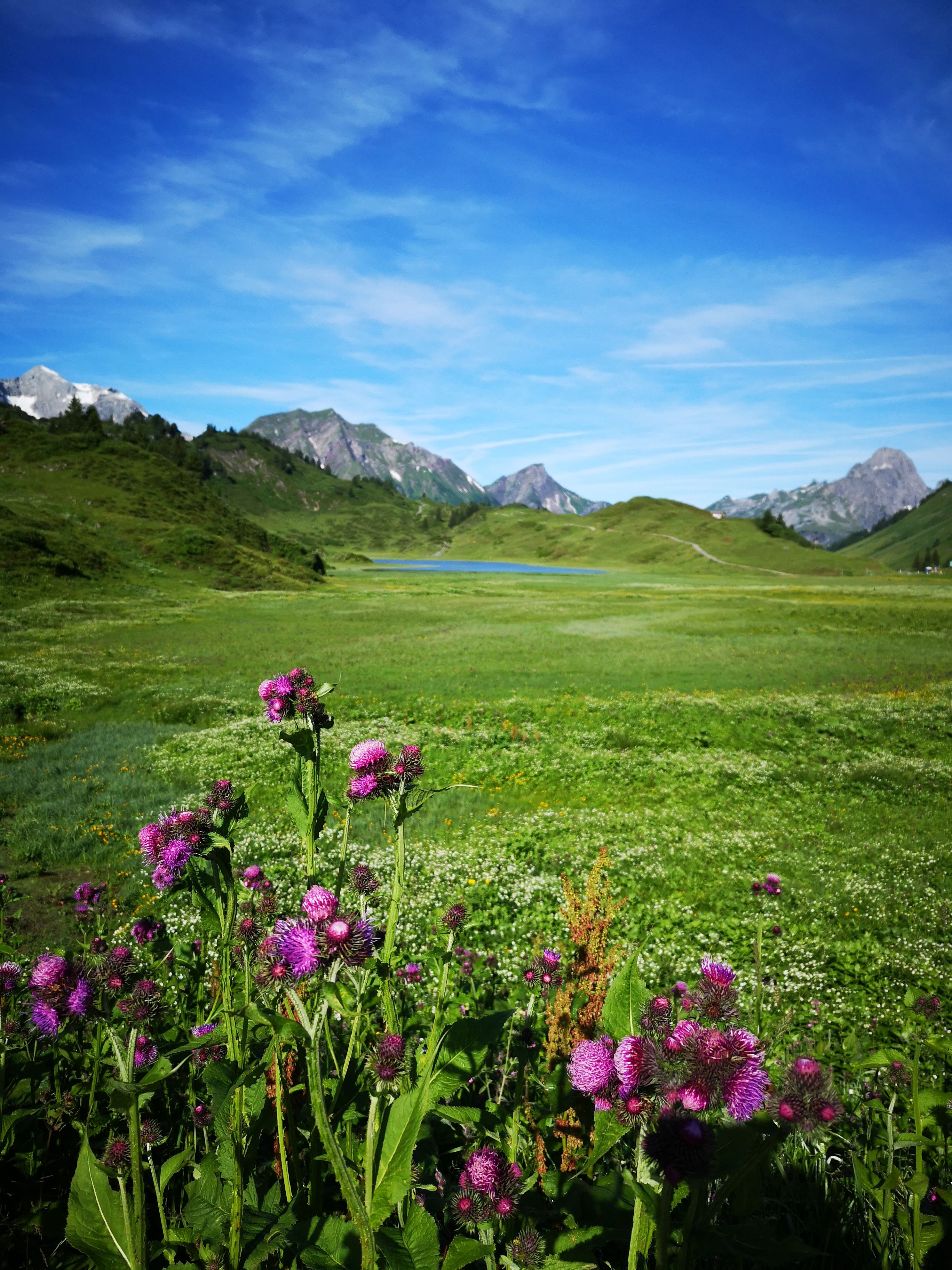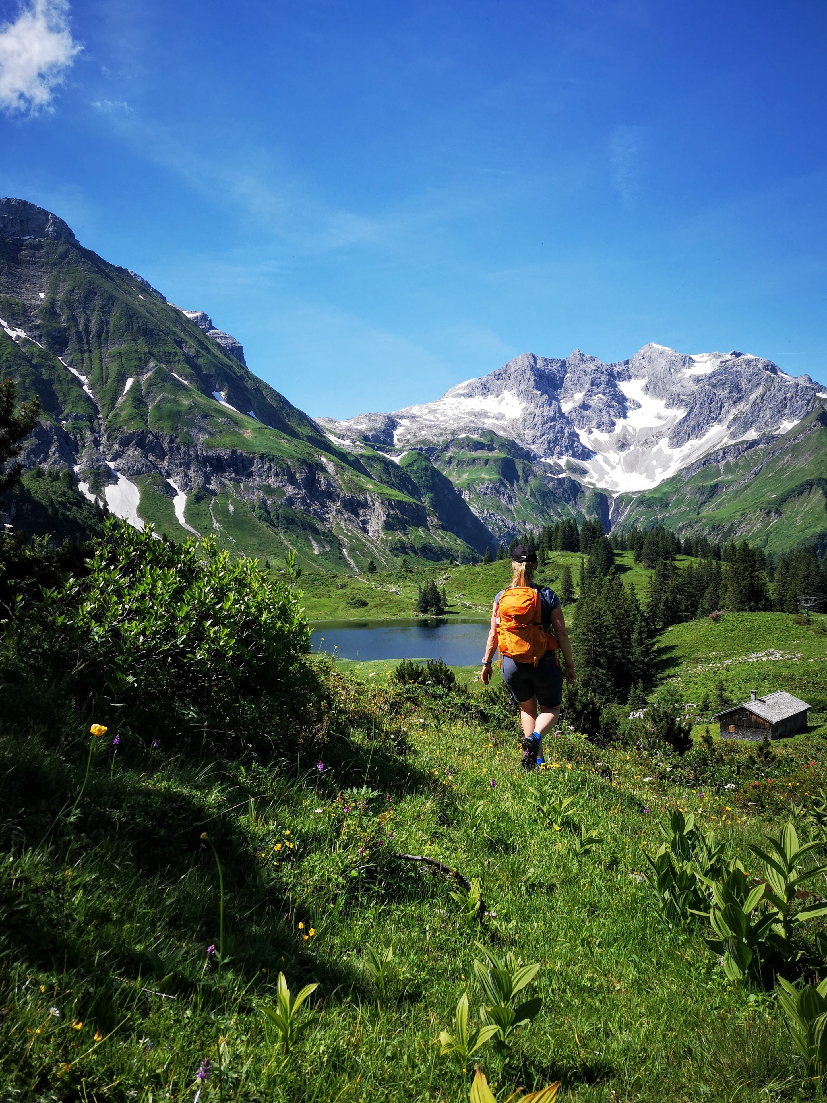 Vom Hochtannbergpass 1676m (Wanderparkplatz) vorbei am Kalbelesee zum Körbersee – dieser ist nur zu Fuss erreichbar und 2017 zum schönsten Platz in AT gevotet. Was dann folgte war klar: er wurde gnadenlos überrannt. Beliebt ist er immer noch, weil einfache Tour für Jung & Alt, aber zum Glück schieben sich bei meinem Besuch (noch) keine Massen über die zt schmalen Almwanderwege… (100hm & 5k). Was das Gebiet noch besonders macht: auf 1qm wachsen dort ca 20 verschiedene Kräuter, wie wir von Daniela Pfefferkorn auf unserer Kräuterwanderung gelernt haben. Wer die Tour erweitern mag: Abstieg via Nesslegg nach Schröcken, via Auenfeld nach Lech oder wie bei meiner Variante über den Saloberkopf nach Warth retour (siehe unten). Am Panoramafoto ist die markante Braunarlspitze 2649m im Hintergrund zu sehen – sie ist der höchste Gipfel im nördl. Lechquellengebirge – und ab sofort auf meiner Berg-Liste! Links die Juppenspitze 2412m, dahinter spitzelt die Mohnenfluh 2544m hervor. Der Körbersee liegt übrigens schon in Schröcken!