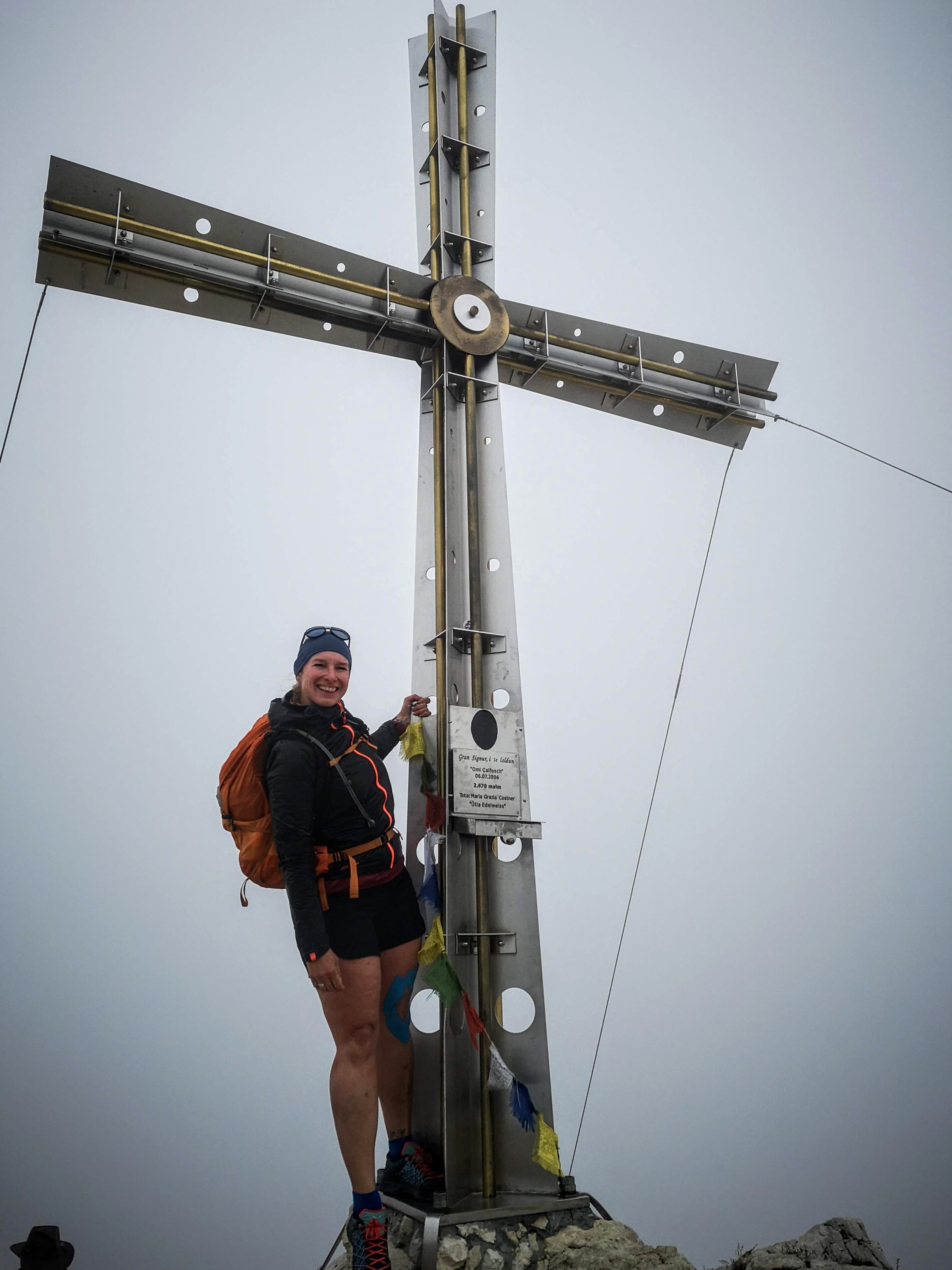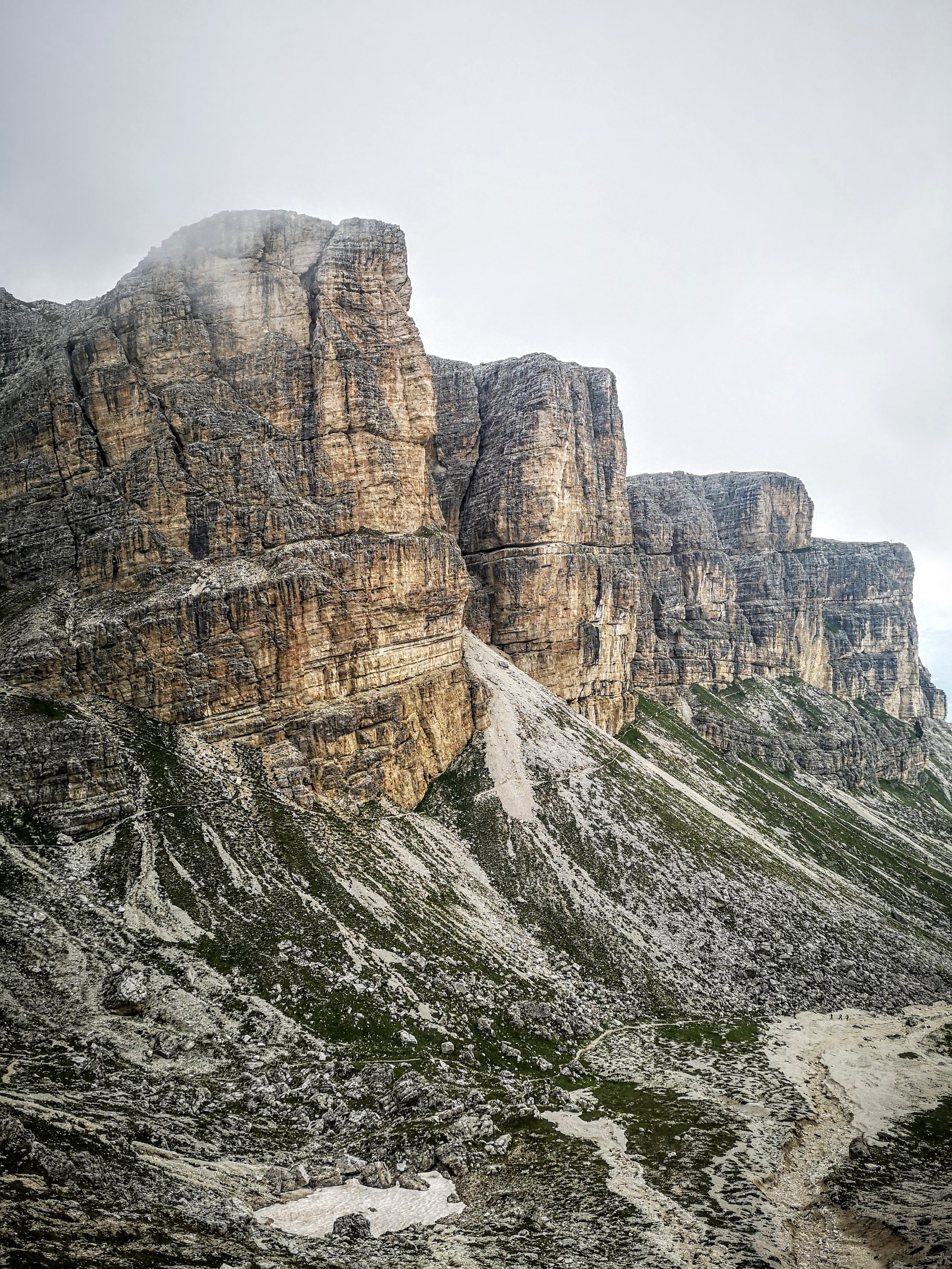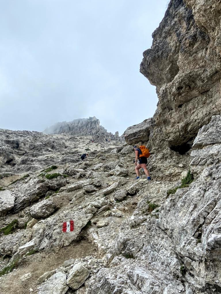 Passagenweise richtig hochalpin – riesige Felswände, mächtige Abstürze und wunderschöne Talblicke. Sonne, Nebel, Niesel. Von der Gardenacia Hütte bis zur Weggabelung aufsteigen, links Nr. 5 ri Sassongher einschlagen. Die schon am Vortag gesehene, steile Schotterscharte ist der erste kurze Zick-Zack Aufstieg. Oben 5 Schritte und schon geht es kurz abwärts ins Val de Juel. Entlang eines Felsbandes unterhalb steiler Felswände an der nördlichen Talseite durch das Val de Juel aufwärts, am Abzweig nach Funtanacia vorbei – ein letztes Steilstück, das in die Sassongher-Scharte (2435 m) führt. Danach folgt (für mich ehrlich gesagt grausliges) steiles Schuttgelände, dass zu einer sperrigen, aber sehr feschen Felsstufe führt. Diese lässt sich dank durchgehender Seilversicherung (zT doppelt geführt, wahrscheinlich um den Auf- & Abstieg zu entzerren) überwinden (II). Danach auf einem Felsband, teils ausgesetzt, schräg ansteigend auf den breiten, sandigen Nordwestrücken. Unschwierig in weiten Kehren gehts dann hinauf auf den Gipfel vom Sassongher (2670m). Panorama ist heute schon aus – der Nebel hüllt uns ein, kaum Tiefblicke möglich. Für Leute mit Höhenangst fein, ich find’s scho a weng schade!