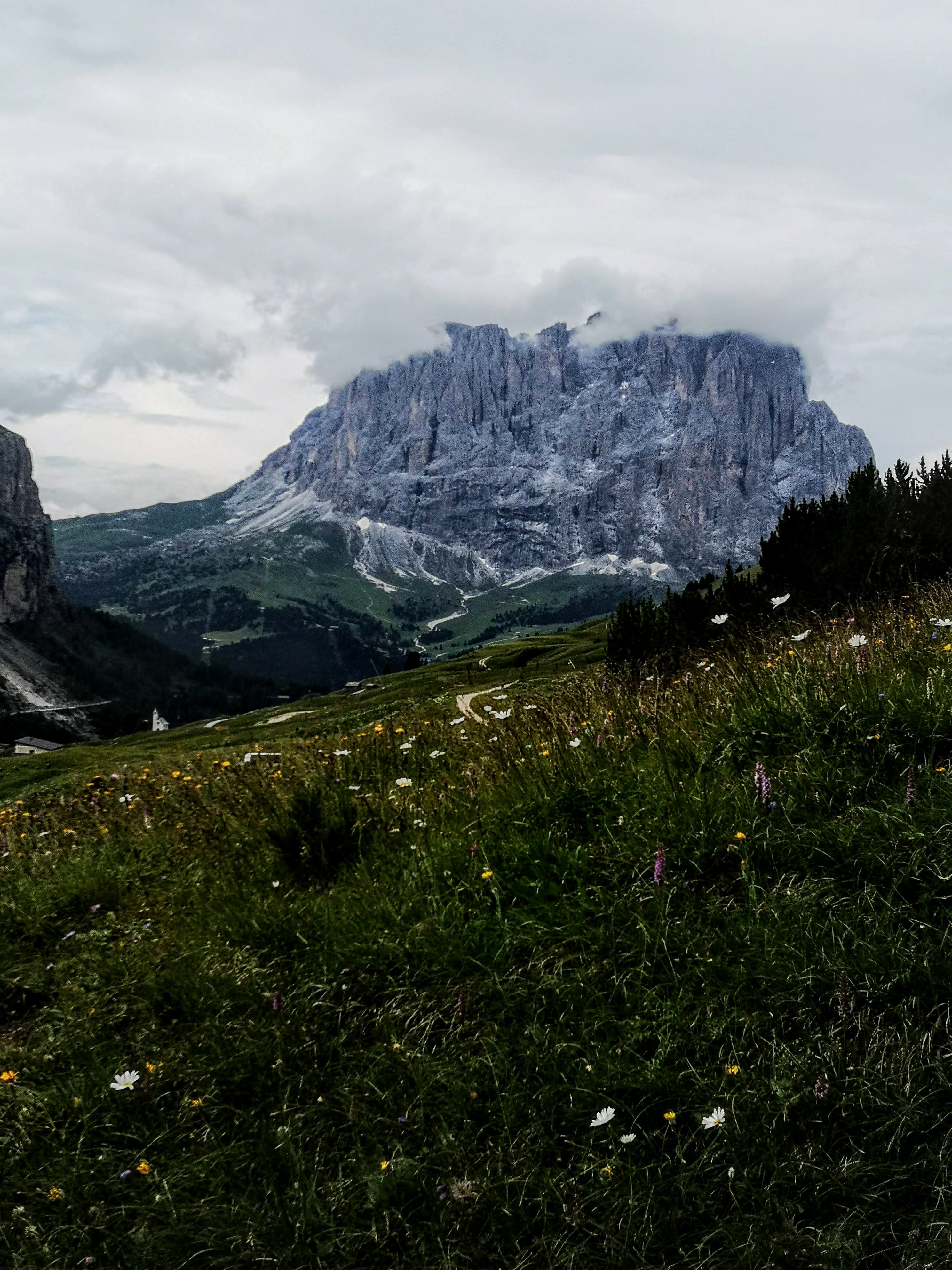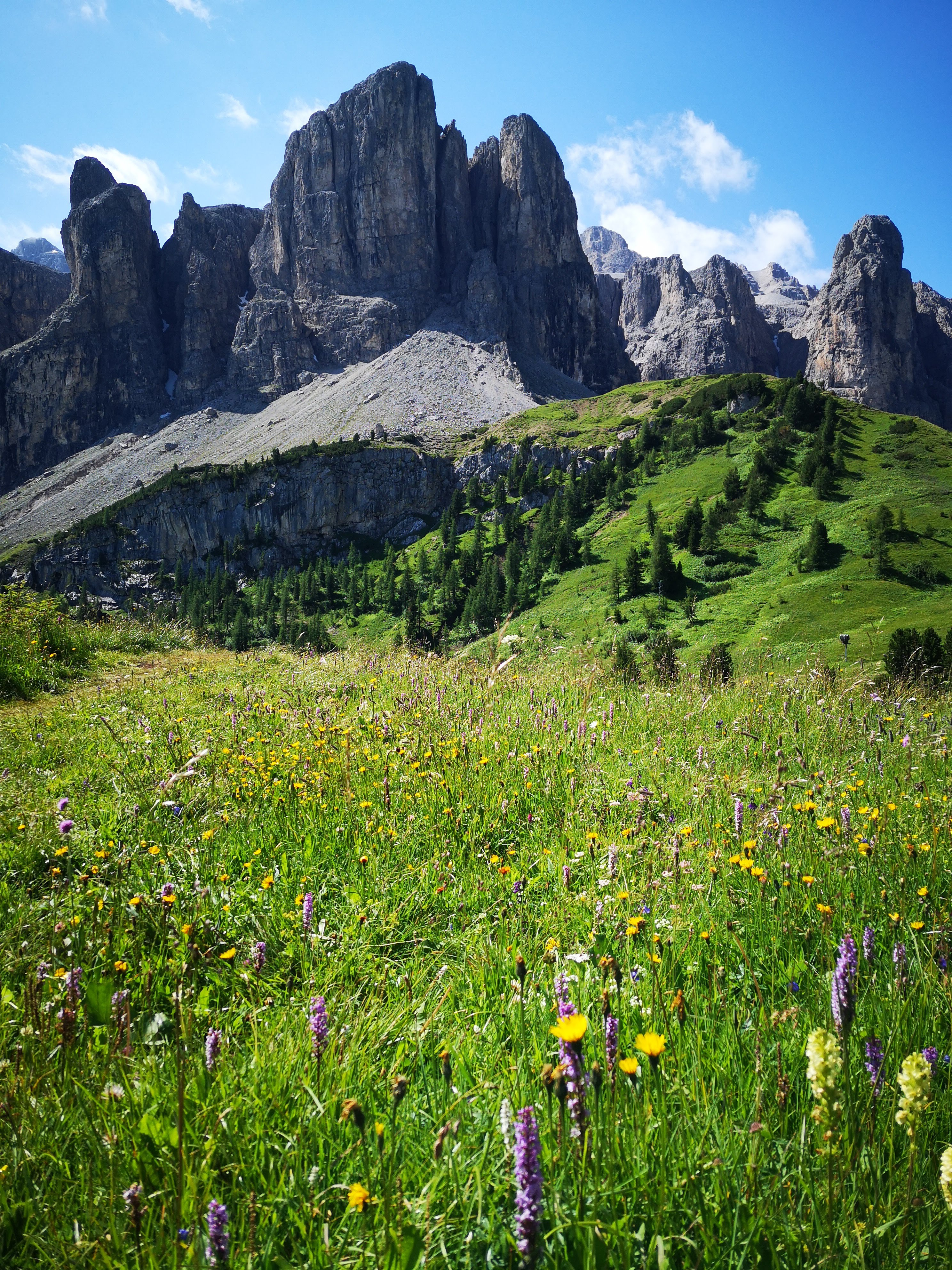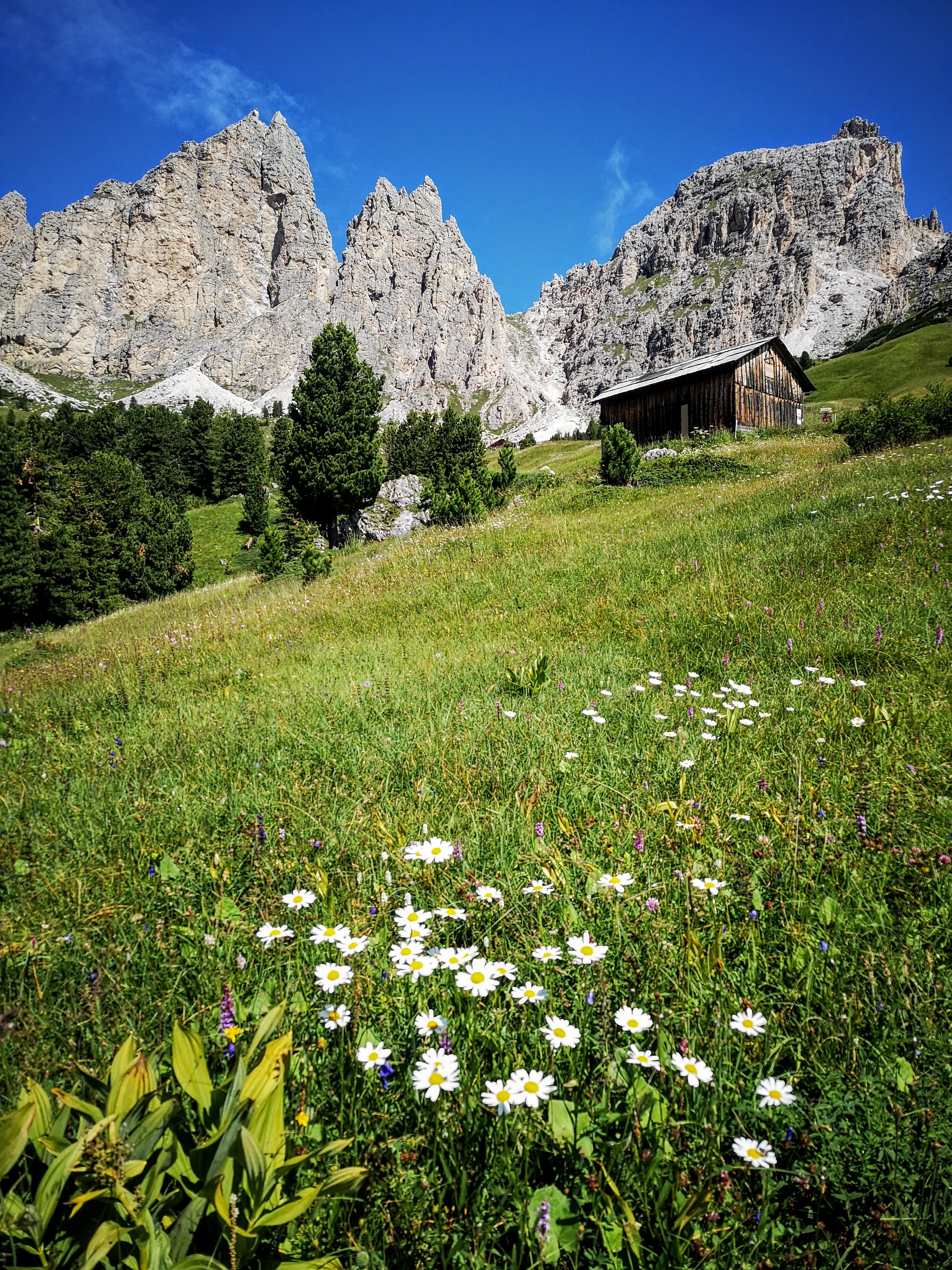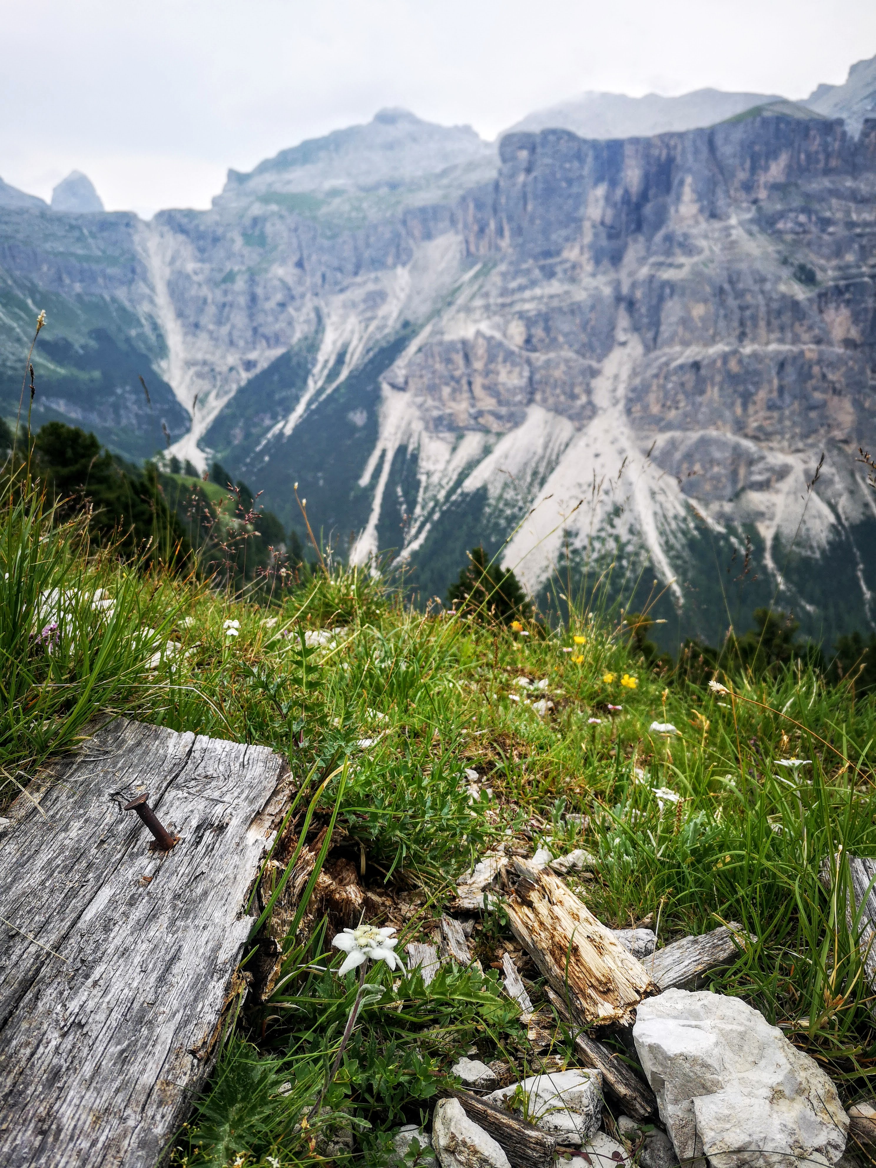 Aus sattem Grün wird bald felsiges Grau, inmitten von zackigen Spitzen und gewaltigen Felsformationen – so lässt sich der Aufstieg aus dem Langental zur Puezhütte am einfachsten beschreiben. Zwischen den Geislerspitzen im Westen, dem Peitlerkofel im Norden und den Cirspitzen im Süden erhebt sich, am Rand der Felswüste der Gardenaccia, die aus mehreren Gipfeln gebildete Puezgruppe, in deren Mitte die Puezhütte steht. Vorbei an der Silvesterkapelle, erst noch über breite Forstwege ohne viele Höhenmeter – dafür mit vielen Leuten, Bikern etc – tiefer ins Tal. Dann zum Glück scharf und unscheinbar links auf den Weg Nr. 16, der sich stetig steil nach oben schraubt und so die ersten, wunderbaren Tiefblicke frei gibt. Heiss, Schweiss lass nach. Aber: hier wird es ruhiger – endlich! Ein blühendes Plateau als Kraft- & Durchschnauf-Platzerl, bevor der nächste felsige Abschnitt in Begleitung von Edelweiss zum Mittagspausenplatzerl, der begehrten Puez-Hütte führt… Samstags ist dort oben natürlich einiges los.