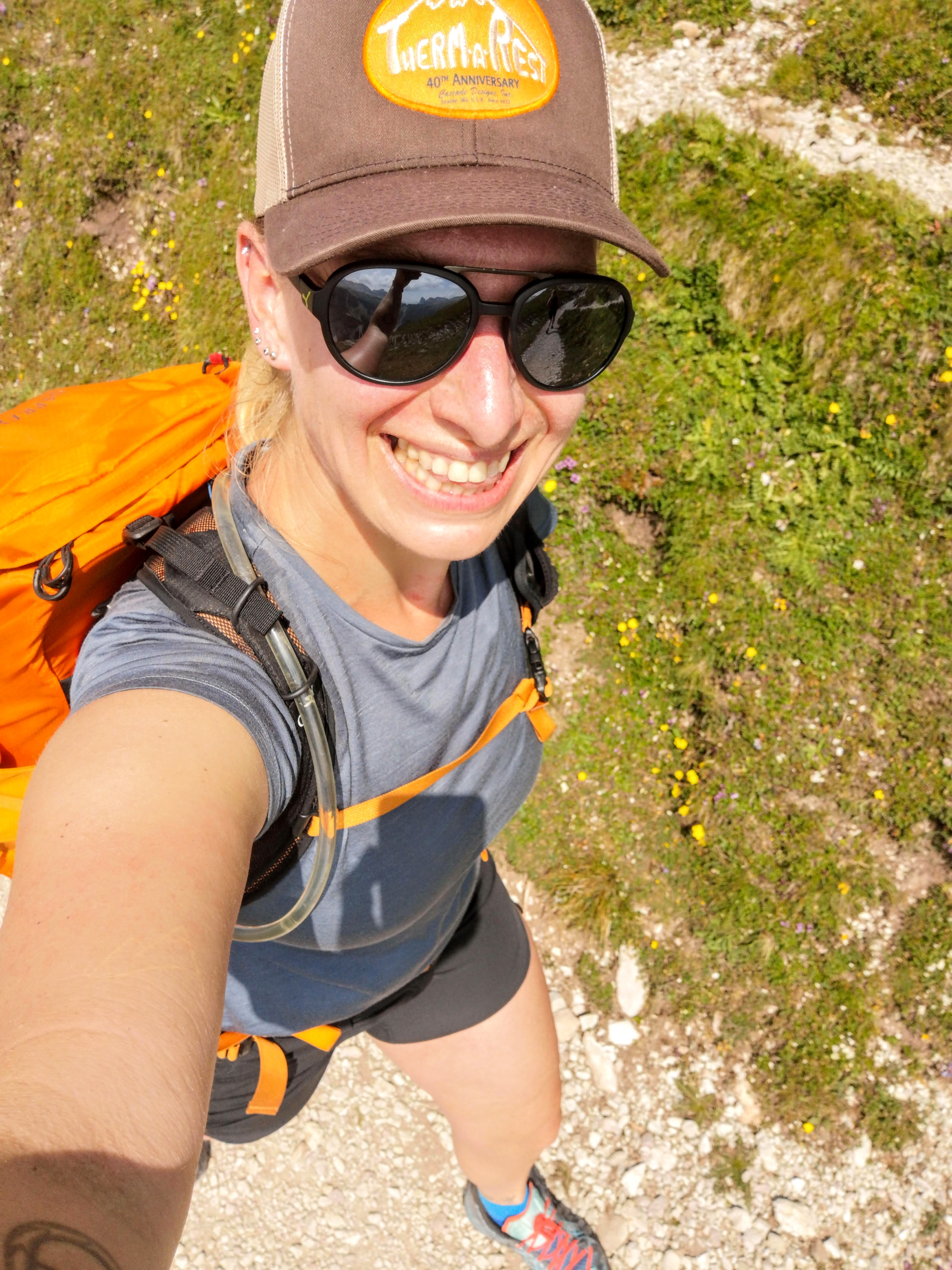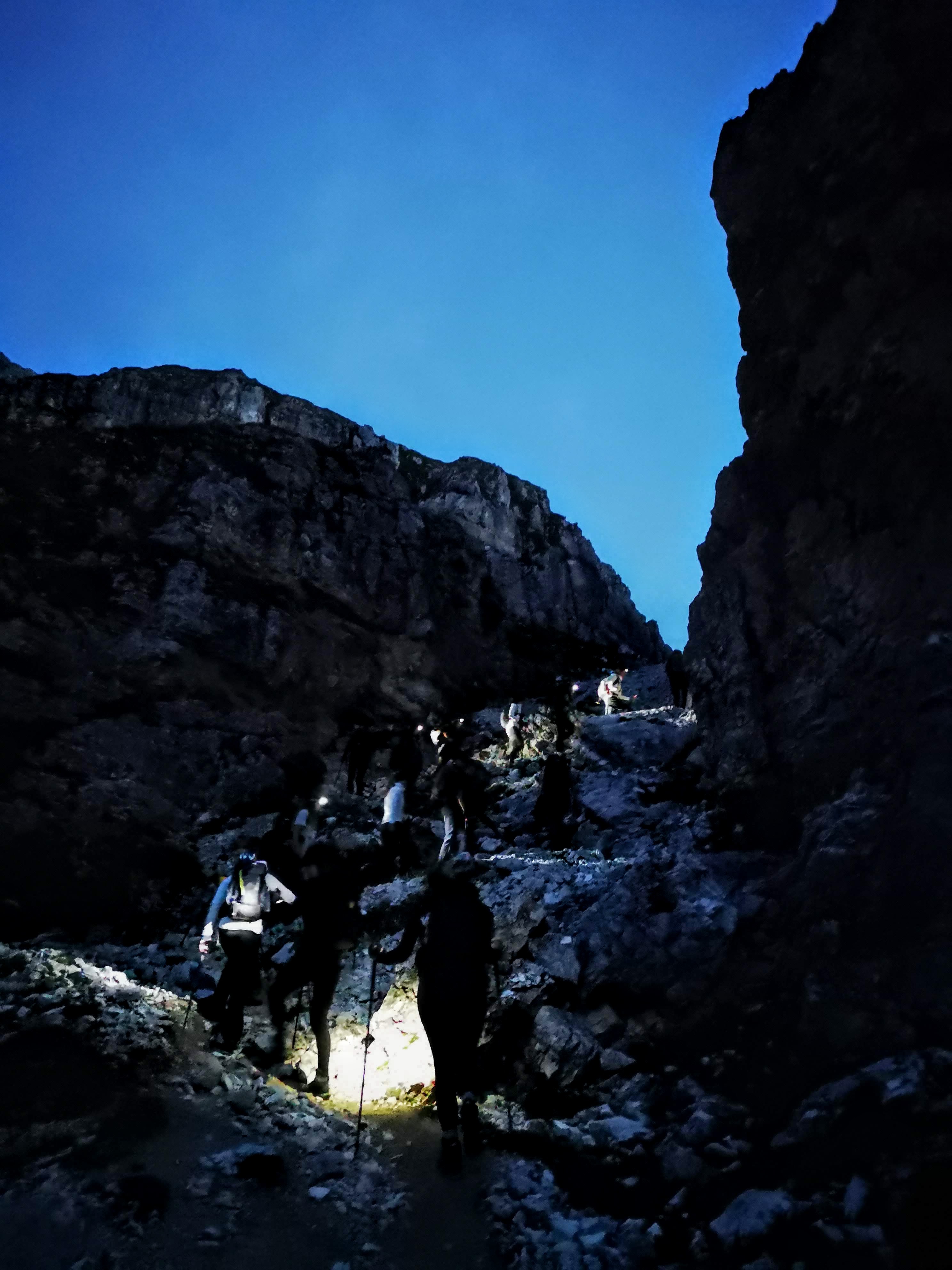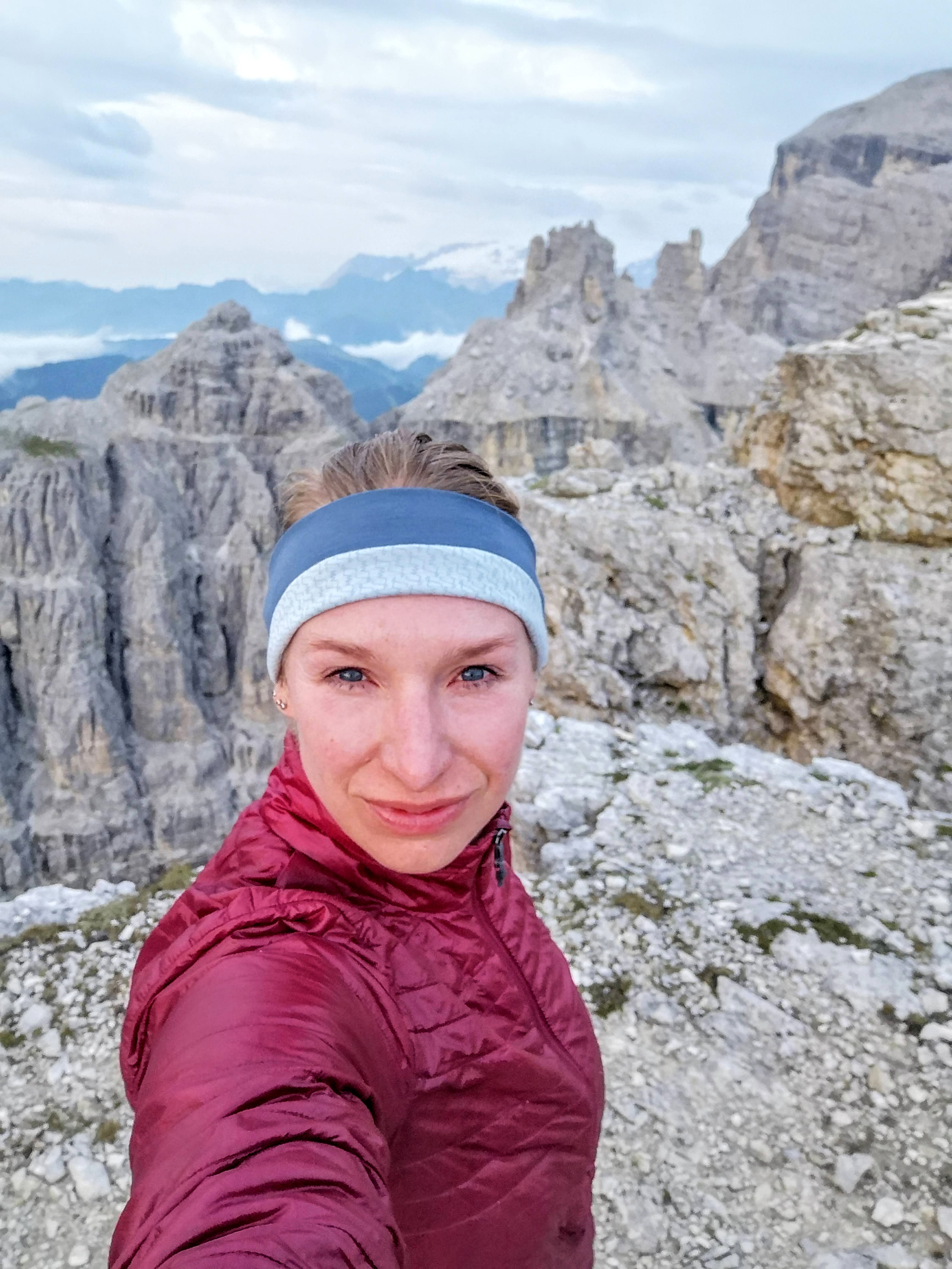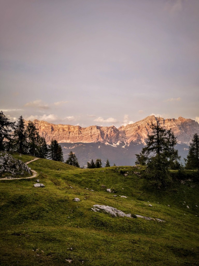 Wecker um 03.45 – Aufbruch um 04.15. Die Hirnbirn leuchtet mit dem Mond um die Wette. Die Kühe sind davon wenig beeindruckt. Eine ausgesetzte Stelle, etwas versicherte Kraxelei. Sonnenaufgang um kurz nach 5 hinter dem Kreuzkofel. Gewaltige Eindrücke & Tiefblicke ins Gadertal / Val Badia. Zum Frühstück retour zur Hütte, die restlichen Übernachtungssachen wieder in den Rucksack packen und dann wartet Gipfel Nummer 2…