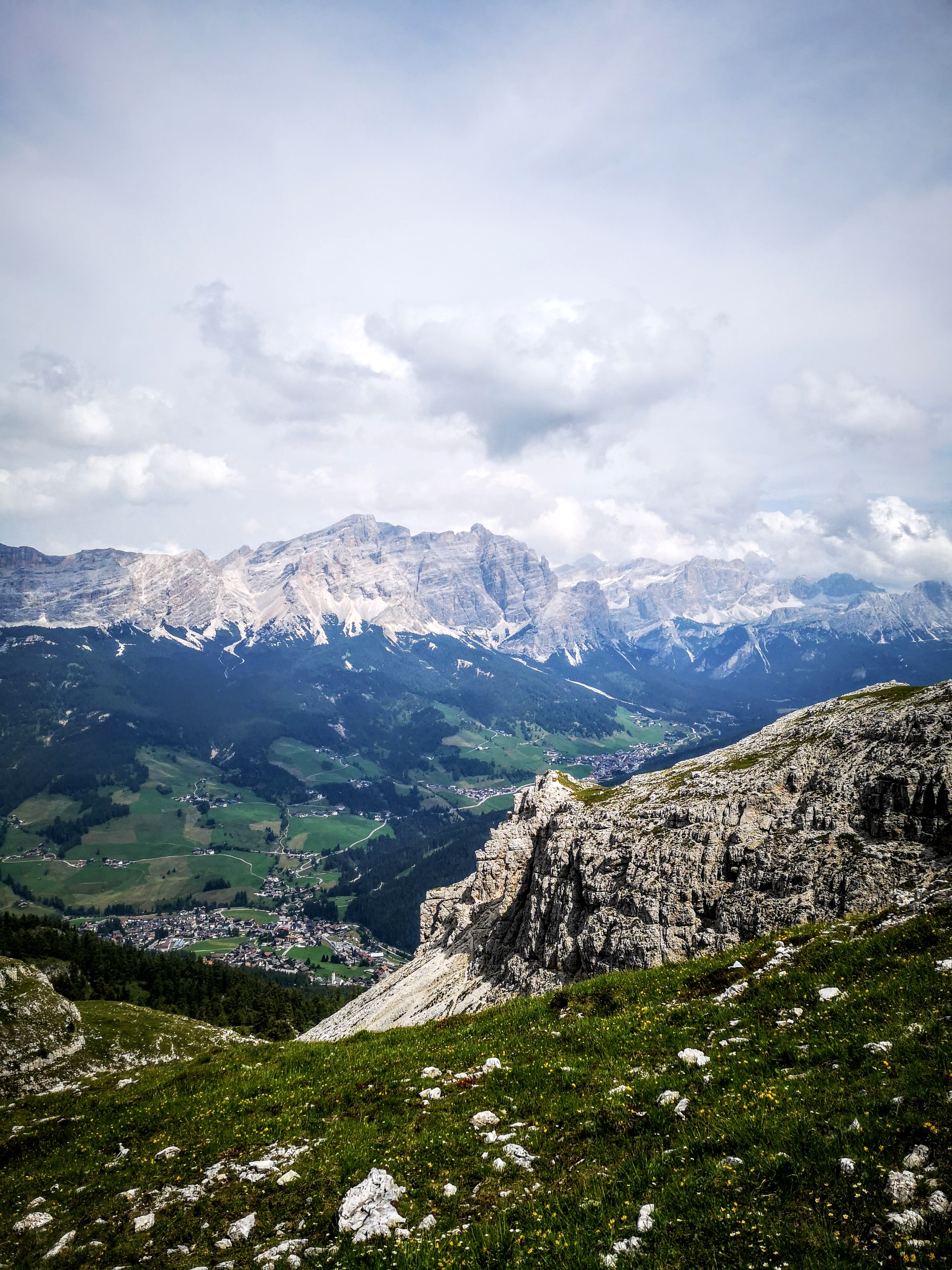 Nach dem Gipfel gehts nur mehr bergab. Des einen Freud, des anderen Leid – bei zweiterem bin ich heute dabei… das letzte Stück nach der Seilversicherung bis zur Scharte, der weitere Abstieg ins Edelweisstal ist tlws ausgesetzt, aber vor allem eines: steil und geröllig/schottrig. Knieschonend – nicht im geringsten. Nutzt aber nix, dauert dafür etwas länger. Bei mir. Wenn ma wen zum ratschen hat, gehts es immer leichter. Und der Ausblick ist auch nicht der schlechteste. Ausserdem wartet auf der Edelweisshütte 1832m a kühles Weizerl und was zum Essen. Danach noch die letzten 200 Höhenmeter nach Kolfuschg / Colfosco – übrigens auf 1645m das höchstgelegene Dorf in Alta Badia! Dort wartet unser Bus retour via Grödner Joch nach Wolkenstein. Wäre ich jetzt alleine unterwegs, hätte ich wohl den direkt den Kolfuschger Höhenweg Nr. 8 retour zum Grödner Joch genommen. Und wäre dann entspannt mit der Dantercepies Bahn ins Tal gegondelt.