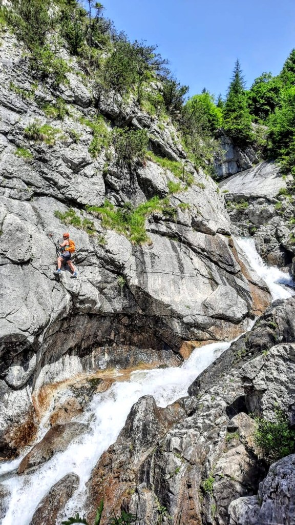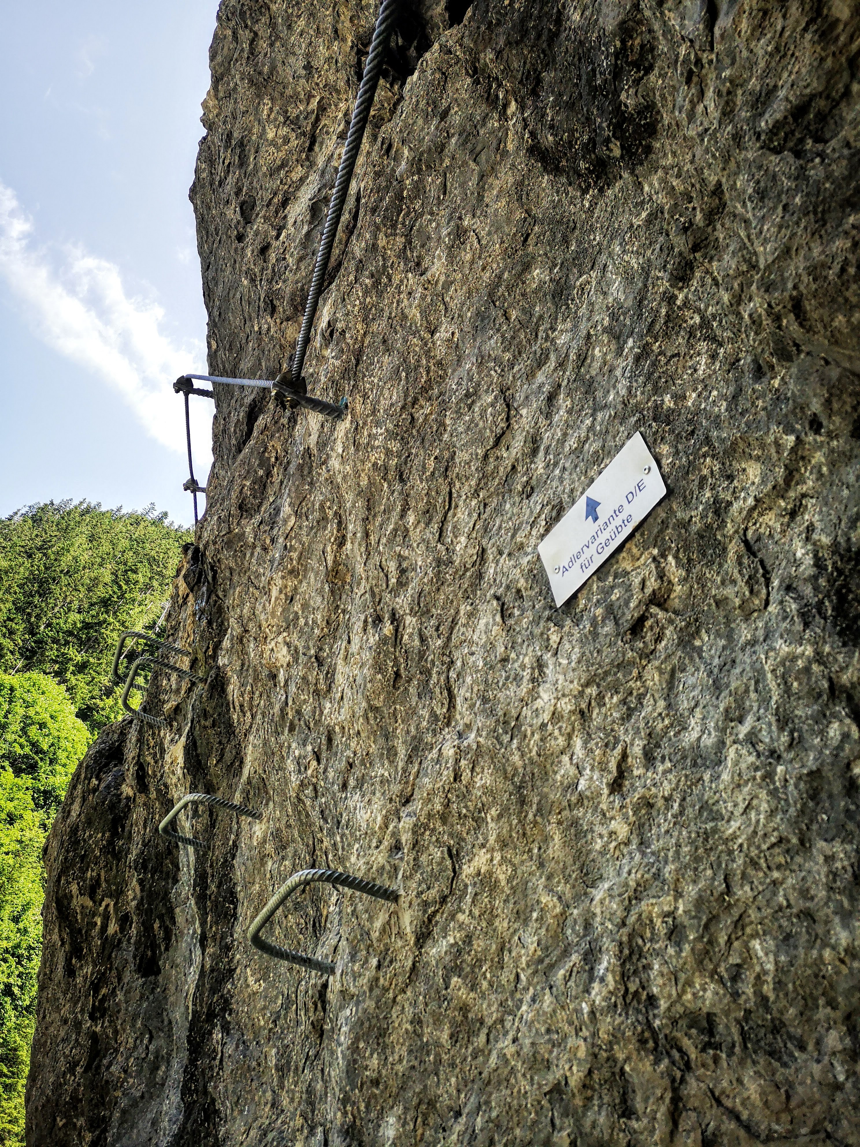 Einstiegspassage südseitig via Gams (B/C) gegenüber der Bärenhöhle (Anseilplatz mit Topo auf einer riesen Tafel, Sicherheitsinfos & kurzer Übungsklettersteig). Über eine kleine Seilbrücke den Höhenbach und dann diese Wand queren – viele Klammern, die bei Nässe fix hilfreich sind – der Fels wie Schmierseife dort. An der Stelle wo ich steh, gehts dann bergauf… des Wasser unterhalb rauscht ganz schön, aber des war noch nix gegen des, was folgt.