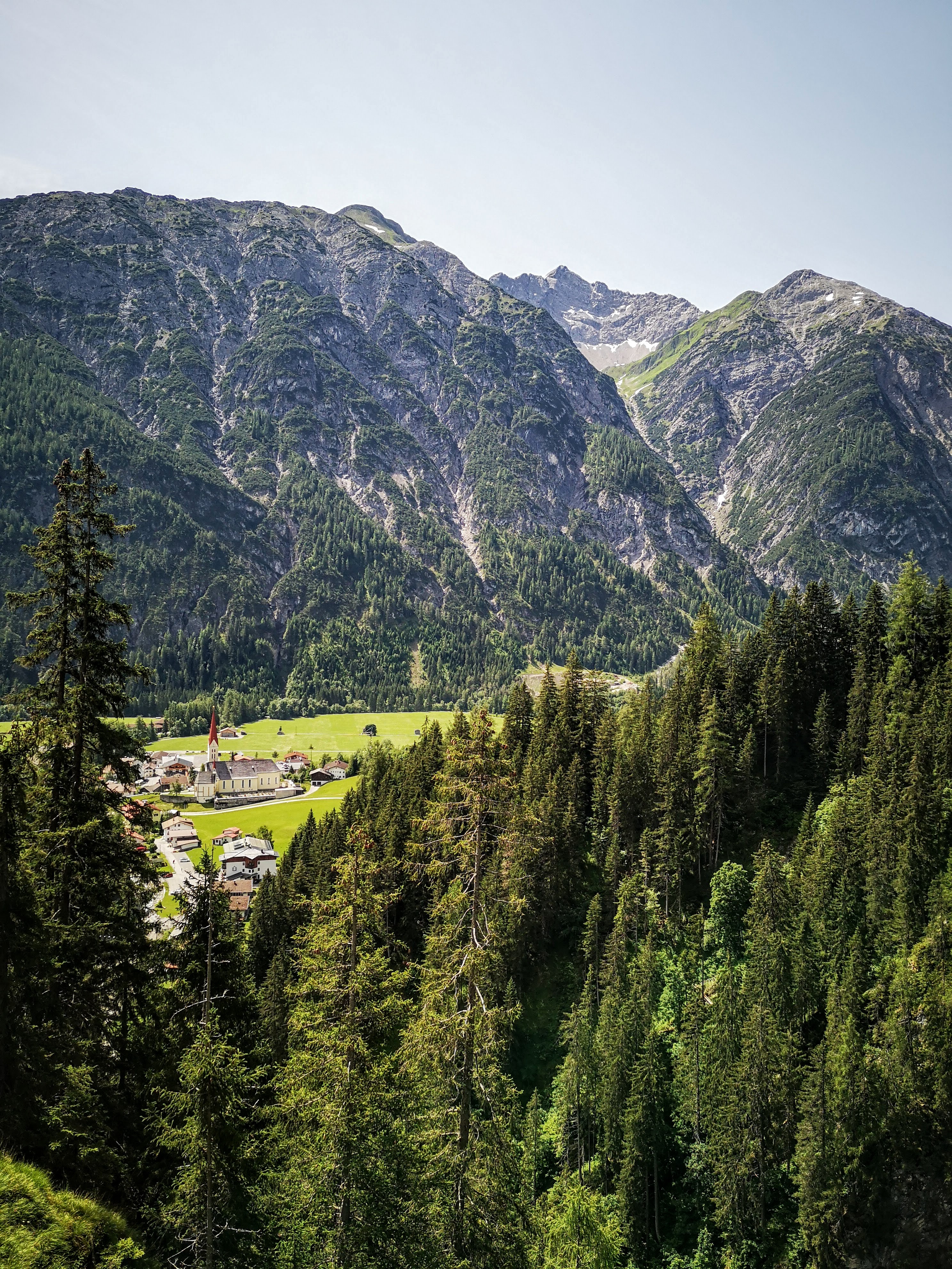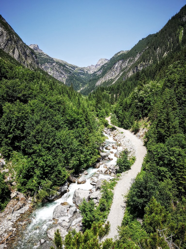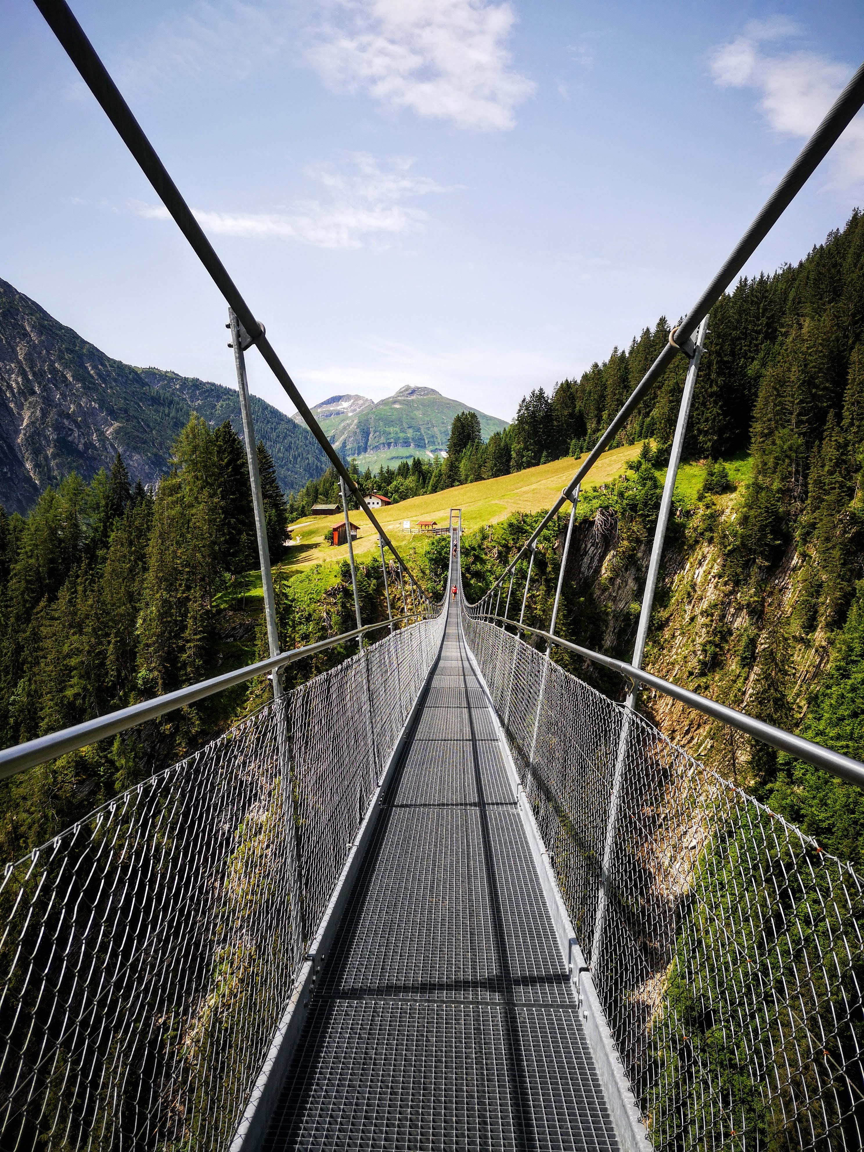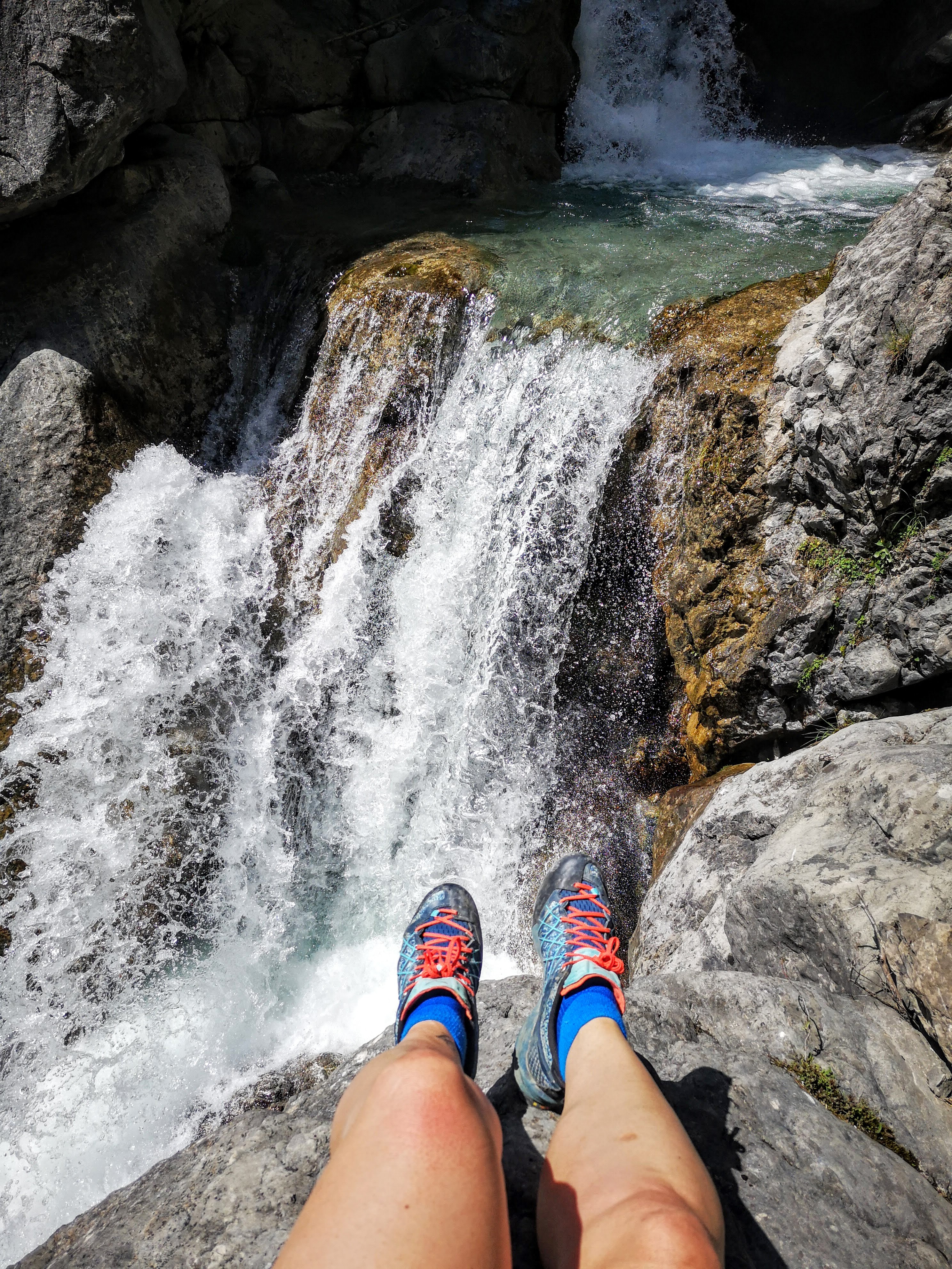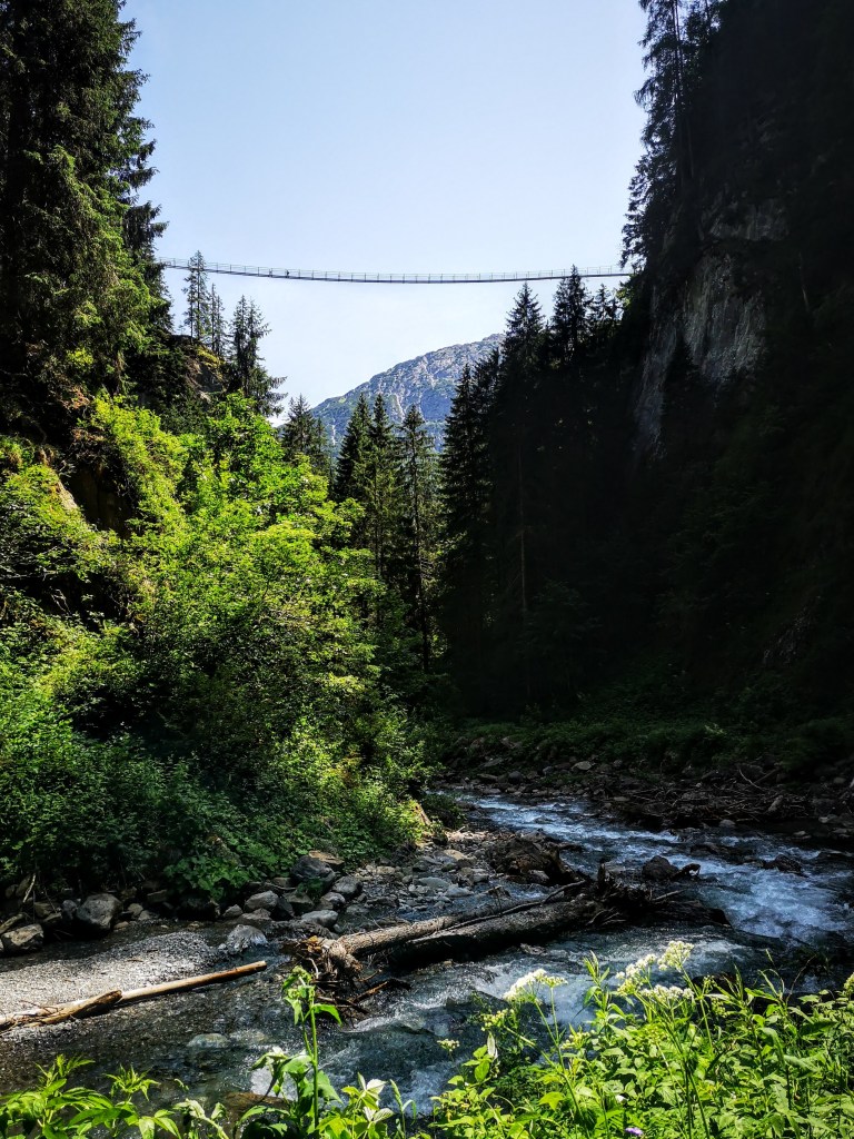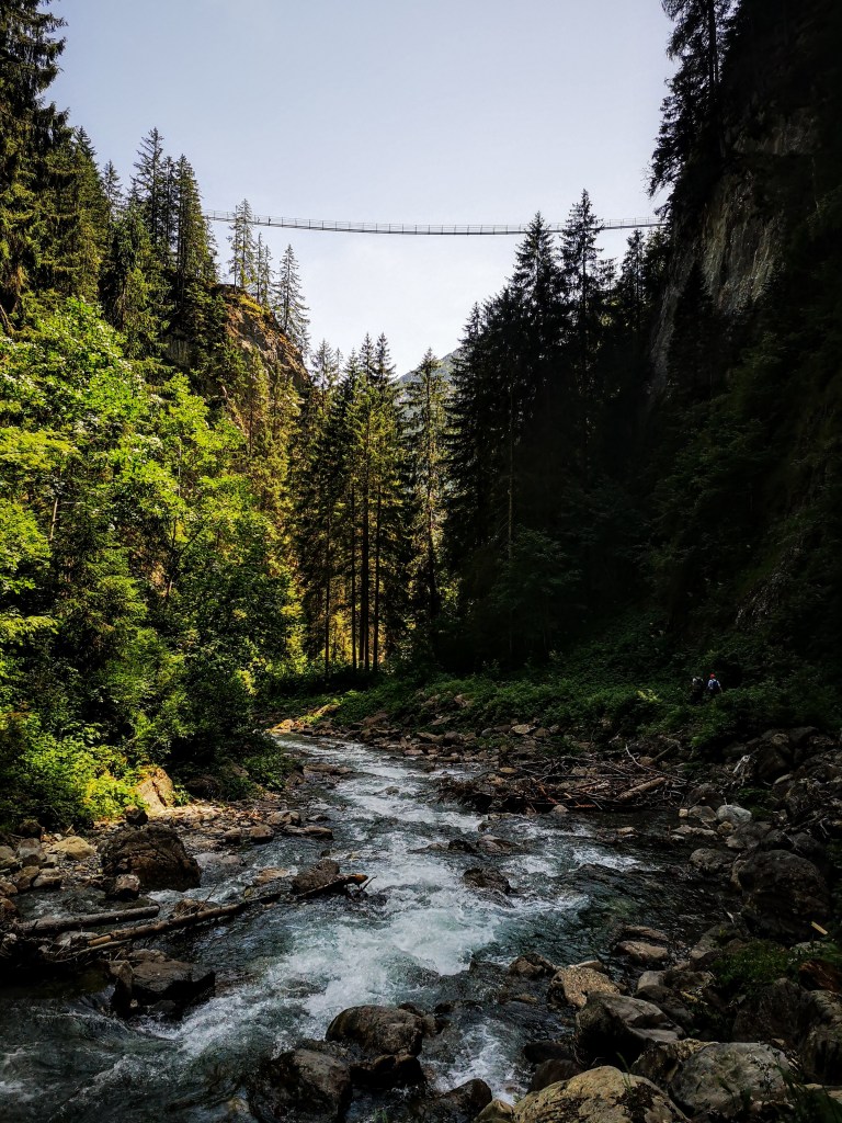 Der Rückweg von Warth (Tipp: Karhorn 2416m Klettersteige Warth – Ostgrat (B/C) & Westgrat (C)) führt mich ins Lechtal. Perfekt für einen Klettersteig-Stopp. Von der Gemeinde Holzgau erst an der Kirche vorbei, über Gföll den Lechweg (5) nach oben. An der Strasse bis zur Abzweigung zum ersten Highlight. Über die Höhenbachschlucht führt eine Hängebrücke… klar, dass ich mir meinen Zustieg inklusive wähle. Die Hängebrücke queren – sie ist 200m lang und 100m tief (kostenlos). Es war lange die längste und höchste bis in Reutte eröffnet wurde (aber die kostet ja auch was). Lohnt sich total, wenn man schwindelfrei is – super schöner Aus- & Talblick – Achtung: schwingt minimal mit, je nach Wind evtl a bissl mehr… Danach dem Wanderweg zum Café Uta erst bergauf dann bergab im Wald weiter folgen, links erster Ausblick auf den Simms-Wasserfall und dann neben dem Höhenbach nach unten zum Wasserfall.