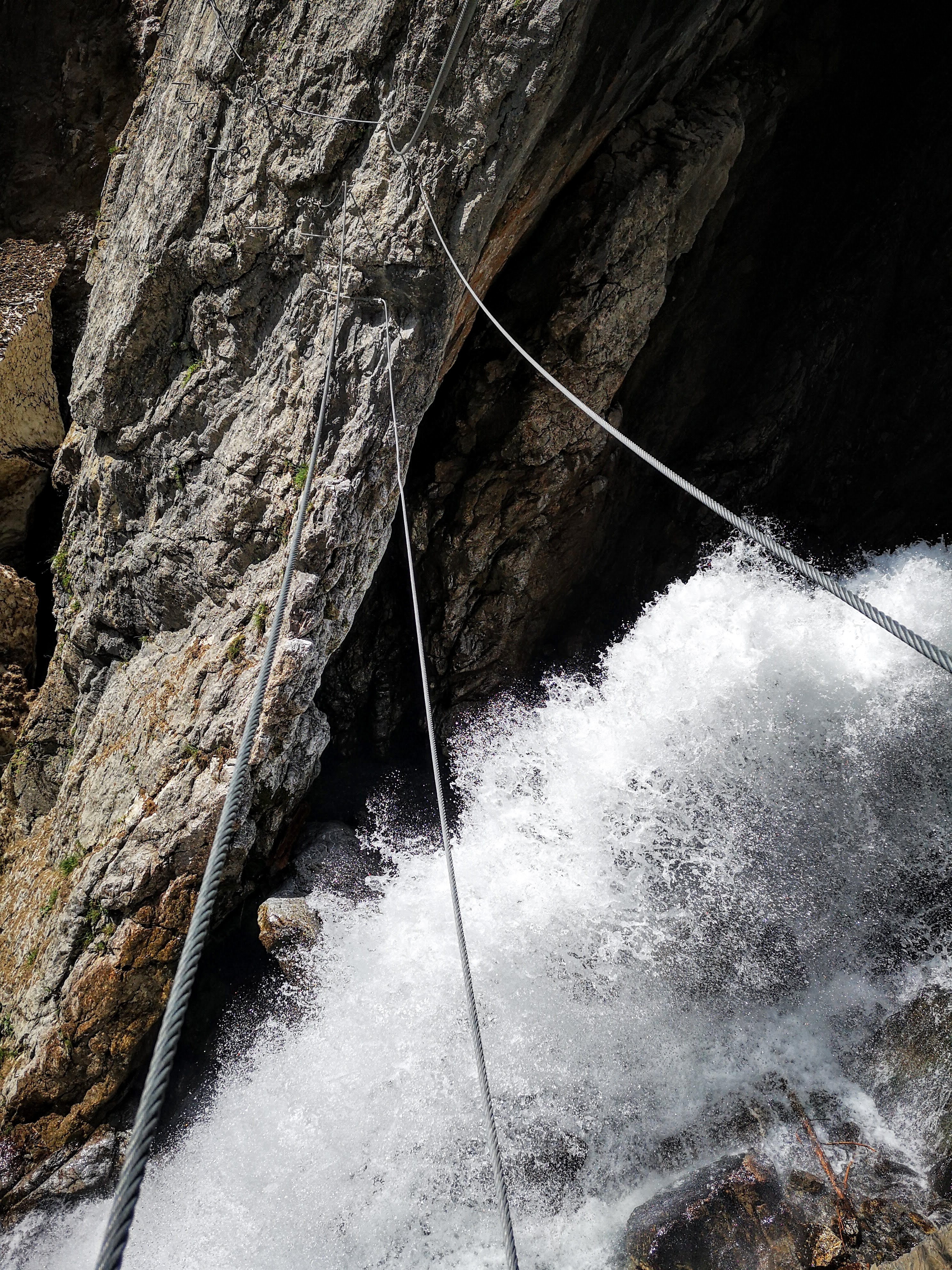 Detail Seilbrücke 1: bei den Schmelzwassermassen am 12. Juli hab i glaubt, mi reissts owi – fast nasse Zehen kassiert. Da woar da PULS echt moi auf 1 6 9 – a bissi sehr lose bzw frei schwingend sans, de Seile…