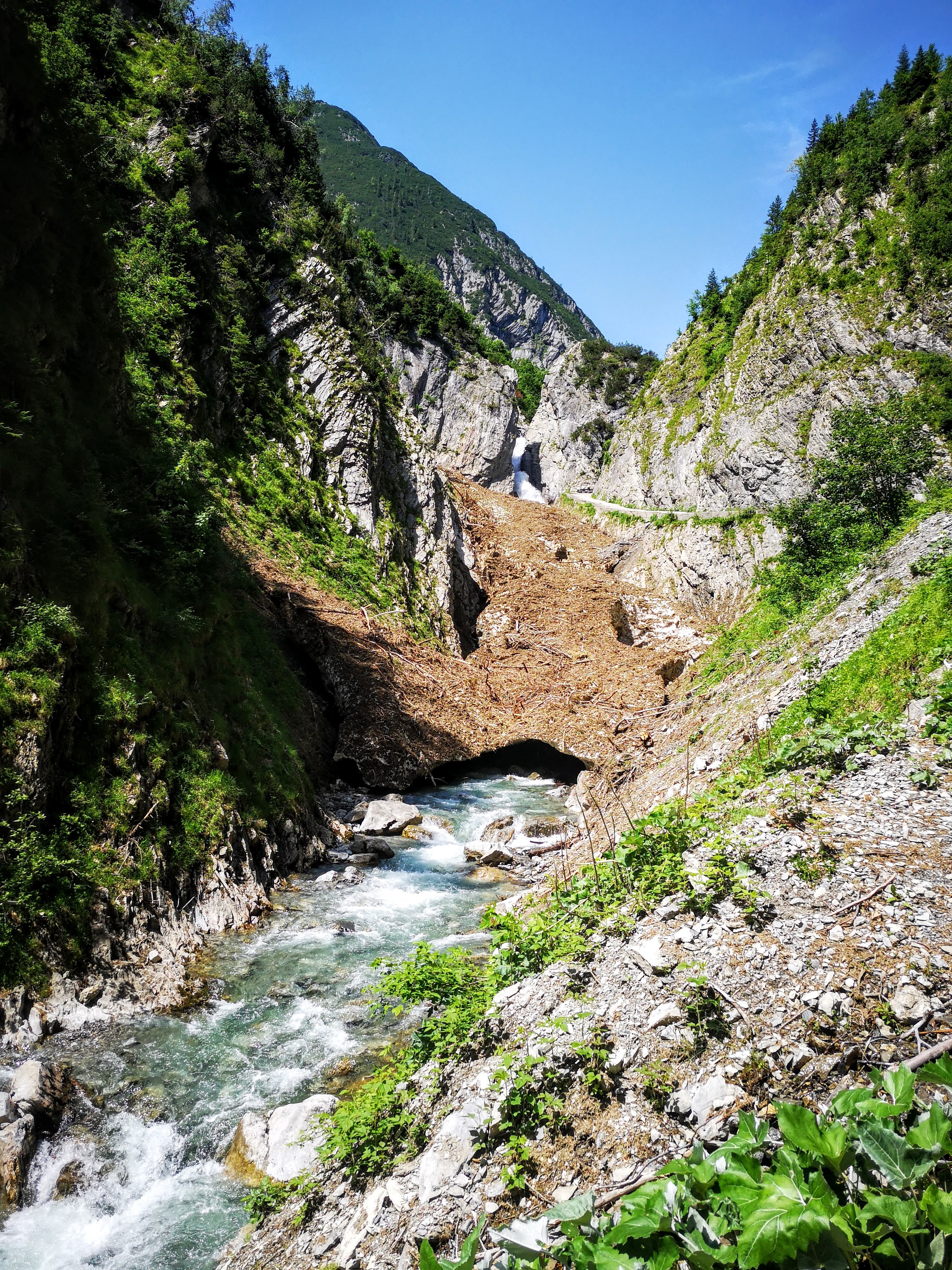Statt der Adlervariante geht’s für mich auf der Nordseite retour zum Einstieg, knapp überhalb der feschn Gumpen und endlich im Schatten – selten so geschwitzt… PS: Blick zurück beim Abstieg – der Wasserfall und der Rest vom Lawinenfest. Wahnsinn, was do nu an Altschnee & mitgrissenen Holz de Schlucht versperrt…