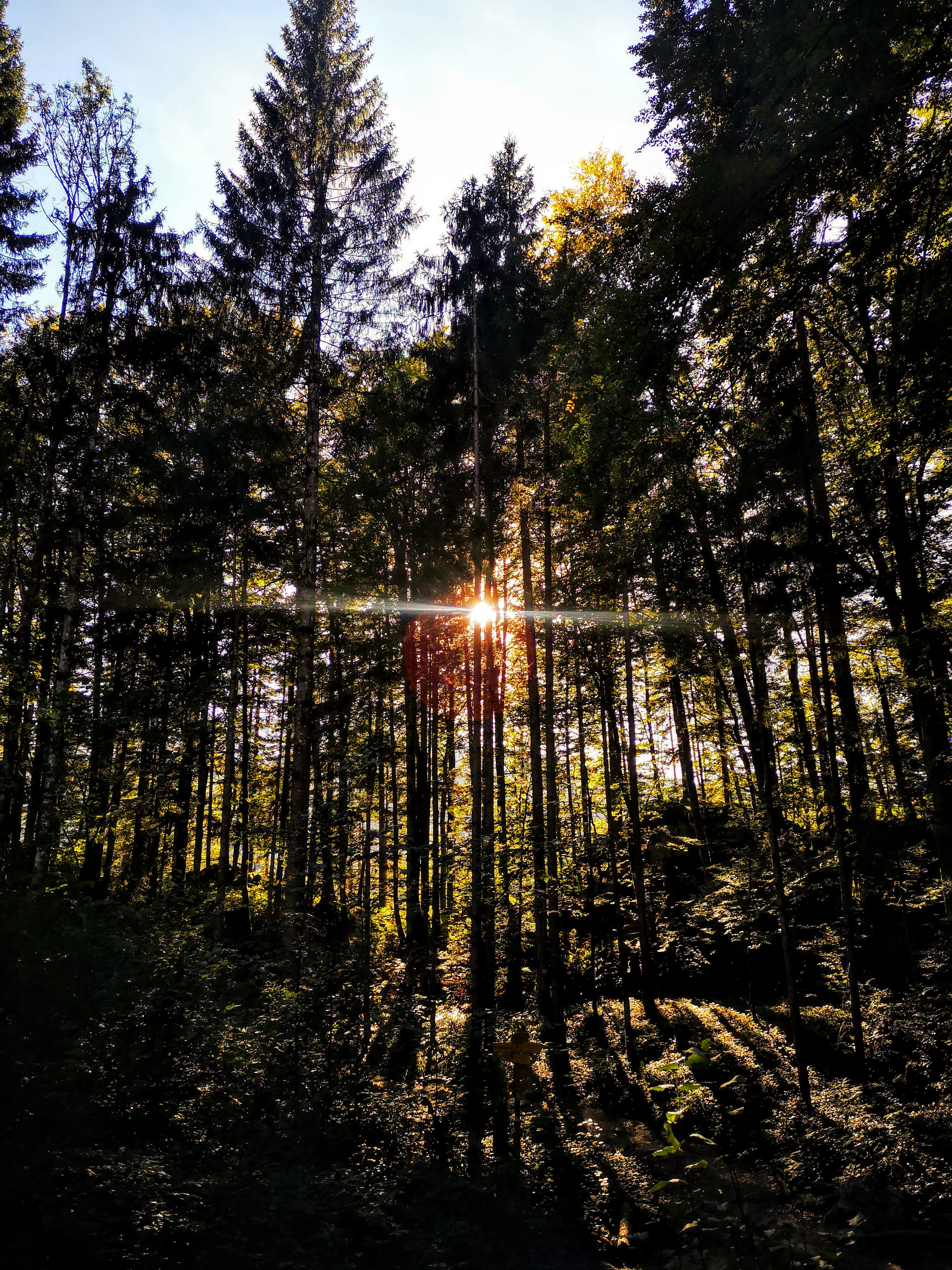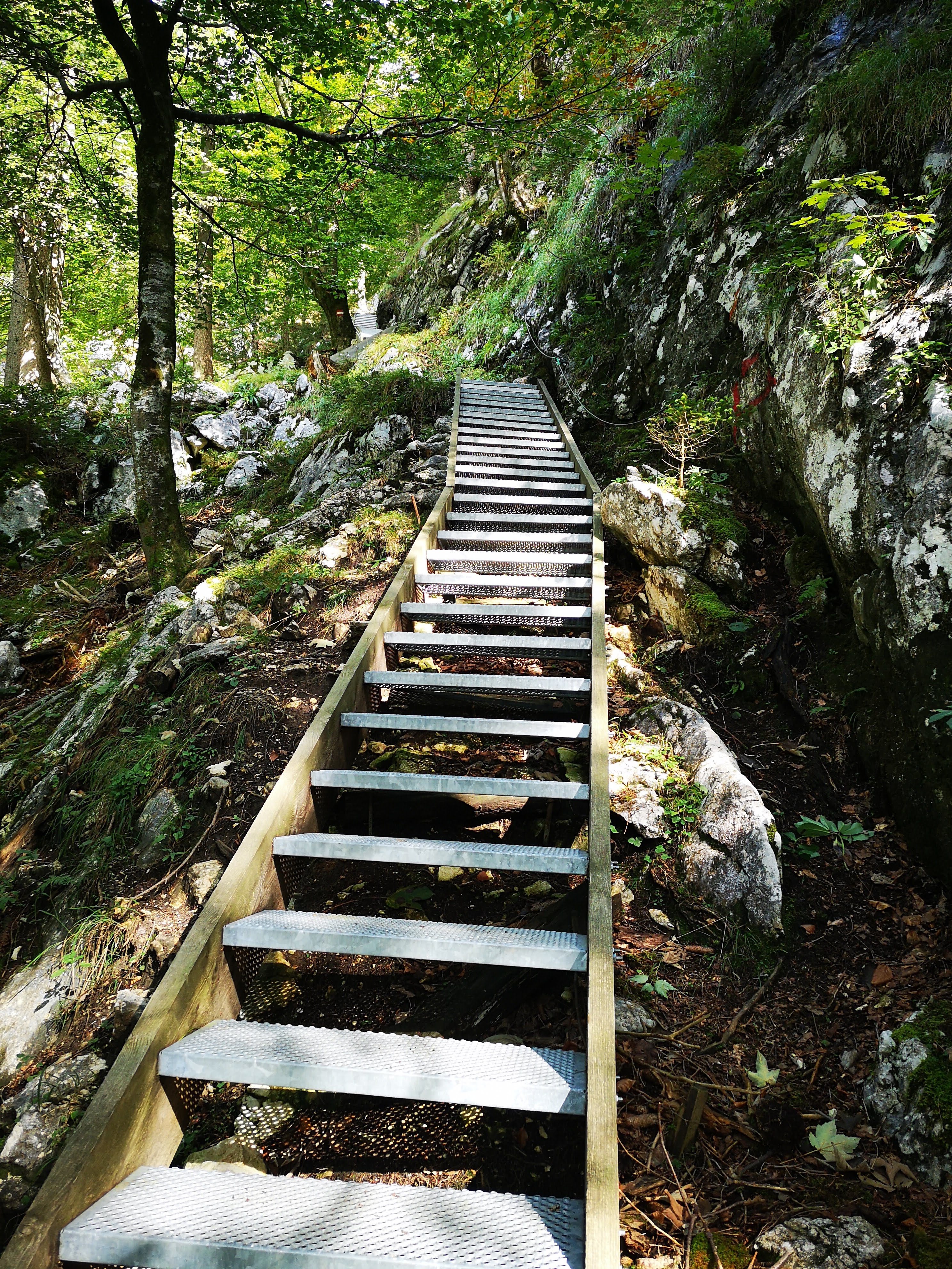 Ein kurzes Strassenstück, bevor der Wanderweg in den Wald abzweigt. Es herbstlt, am ersten Kletterfelsen ist gut was los, das zu überquerende Bachal plätschert munter – der Anfang des Wegerls könnte schöner nicht sein. Schnell gewinnt man an Höhe und dann – steh ich vor einem Stahlungetüm. Eine überdimensionierte Aufstiegshilfe mit zusätzlicher Seilversicherung, die fast die Ausmasse einer Rolltreppe hat. Und weiter oben noch ihr kleiner Bruder. Oarg. Mehr fällt mir dazu im ersten Moment nicht ein. Und mit jedem Schritt nach oben frage ich mich – warum? Erstens ist es dort weder ausgesetzt noch technisch anspruchsvoll. Erinnert mich etwas an den Aufstieg zur Rinnerhütte am Offensee – dort sind die Stahltreppen aber durchaus sinnvoll und bei dem Geländeabschnitt angebracht. Überversichert, aus Grund? Notwendig weil der Mozartblick der Sound of Music Busse nahe liegt? Einfache Lösung statt naturnaher Option? Kostenfaktor? Soll sich jeder seine eigene Meinung bilden. Weiter oben wieder Waldboden, Holzstiegen – einfach a schöner, roter Wanderweg. Auf den letzten Höhenmetern kann man sich für eine kurze schwarze Variante entscheiden (bissl ausgesetzter, felsig) oder auf rot bleiben. Jeder wie er mag. Oder eine rauf, die andere runter – viel Unterschied in der Länge macht es nicht aus.