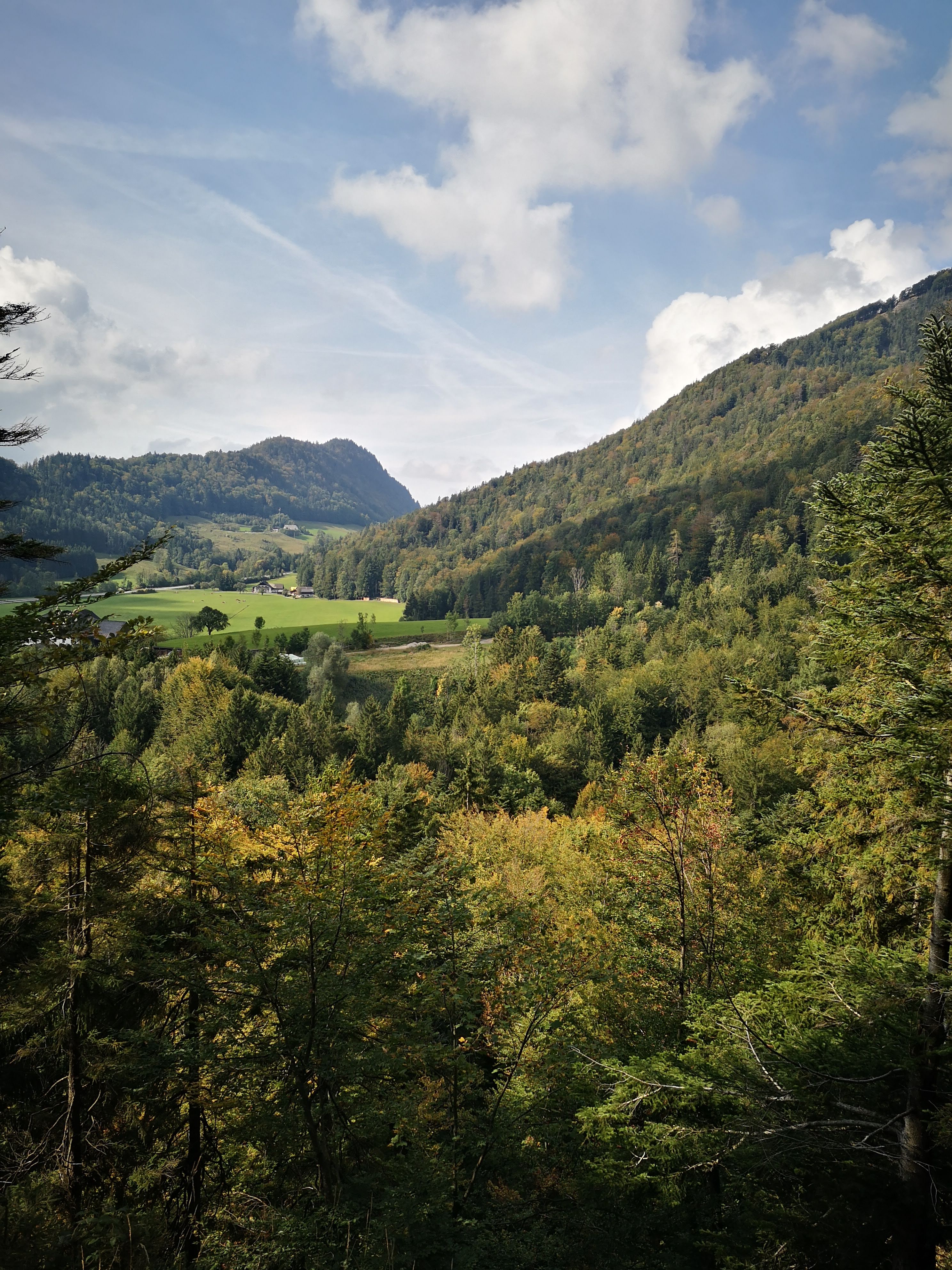 Auch wenn der Blick diesig war an dem Nachmittag, es war kaum mehr oben – a gschmohs Platzal wia mia Goiserer sogn datn (gschma sagns am Wolfgangsee). Links der Schafberg, rechts das Zwölferhorn. Bleckwand, Sparber, Postalm- & Katergebirge. Normalerweise ist natürlich mit mehr Leuten zu rechnen, weil doch ein begehrter und einfach erreichbarer Aussichtspunkt. Am Weg retour wähle ich unten am Bachal die Variante über den Staffelgraben. Fast schon wildromantisch mit dem kleinen, Wasserfallartigen Bachlauf und nett zu gehen.