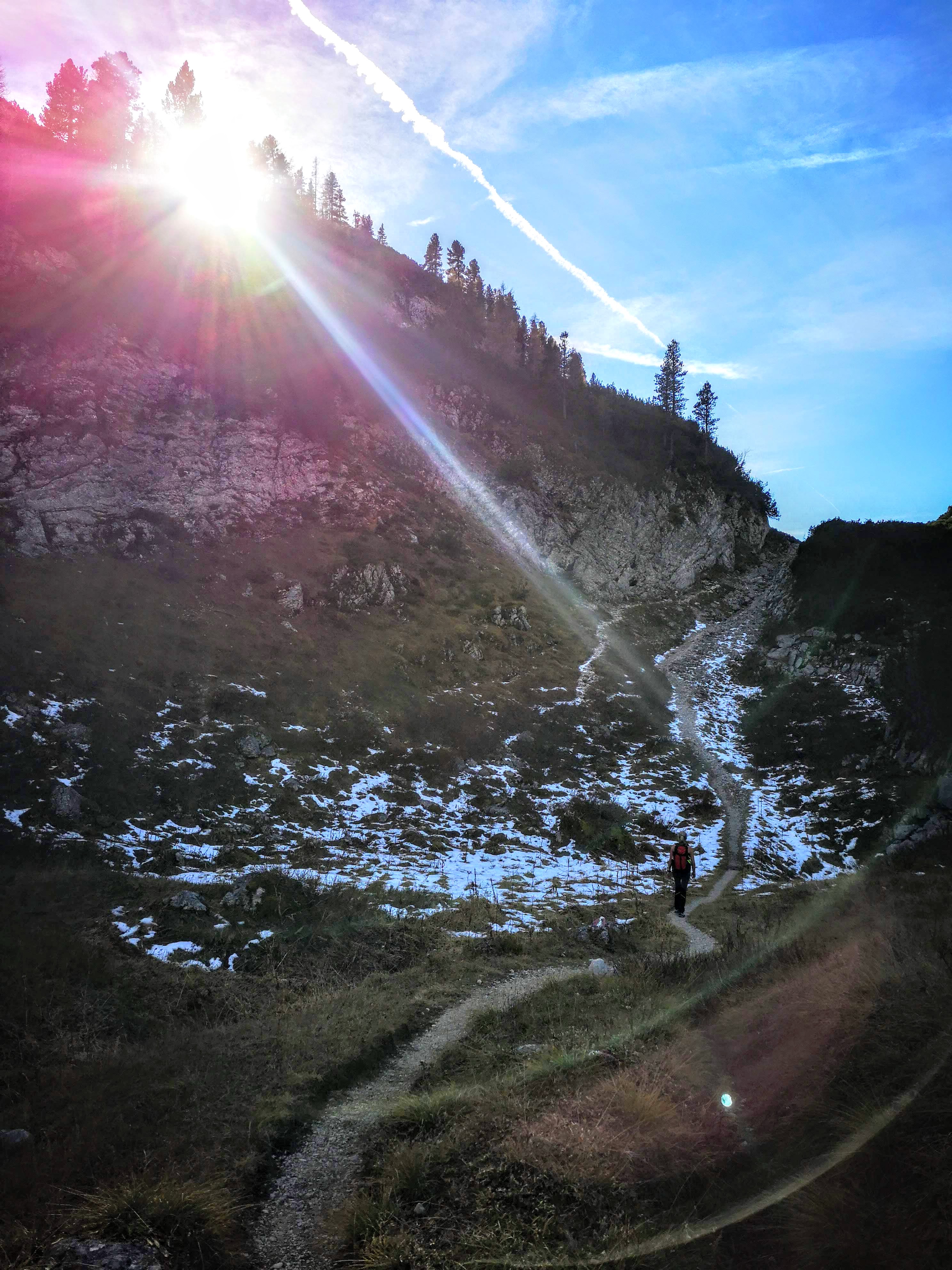 Bei einstelligen Minusgrade werden die Schritte morgens von ganz alleine schneller. Nur, um kurz darauf den ersten ungeplanten Stopp einzulegen. Kurz vor Sonnenaufgang sehen wir Rot. Morgenrot. Und zwar so farbgewaltig, wie ich es noch nicht bei uns gesehen habe… Da braucht es keine Worte. Ca 3km sind es bis zum Talschluss, für den weiteren Aufstieg bis zur Rinnerhütte brauchts die übrigens auch nicht. Erstens bereits genau beschrieben hier am Blog, zweitens spendier ich lieber aktuelle Fotos davon. Aufstiegs-Möglichkeit gibt’s ohnehin nur eine, rot markiert. Interessant aber, dass dank Inversion die Temperatur bereits auf ca 800m plus 8 Grad hatte – 10 Grad mehr als beim Start am See. PS: in der Schotterriesn Querung stehn die Gams gerne zum frühstücken…