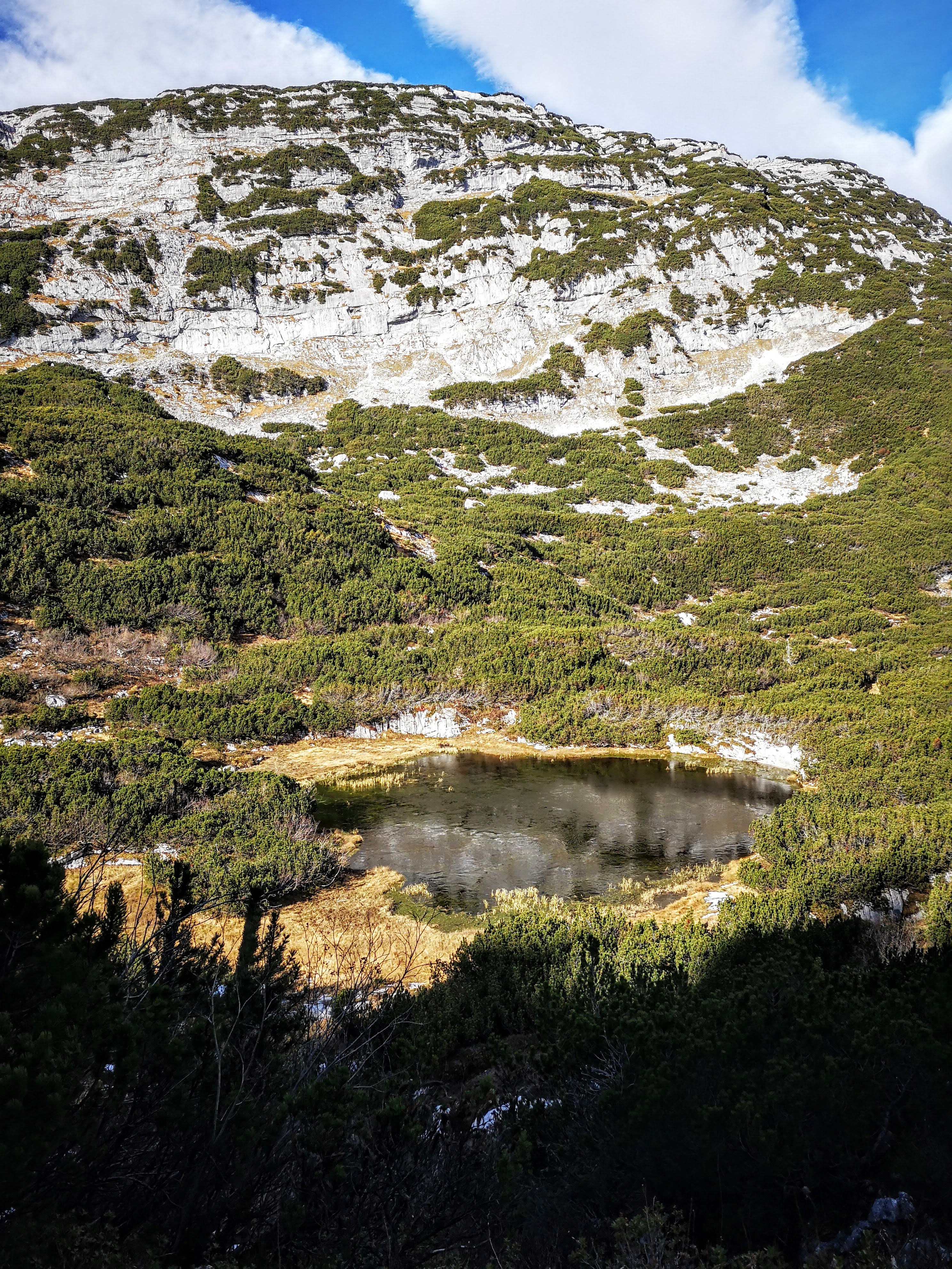 In diesem Fall: koa Sünd, koa Netz und koa offene Hütte. Sich einfach zu einer der privaten Almhütten (egal ob Terrasse oder Hausbankl) zu setzen, ist sowieso ein Unding. Zumindest verstehe ich nicht, warum man das macht. Am Appelhaus gibts ohnehin die Möglichkeit für a kurzes Rastl – und bitte nehmts dann euren gesamten Müll a wieder mit ins Tal! Oben werden die Optionen rundum gecheckt, im Sommer muss dann dochmal a Übernachtung oben drin sein – so viele interessante Steigaln, Gipfel und Varianten zum gehen und erkunden. Das Sonne etwas länger geniessen hält sich windbedingt in Grenzen, die Hälfte der Wegstrecke wartet noch immer und die Zeit läuft ohnehin. Also Aufbruch und weiter geht’s zur nächsten Alm auf der Augstwiesen. Neben alten Almhütten warten dort auch einige neu gebaute, die mehr die Dimension eines Chalets haben. Dass es so viele sind, habe ich ehrlich gesagt auch nicht erwartet. Der Weg schlängelt sich mitten durch, bergab in den Almboden und dann zum letzten Mal bergauf für heute – zum Hochklapfsattel auf 1498m. Vorbei an einer kleinen Lacke, die sich nicht immer zeigt: dem Augstwiessee!