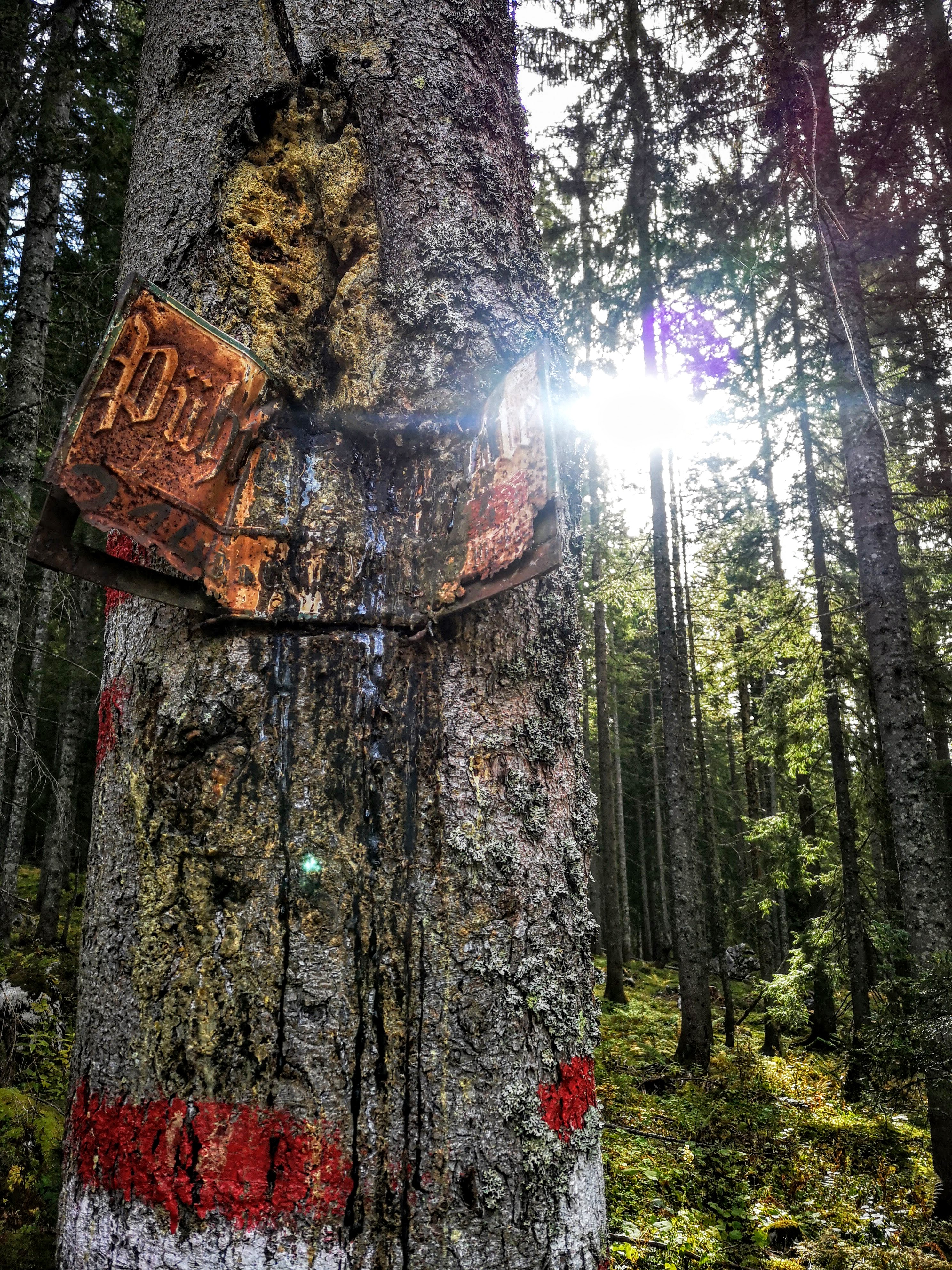 Vom Wanderparkplatz in Schachen führt der Ausseerweg stetig ansteigend tief ins Tote Gebirge. Ein kurzes Stück Forststrasse, 2 Forststrassenquerungen zwischendrin, großteils schöne alte Waldwege oder schmale Steige mit alten Marterln und schilderfressenden Bäumen. Vorbei am Kanzlermoos immer weiter bergauf. Genau am Draußengatterl auf 1380hm beginnt das Natura 2000 Schutzgebiet – klar gekennzeichnet mit 2 Schildern. Früher wurde dieser Platz auch gerne „Grausengatterl“ genannt, obwohl es gar nicht so grausig ausschaut (finde ich). Vermutlich wegen seiner scheinbar gefährlichen, exponierten Lage – der Durchgang ist aber nur an einer Stelle schmal und etwas ausgesetzt. Die links eingezogene Seilversicherung ist bei Nässe sicher wertvoll! Ab hier ist übrigens auch erstmals der weitere Wegverlauf via Lahngang & Schafbühel ersichtlich.