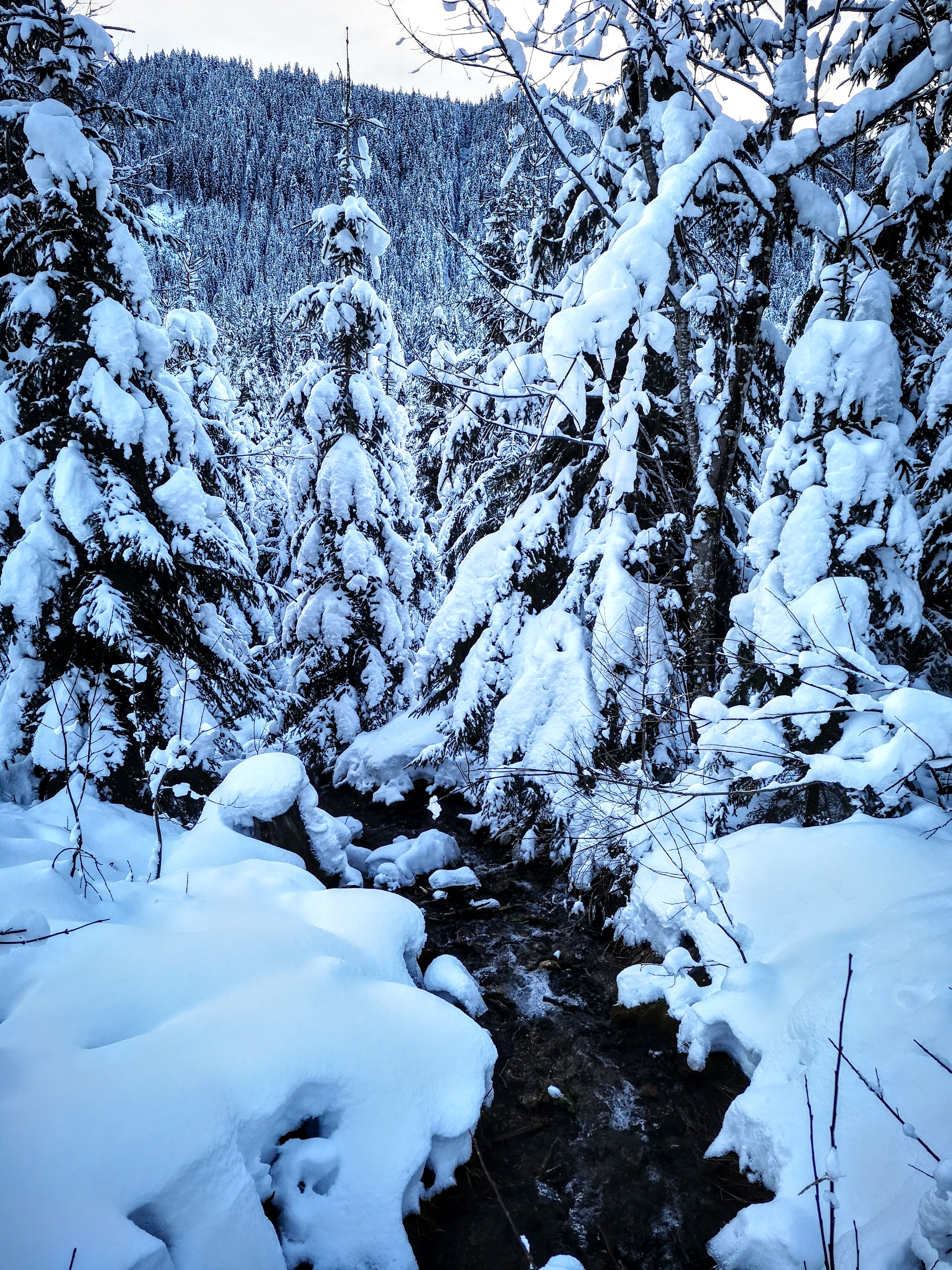Wenn man freiwillig bei Minusgraden vom sonnigen Gosauer Vorder- & Mittertal ins Hintertal fährt, um dort im Schatten spazieren zu gehen – dann hat das einen Grund. Entweder: Vampir. Oder: man liebt den Winter und die Kälte. Letzteres wär dann bei mir der Fall. Vorneweg: es ist egal, ob man die Runde im- oder gegen den Uhrzeigersinn geht. Ich starte ggü vom GH Gosauschmid und folge dem Georundweg ri Stausee, über dem zu dieser Zeit auch die Sportloipe (UPDATE Saison 22/23: dort wird keine Loipe mehr präpariert) führt. Bitte deswegen auf die Langlaufspur aufpassen und diese nicht betreten – danke! Vorbei am Zustieg zu den Laserer Alpin Klettersteigen (Wintersperre), den rauschenden (Brunn)Bächen, weiter zur Karstquelle „Waller“, die genau unter der Holz-Brücke zu Tage tritt und bergab in Richtung Kraftwerk. Dort gibt es einiges zu entdecken – wer sich beim Spazieren gehen umschaut und die Augen für die Natur öffnet, dem werden auch besondere Einblicke gewährt… Den Wegmarkierungen folgen, über den im Moment laut tosenden Gosaubach und nach der Strassenquerung tauche ich direkt wieder in einen Winterwunderwald ein, der schöner nicht sein könnte…