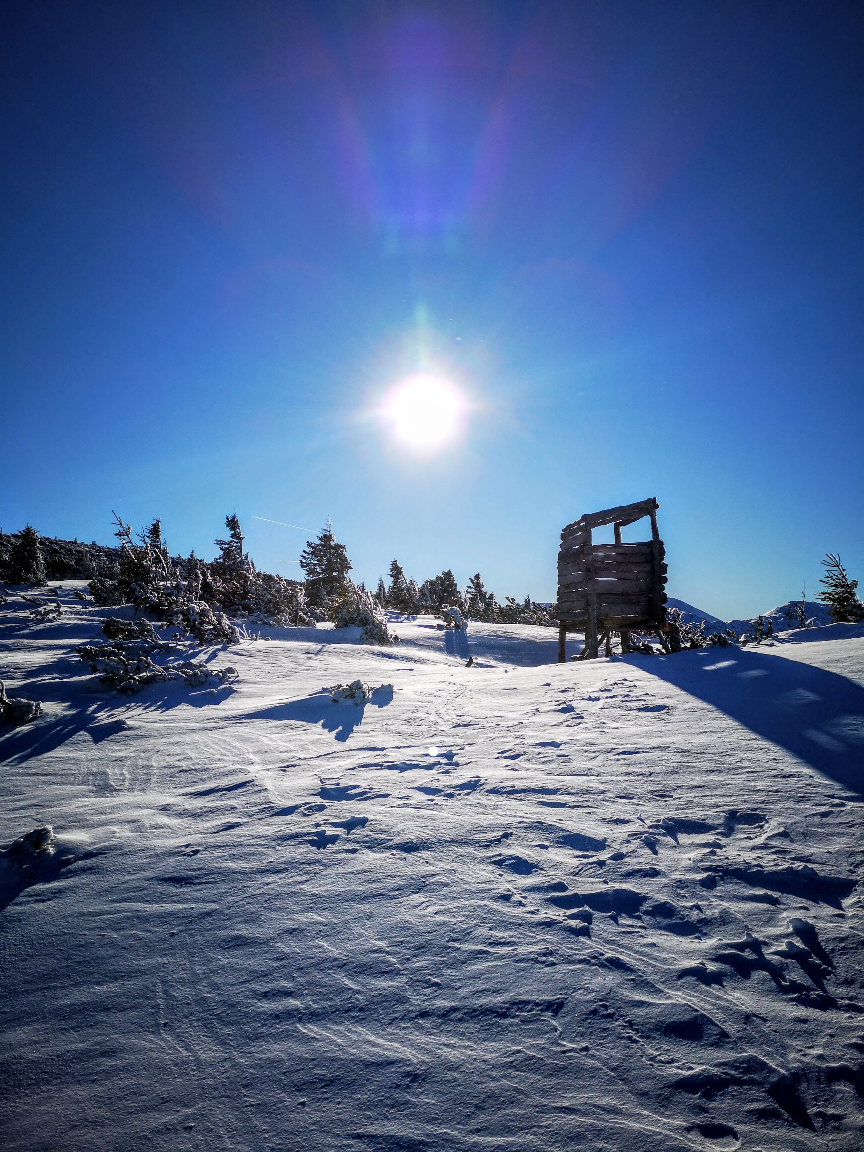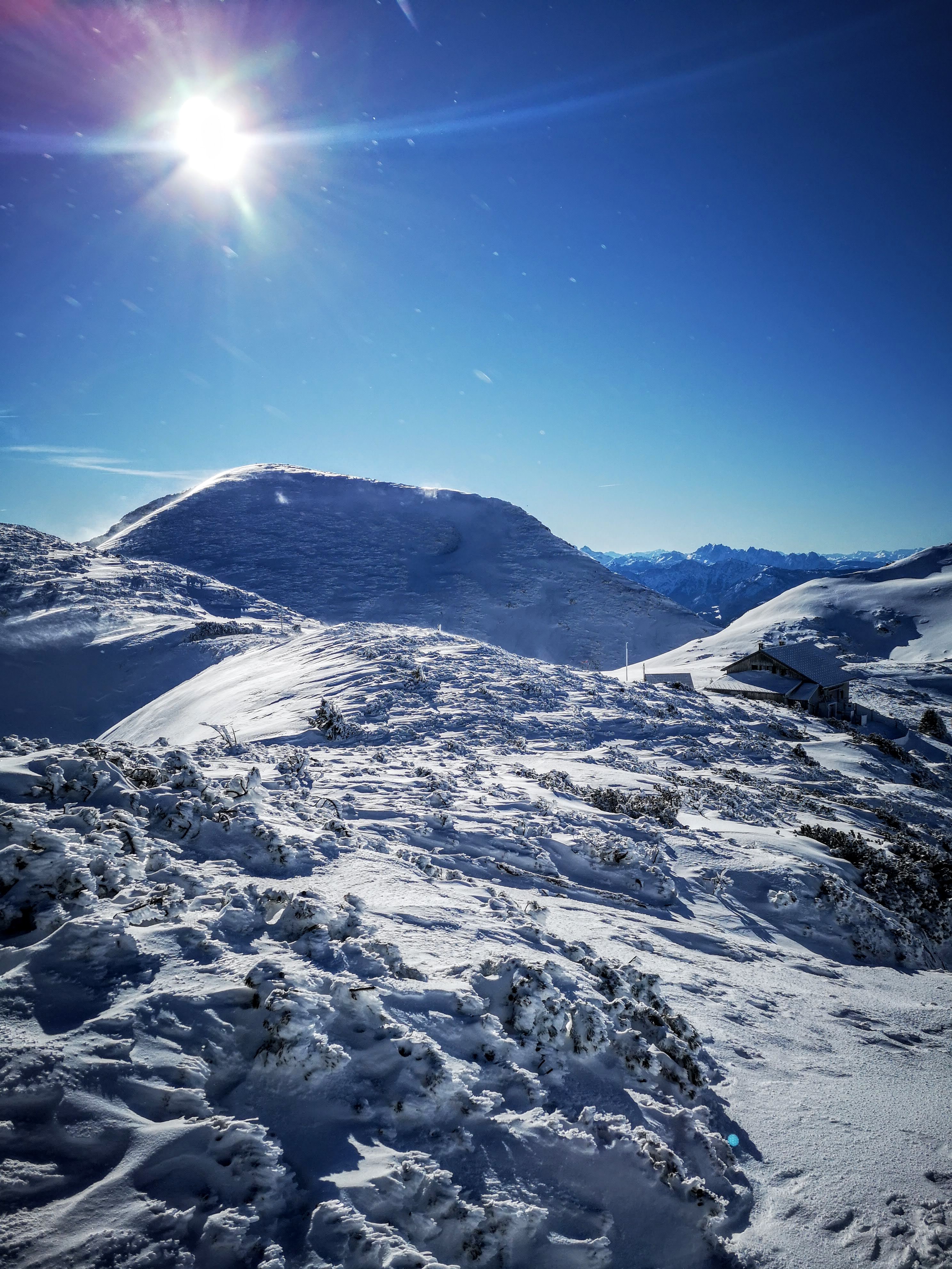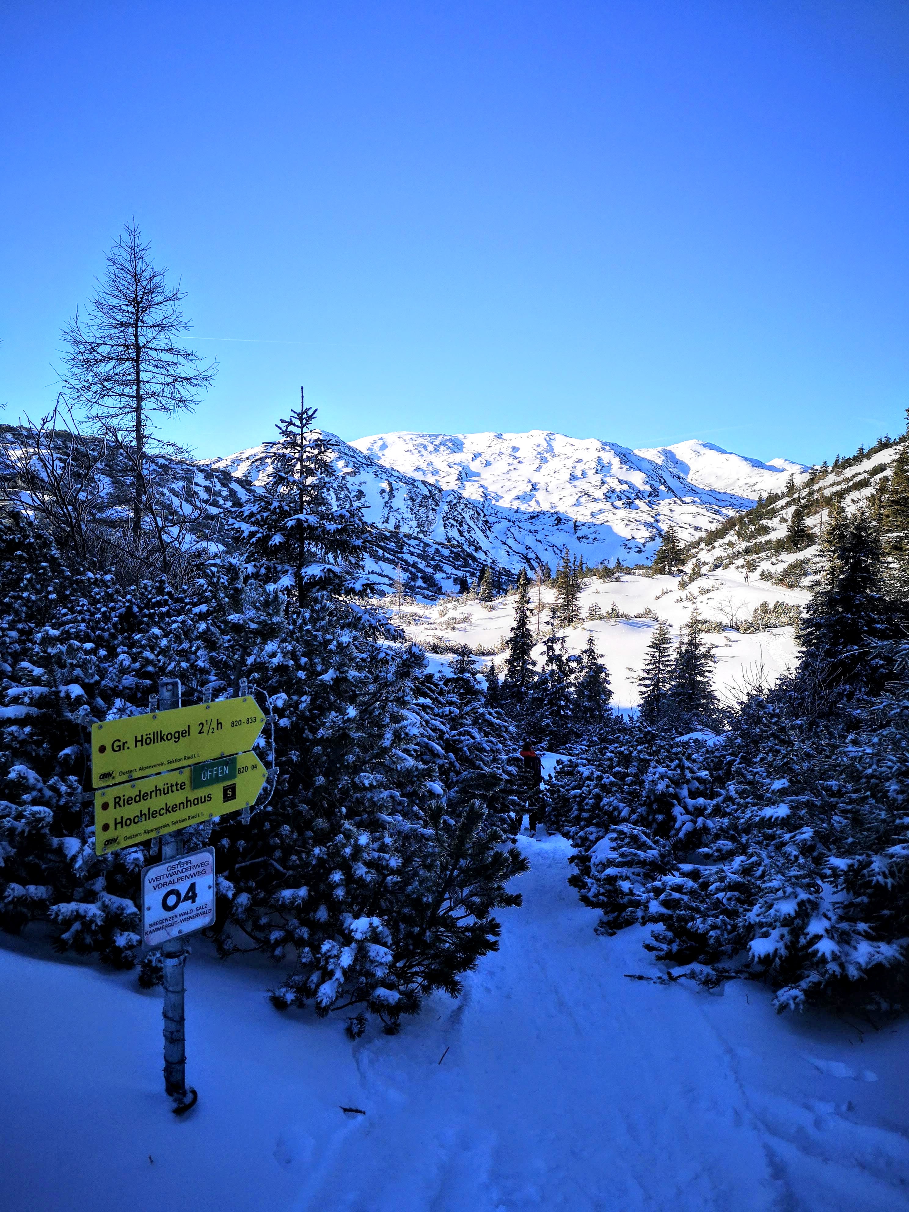 Windzeichen und sichtliche Sturmfahnen am Gipfel – so schee & so aufschlussreich… Nit ohne Grund wird Wind als Baumeister der Lawinen tituliert. Wichtig- gilt auch für markierte Routen: über die aktuelle Lawinenlage informieren, Tourenplanung machen, Ausrüstung mitnehmen, Wetterumschwünge beobachten und eigenverantwortlich handeln. Wer das nicht kann, bucht sich am besten eine geführte Tour! Das Feuerkogel Skigebiet übernimmt keine Haftung! Egal ob Schneeschuh- oder Skitour. Die Riederhütte ist übrigens nur bei Schönwetter offen – herrscht hohe Lawinenwarnstufe, Schlechtwetter oder eingeschränkte Sicht, ist sie geschlossen. Genauso wie die Trails. Spätestens an der Feuerkogel Bergstation sollte man checken, ob die Hütte geöffnet ist!