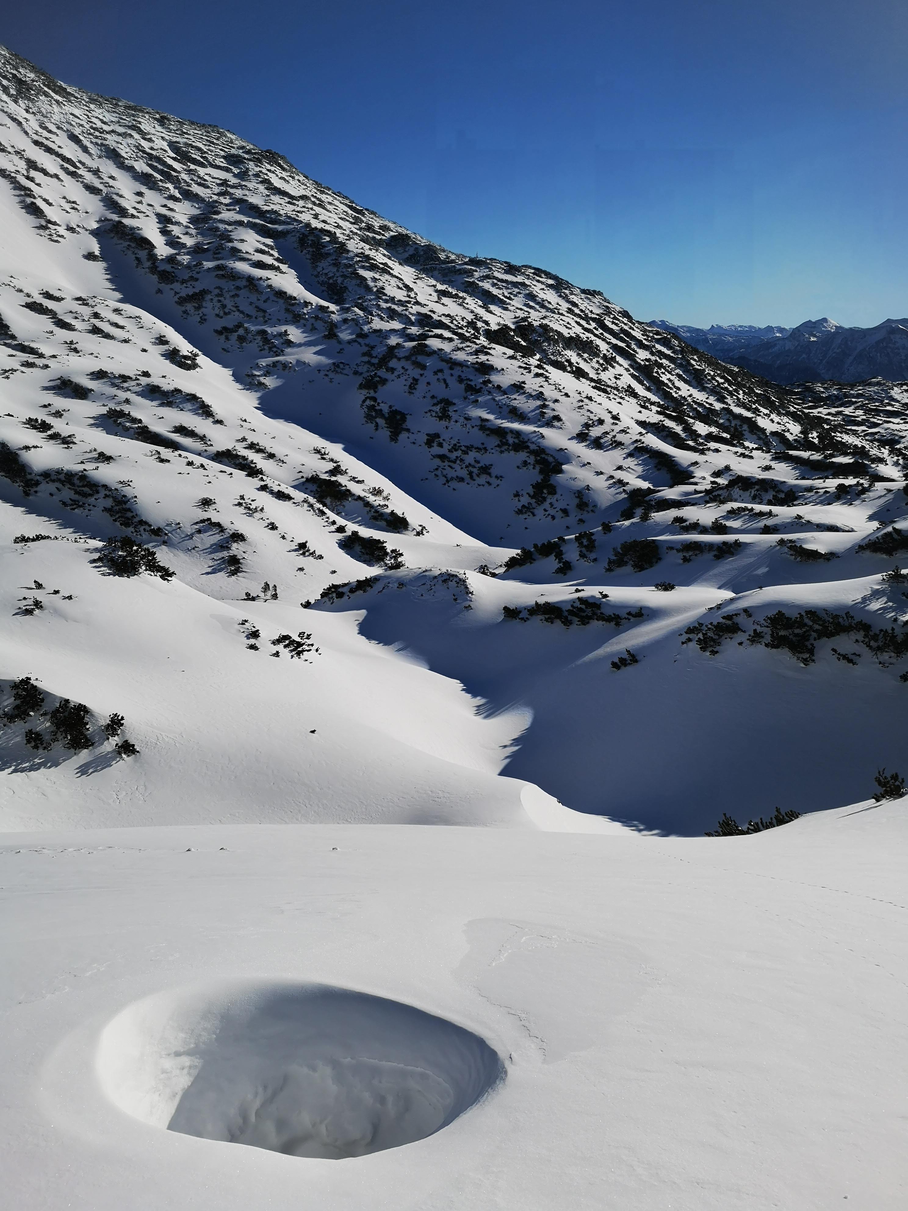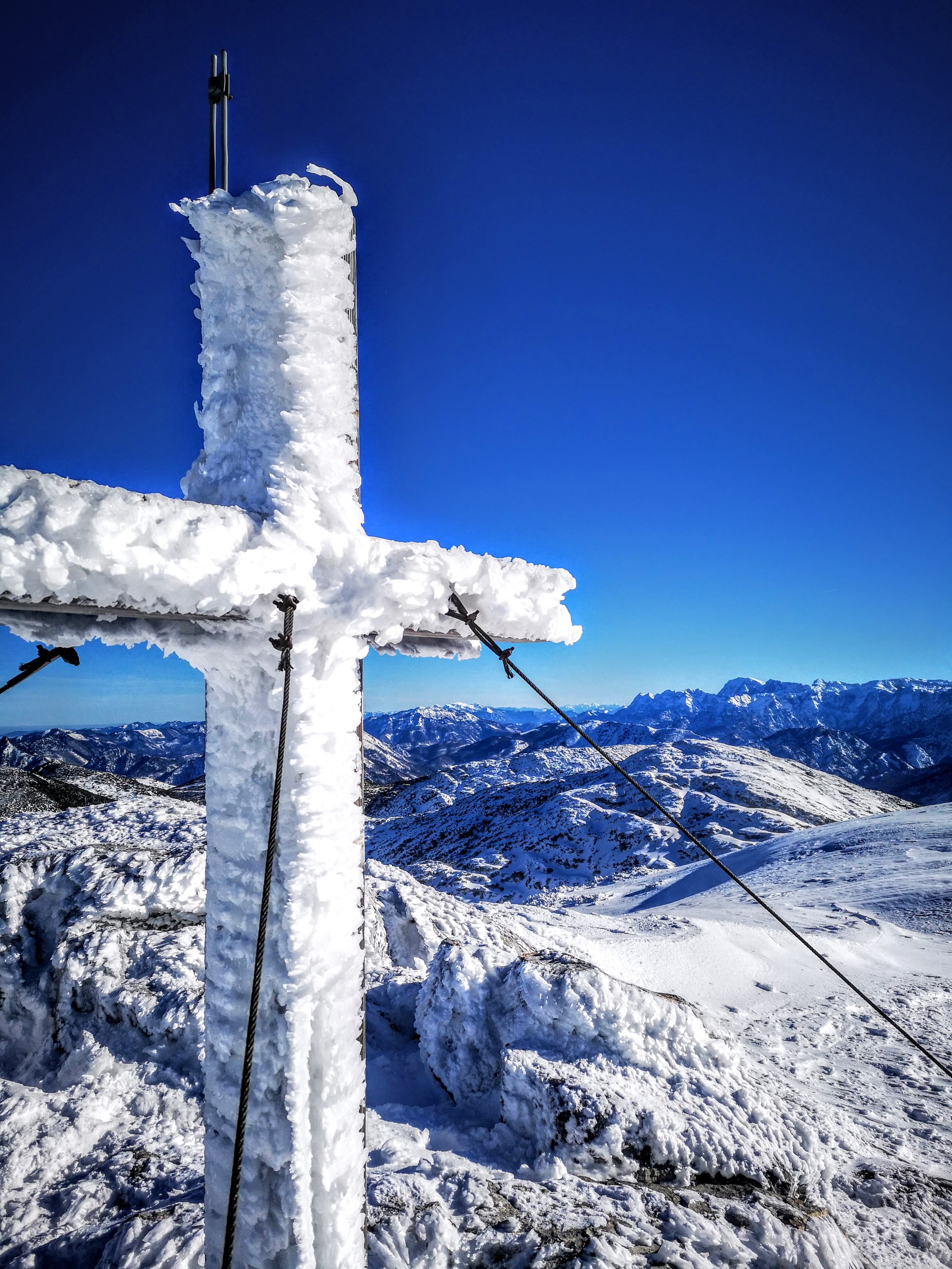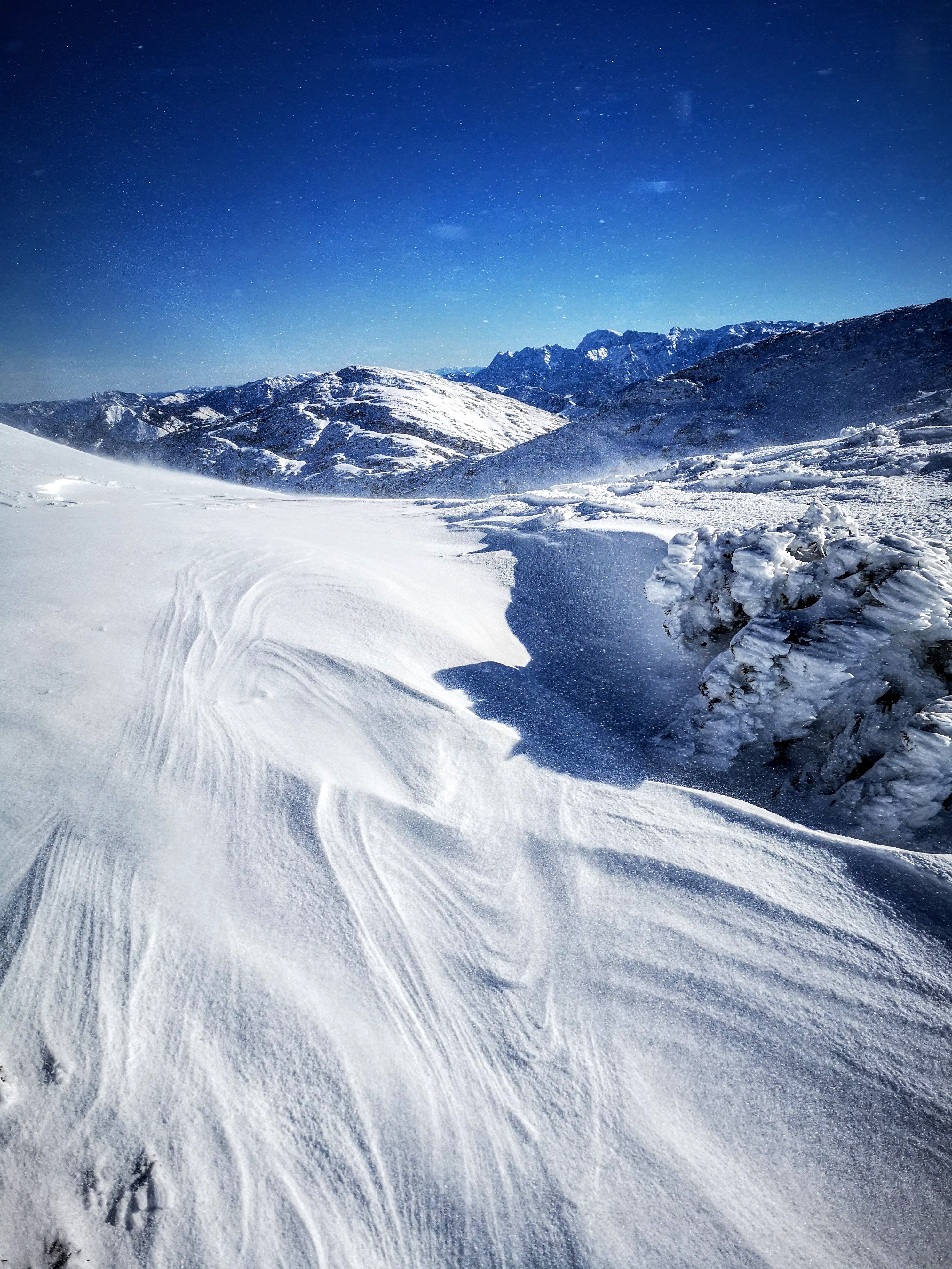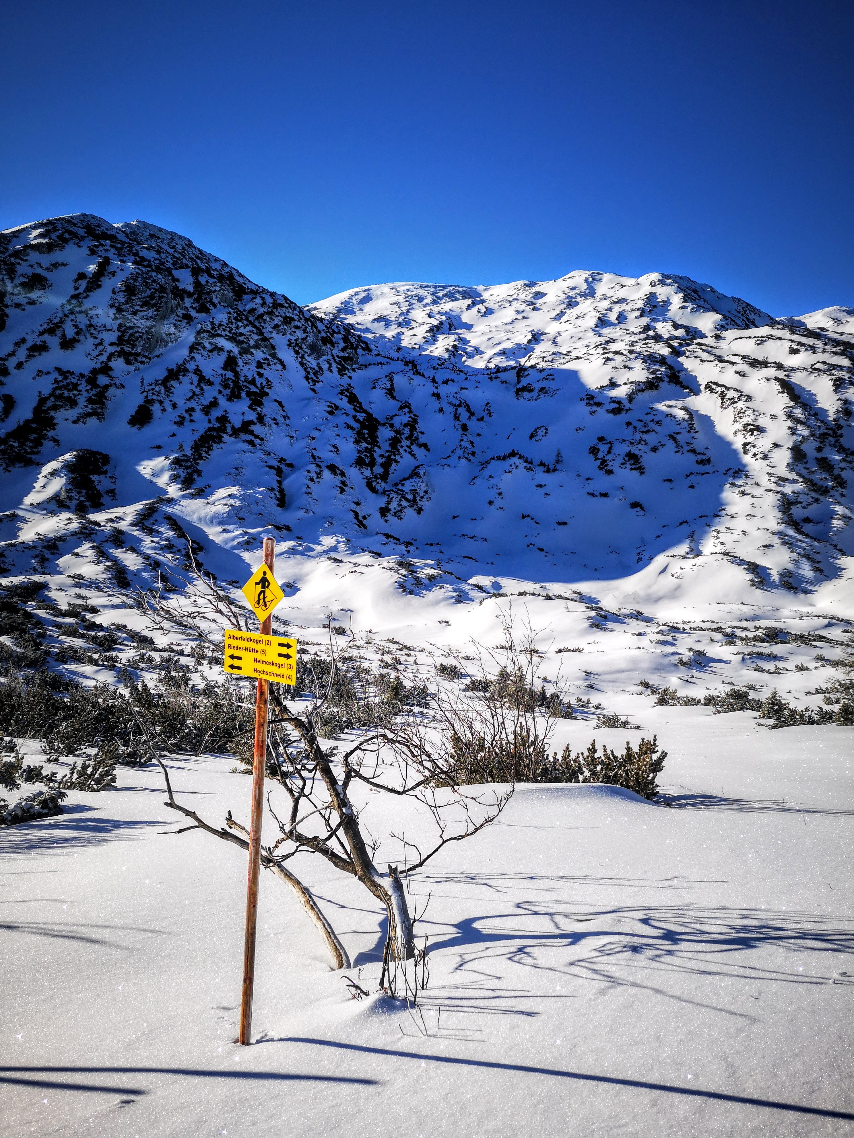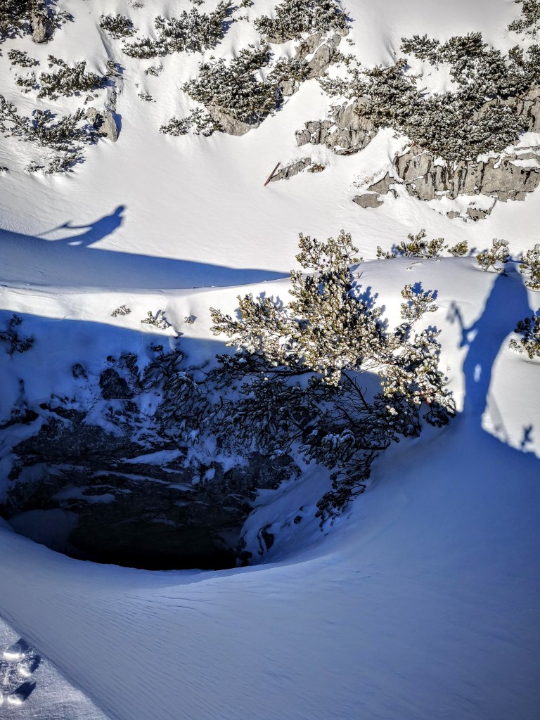 Am Feuerkogel noch sonnig & warm – im Ofental tlws schattig und vor allem eins: windig bis stürmisch! Trotz fetzblauem Himmel! Ohne Vorwarnung in der Prognose. Aber vorneweg gesagt: wenn die Hölle so ausschaut, dann passt des fia mi! Vom Hüttendorf weg gehts immer leicht bergab, bis man den gesicherten Skiraum verlässt. Wie man auch vor Ort sieht, halten sich leider nicht viele an das Betretungsverbot der Trails mit normalen Schuhen. Dementsprechend ramponiert schaut dieser zu Beginn aus – aber nur bis zur Abzweigung Alberfeldkogel. Dort beginnt dann das typische Karst Auffi, Owi & Auffi. Im Winter zwar bissi weniger anstrengend als im Sommer – aber auch nur, wenn man mit Ski unterwegs ist. Abfahren mit Fell ist aber halt auch nicht so fesch. Trügerische Sicherheit – die Trails führen auch vorbei an tiefen Dolinen, die nur sporadisch eingeweht sind und teilweise noch weit offen klaffen. Bei schlechter Sicht möchte man generell im Höllengebirge nicht unterwegs sein (genauso wie am Krippenstein oder im Toten Gebirge). Wunderschöne Windzeichen, Anraum und gefrorene Latschen. Glitzernder Schnee. Von eng zu endlos weit öffnet sich das Ofental.
