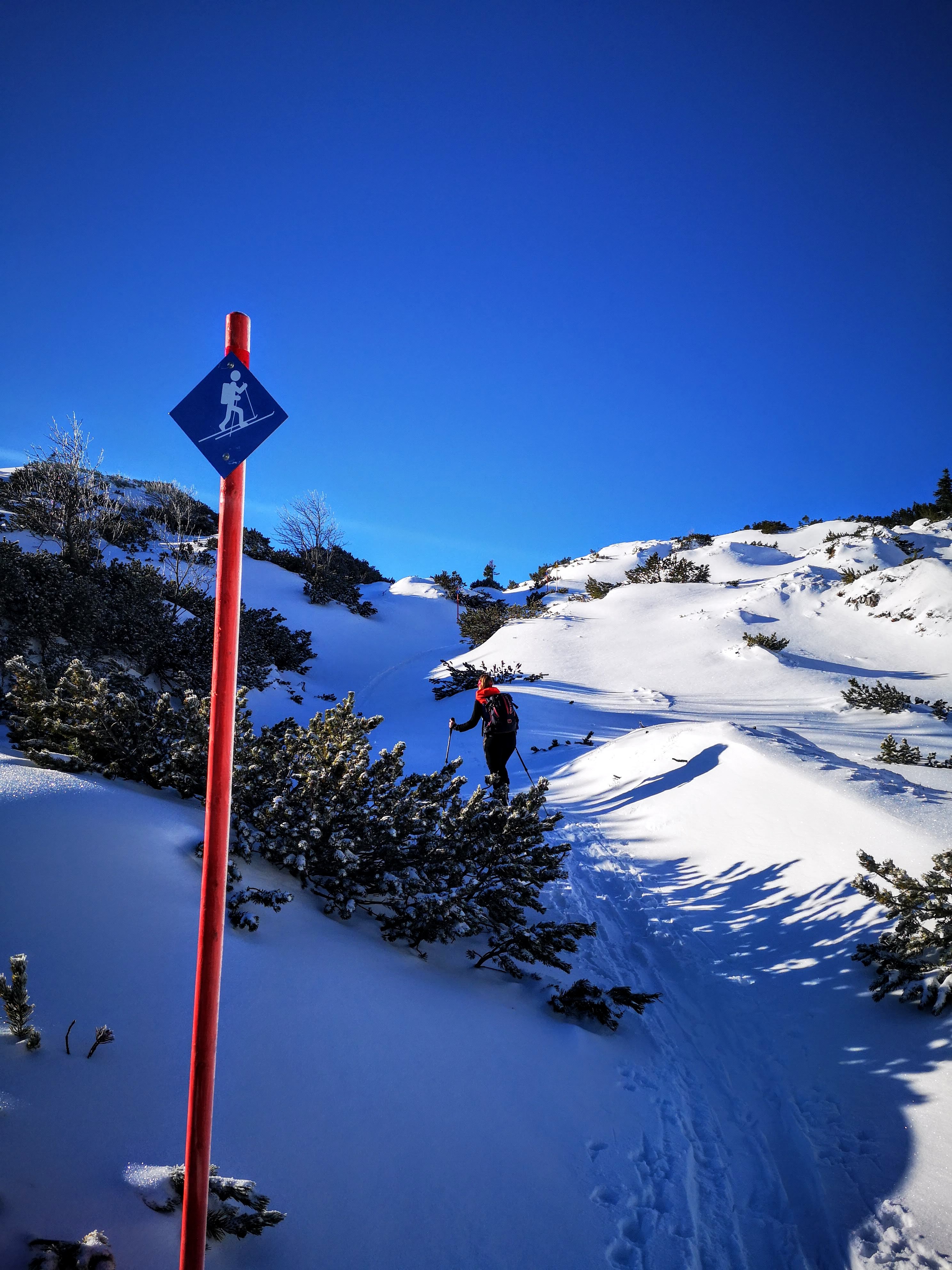 Trails bzw Skitourenrouten im ungesicherten, freien Gelände – KEINE PISTENTOUR! Komplette Lawinen-Ausrüstung (LVS, Sonde, Schaufel), vorab Tourenplanung und Beachtung des lokalen LLB (Lawinenlagebericht). Gilt auch für Schneeschuhwanderer!