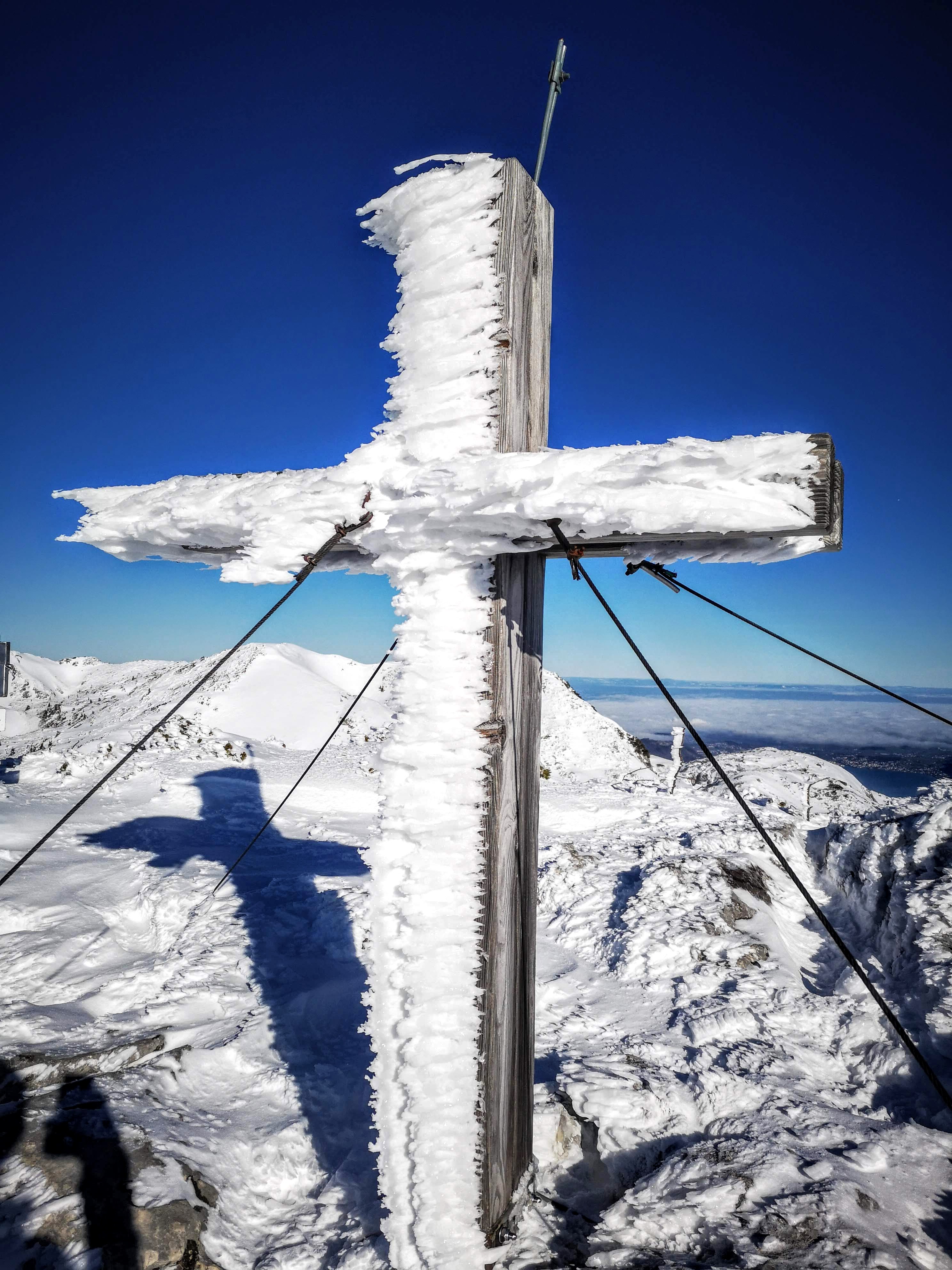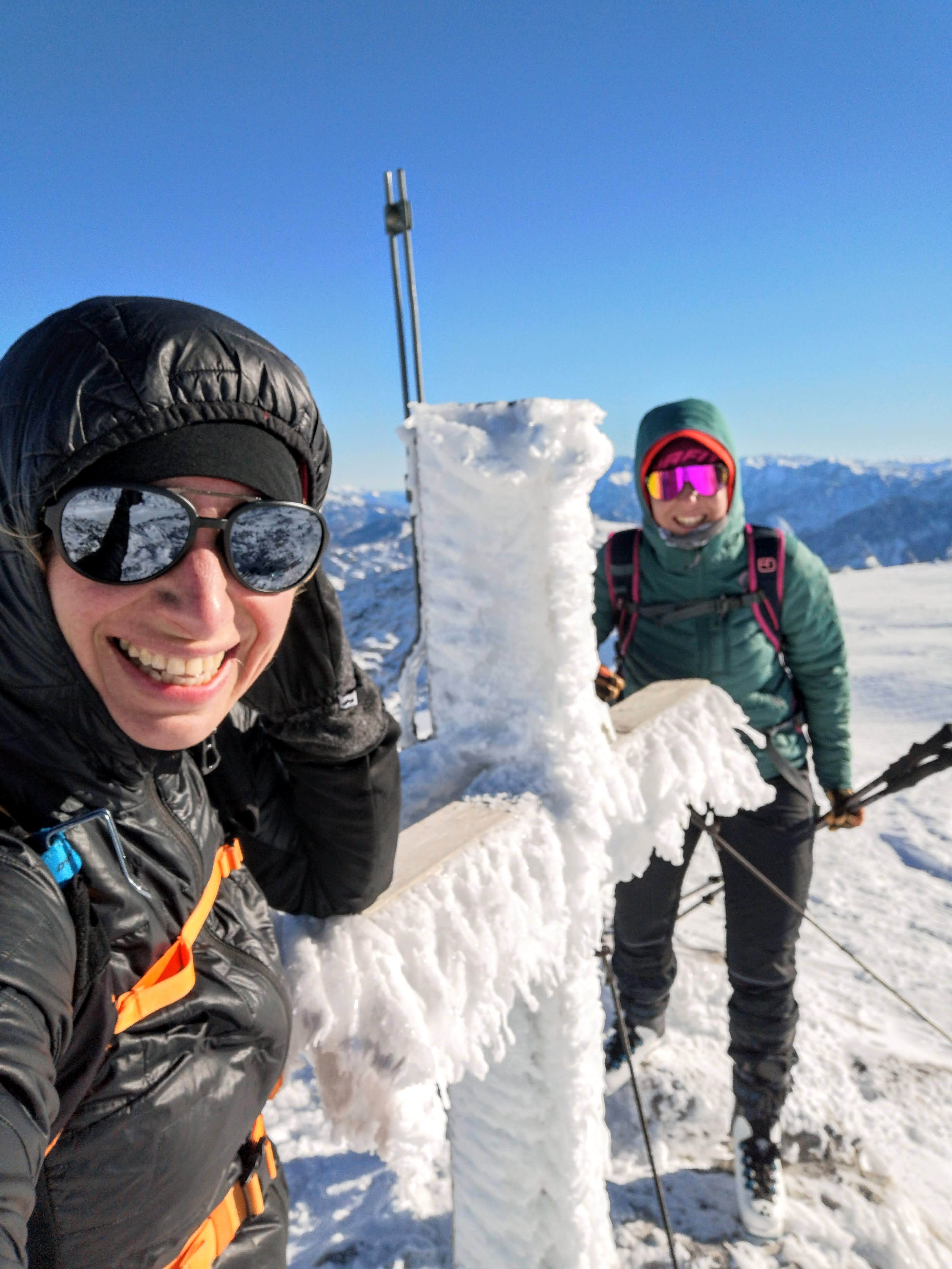 Mitten im Höllengebirge – links der markante Gr. Höllkogel 1862m. Das eigentliche Gipfelziel der Tour. Aber Bedingungen lassen sich halt immer erst vor Ort endgültig einschätzen. Dass es im Ofental so stürmt, der Gipfel sichtlich extrem abgeblasen und andererseits eisig war – keine Option. Deswegen wird die Riederhütte direkt angesteuert – die Alternative liegt fast direkt dahinter: der mittlere Kesselgupf, dessen kleines Kreuz uns ins Auge sticht. Der Sturm legt zu, aber dieser Gipfel ist machbar und fast zum Greifen nahe. Über die rechte Flanke hinter der Hütte (Harscheisen wären auch hier von Vorteil), links querend zum Kreuz auf 1818m – bedeckt mit Anraum. Dass uns da oben fast weggeblasn hat, siagt ma nit – Sturmböen vom feinsten, Kristallpeeling im Gesicht. Trotzdem: Plan B, sowas vo schee! Atter- und Traunsee, Traunstein, Feuerkogel, Totes Gebirge, Dachstein, Gosaukamm, Höllkogel… Retour zur Hütte über den gleichen Weg – ohne Abfahrt. Ein Mix aus Eis und Bruchharsch, da lohnt das abfellen für max 5 Schwünge nicht. Und ehrlich gesagt, die Ski runter tragen war an dem Tag auch die bessere Option. Aufwärmen bei Karin & Gü in der Riederhütte, a gscheide Rindssuppn mit Frittaten oder Kaspressknedl (ja, gibt auch Gemüsesuppe) und an warmen Topfenstrudel mit Schlag hinten nach. Weil: retour wartet das gleiche Auf- und Ab. Evtl a bissi mehr ab als auf. Abfellen lohnt sich aber nicht!