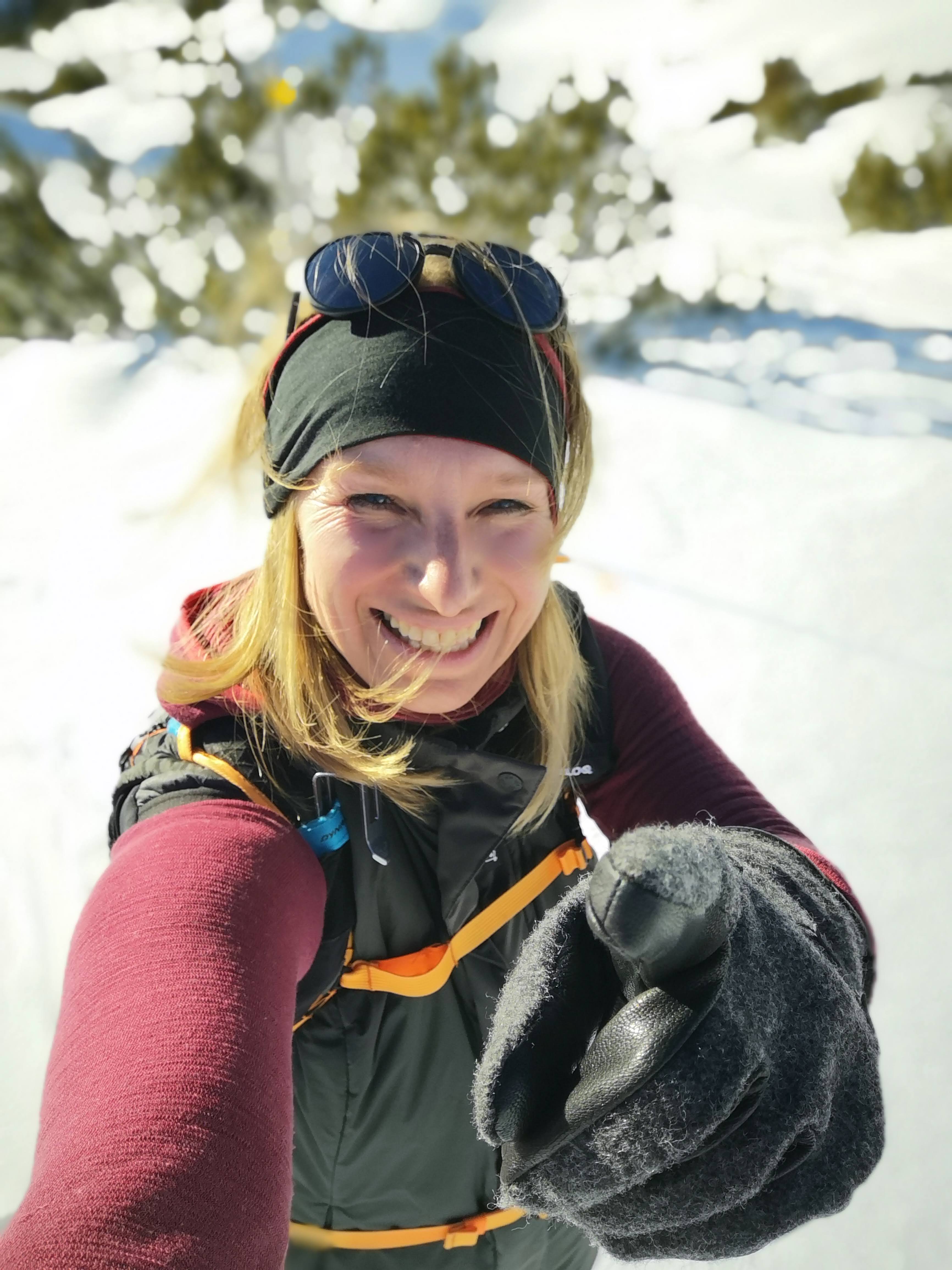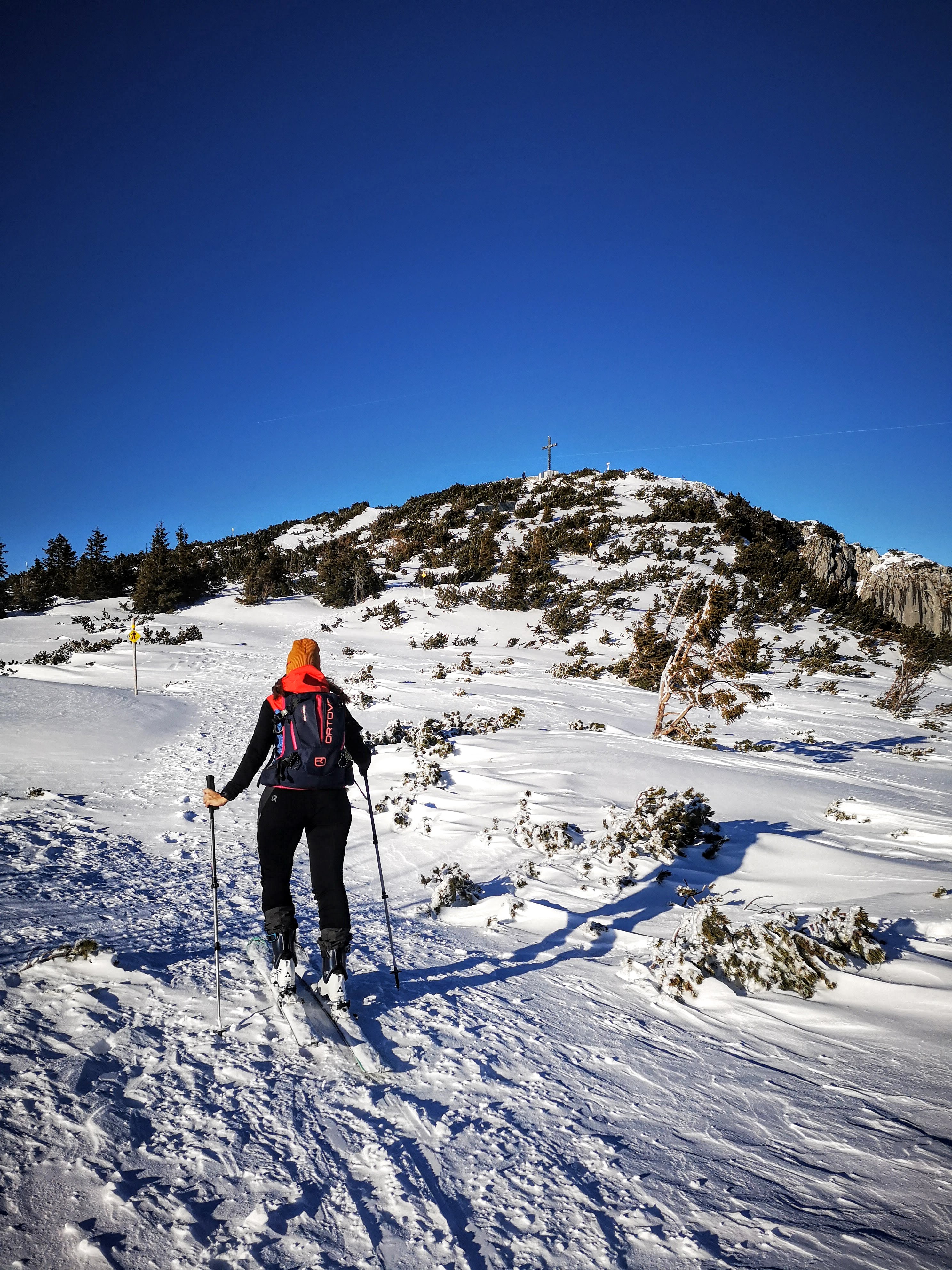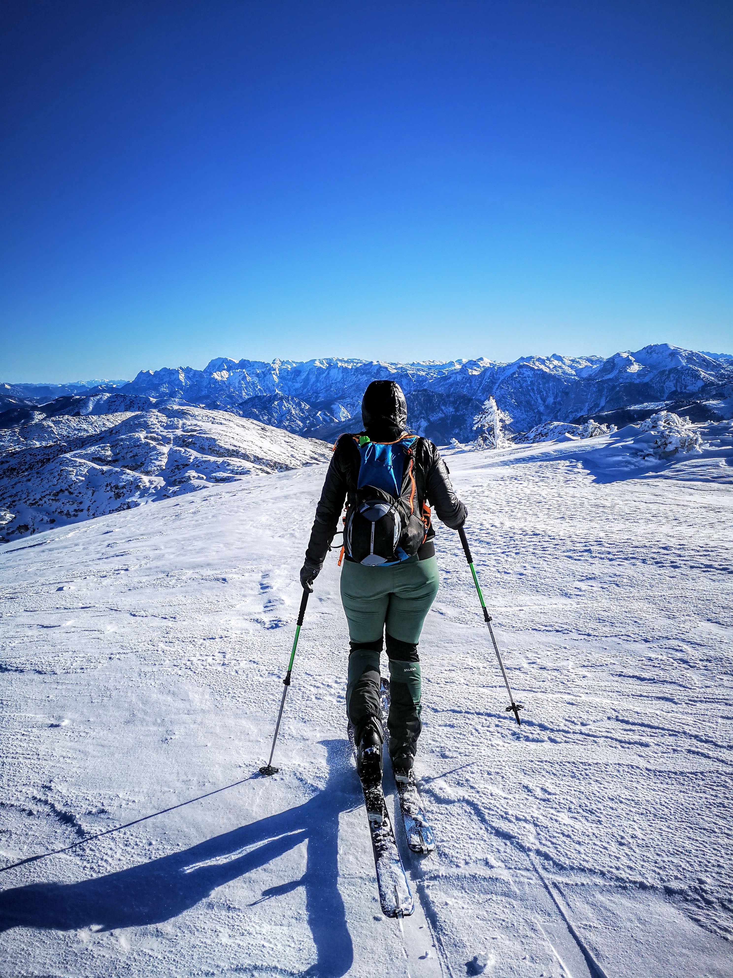 Was für mich mit das Wichtigste auf Tour im Winter ist: ein guter Baselayer! Jahrelang viel getestet und den absoluten Favoriten gefunden. Ohne meinen Lieblings-Merino geh ich kaum auf Tour. Besonders, weil er für diesen Winter ein praktisches Kapuzenupdate mit hohem Schlauchkragen spendiert bekommen hat, dass man sich praktisch bis zur Nase hochziehen kann. Die Rede ist vom wendbaren TUVEGGA Sport Air Hoodie von Devold of Norway (vor 2 Jahren hier am Blog genau vorgestellt, nachlesen -> bergseensucht essentials – Merino Baselayer.) Bei dieser Tour im Höllengebirge hat er mit Bravour die Windchill-Prüfung bestanden. Darüber habe ich meine LaMunt Weste aus recycelten Kashmir gezogen und sturmböenbedingt später noch meine klein packbare Lifaloft Jacke von Helly Hanssen. Die begleitet mich auch schon mehrere Winter lang. Für den Ernstfall war noch ein Fleece und ein ärmelloser, oberschenkellanger Mantel dabei (zum testen statt einer Shelljacke, kommt erst im Winter 22/23 auf den Markt). Handschuhe & dicke Fäustlinge im Rucksack, beides von Zanier. Stirnband – Haube im Rucksack. Unten unten? Lange Merino-Kniesocken (in dem Fall von Ortovox) und meine Salewa Sesvenna 2 als Skitourenhose (auch ein langjähriger Lieblings-Begleiter). Den Windchill Faktor zu unterschätzen – passiert jedem garantiert nur einmal. Denn: je stärker der Wind, desto kälter fühlt es sich einfach an. Und das brennt sich ein…