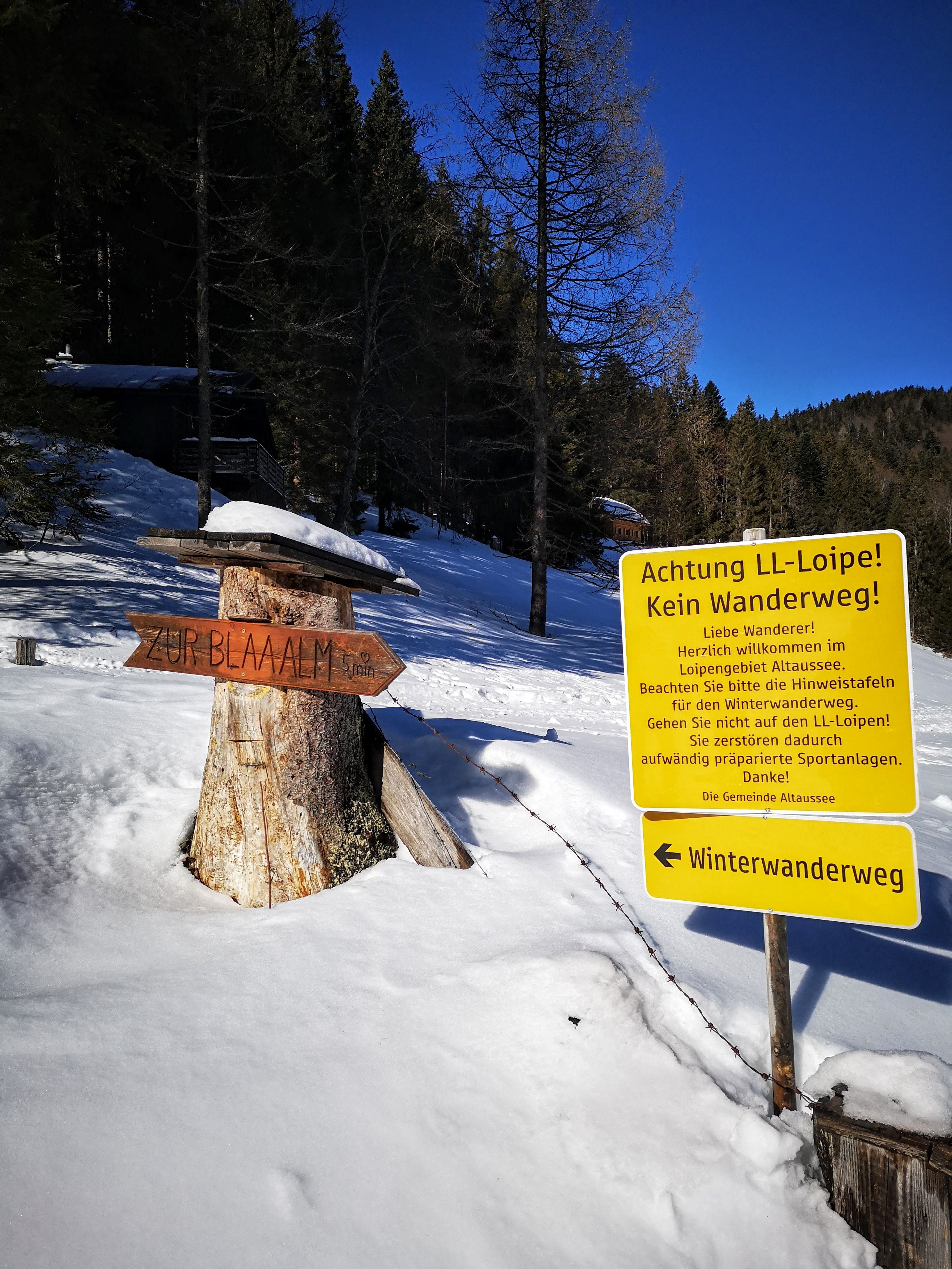 Start: PP Losermaut, Altaussee (kostenfrei) – präparierter Winterwanderweg in Loipennähe (bei der Skischule Haim/Kinderland) – via Klauseck – rund um die Blaa Wiese – Blaa Alm 900m – Losermaut. Retour auch auf der Blaastrasse möglich.