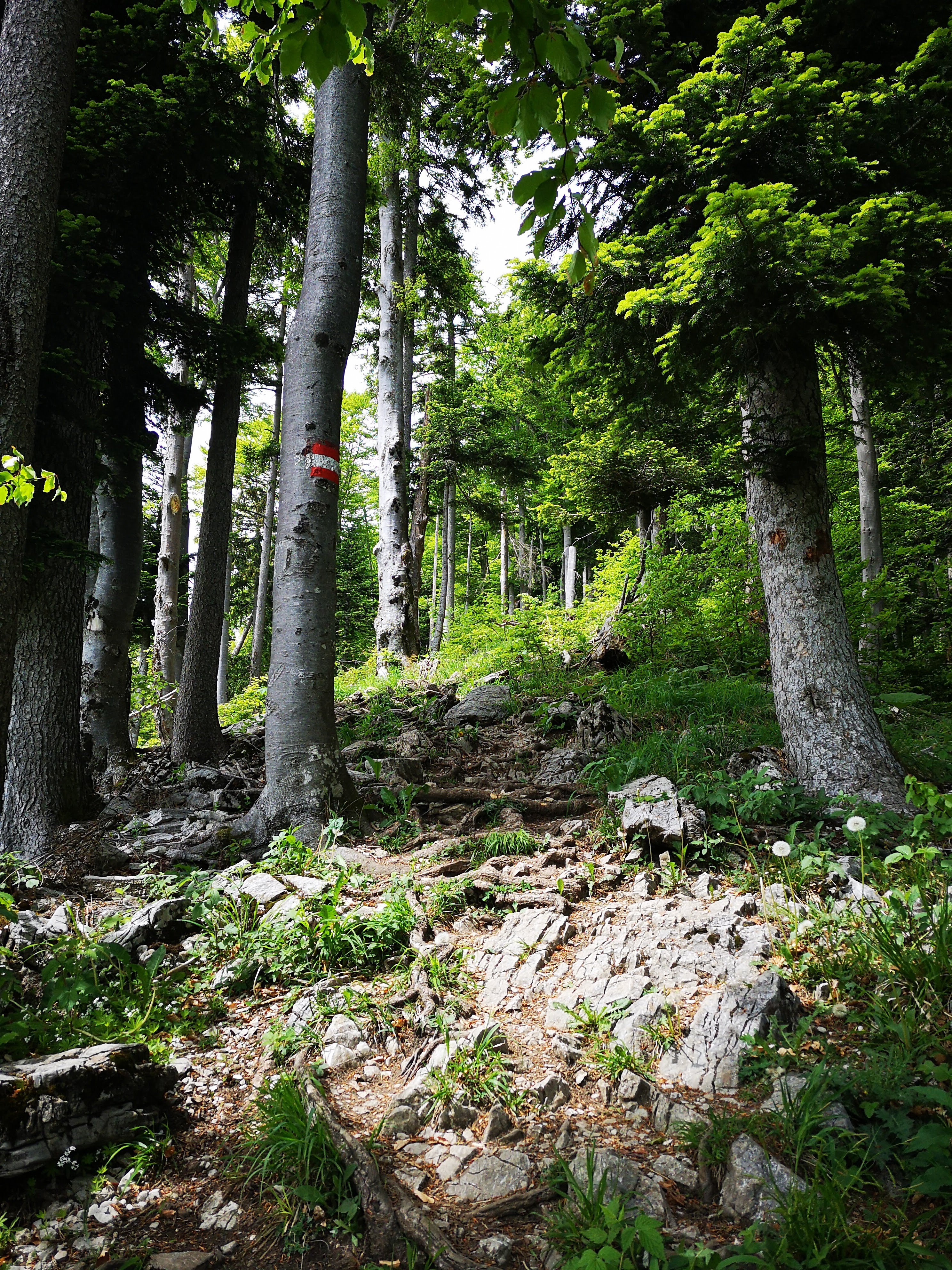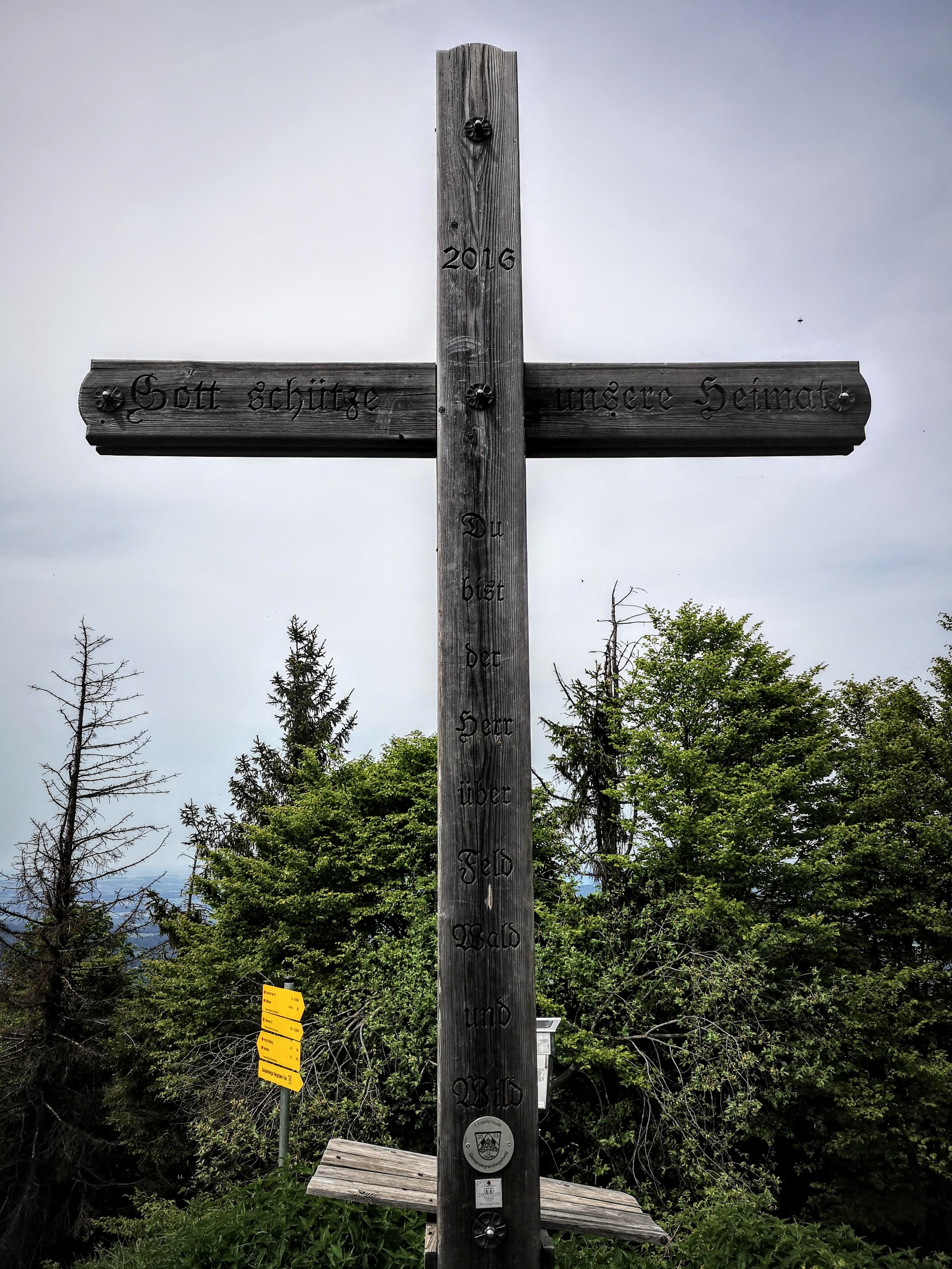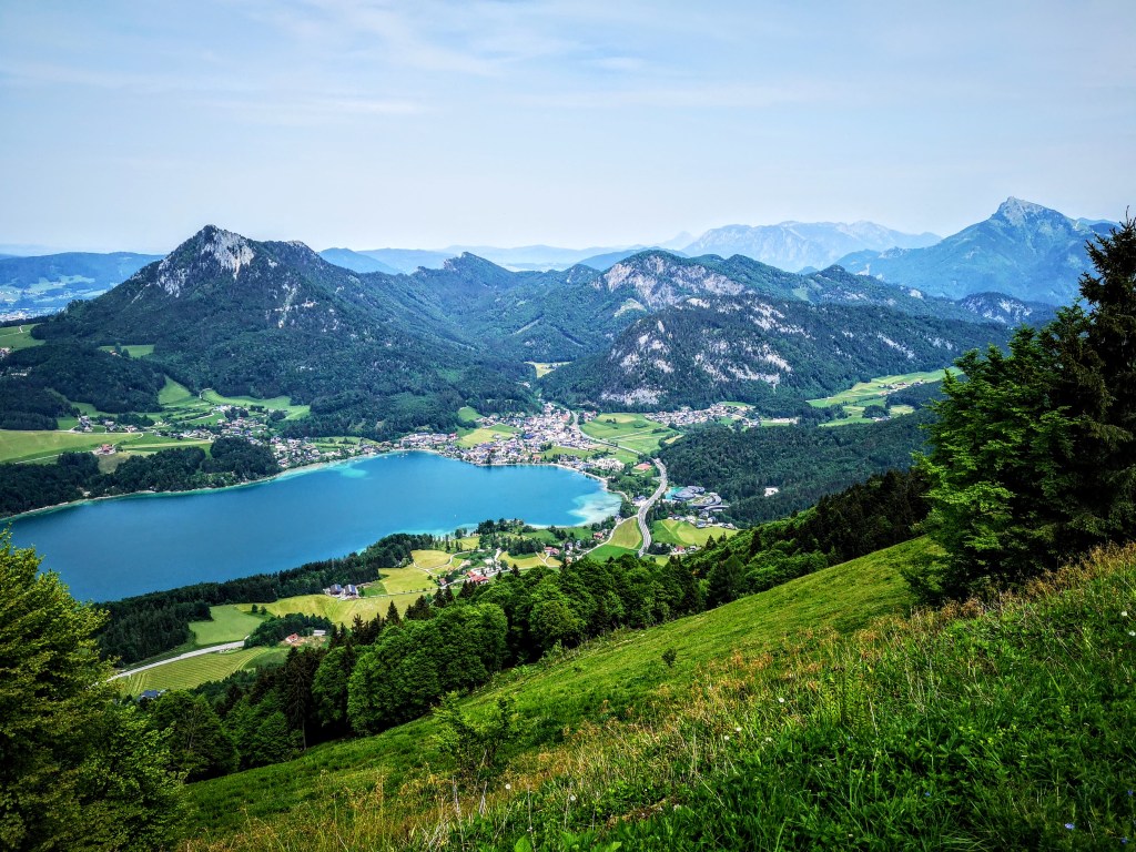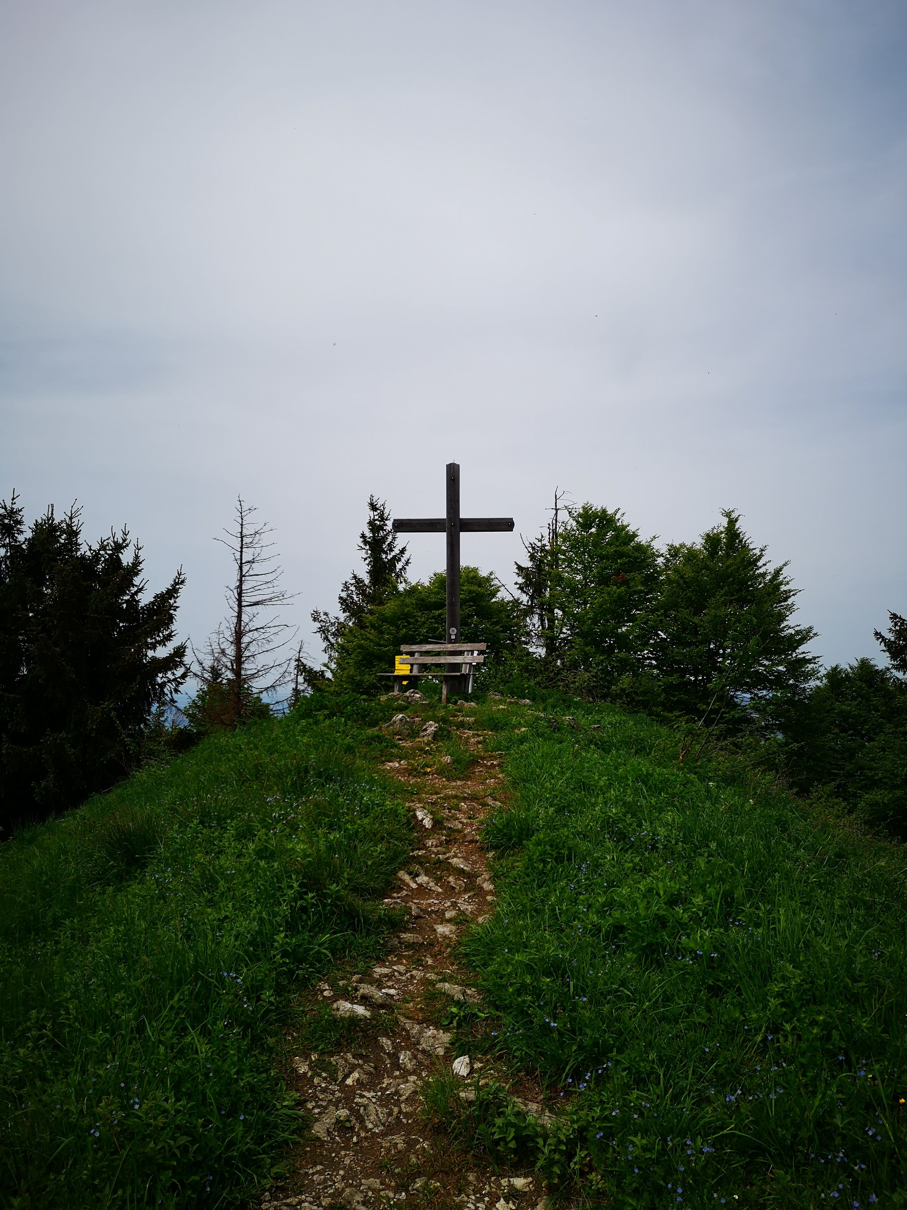 Nach dem See erreicht man schnell die Abzweigung nach Faistenau (linkerhand), rechts führt ein netter Steig im Wald aufwärts und endet am grasigen Grat, der bis zum Gipfelkreuz führt. Rechts unten schimmert der Fuschlsee türkis, links hüpft ein Reh im Wald. Umdrehen nicht vergessen – der Blick geht an klaren Tagen bis zum Dachstein! Beim Gipfelkreuz a kurzes Pauserl und dann fällt die Entscheidung zur Überquerung – der Abstieg in Richtung Hof bei Salzburg sieht bedeutend knieschonender aus. Gesagt getan…