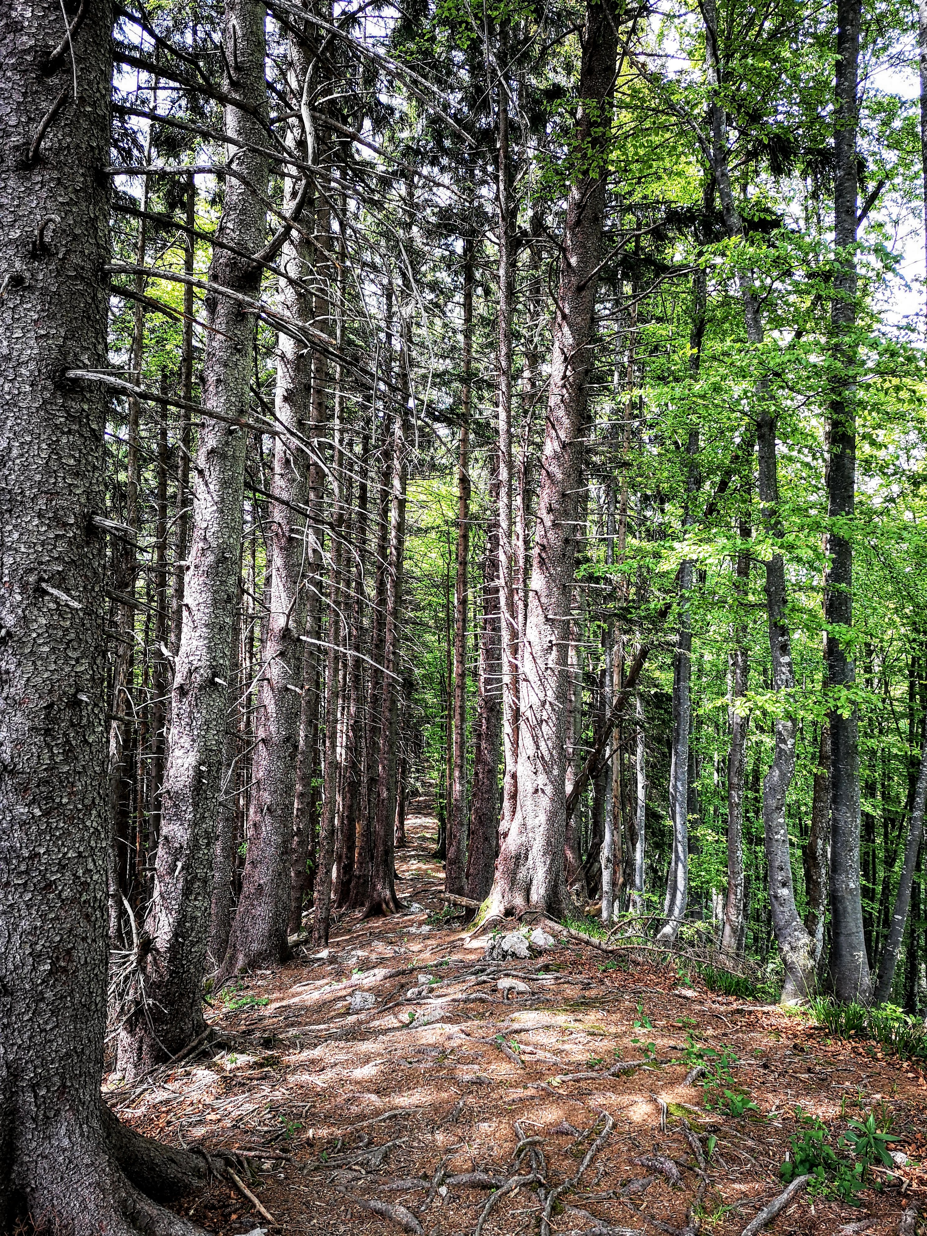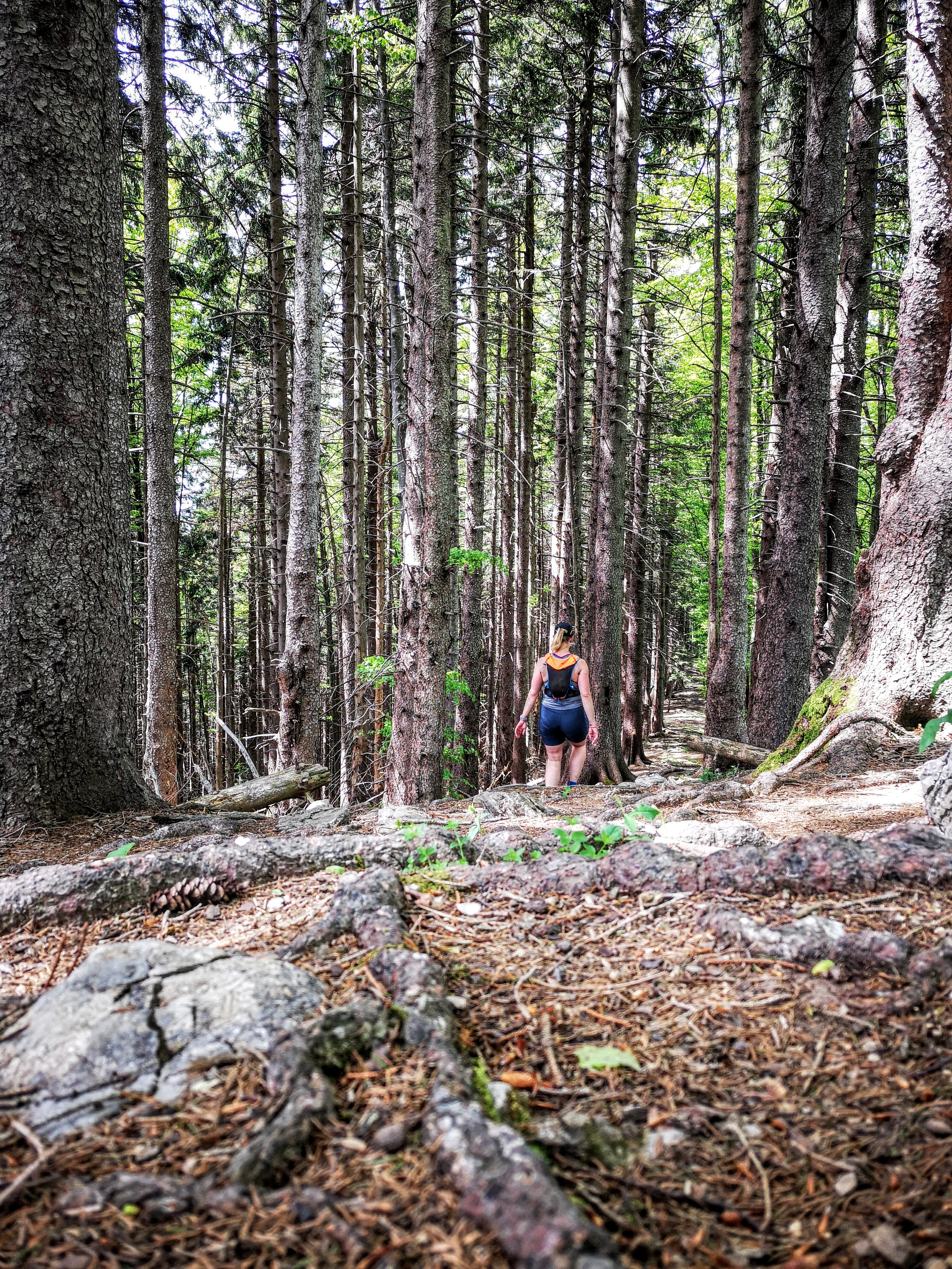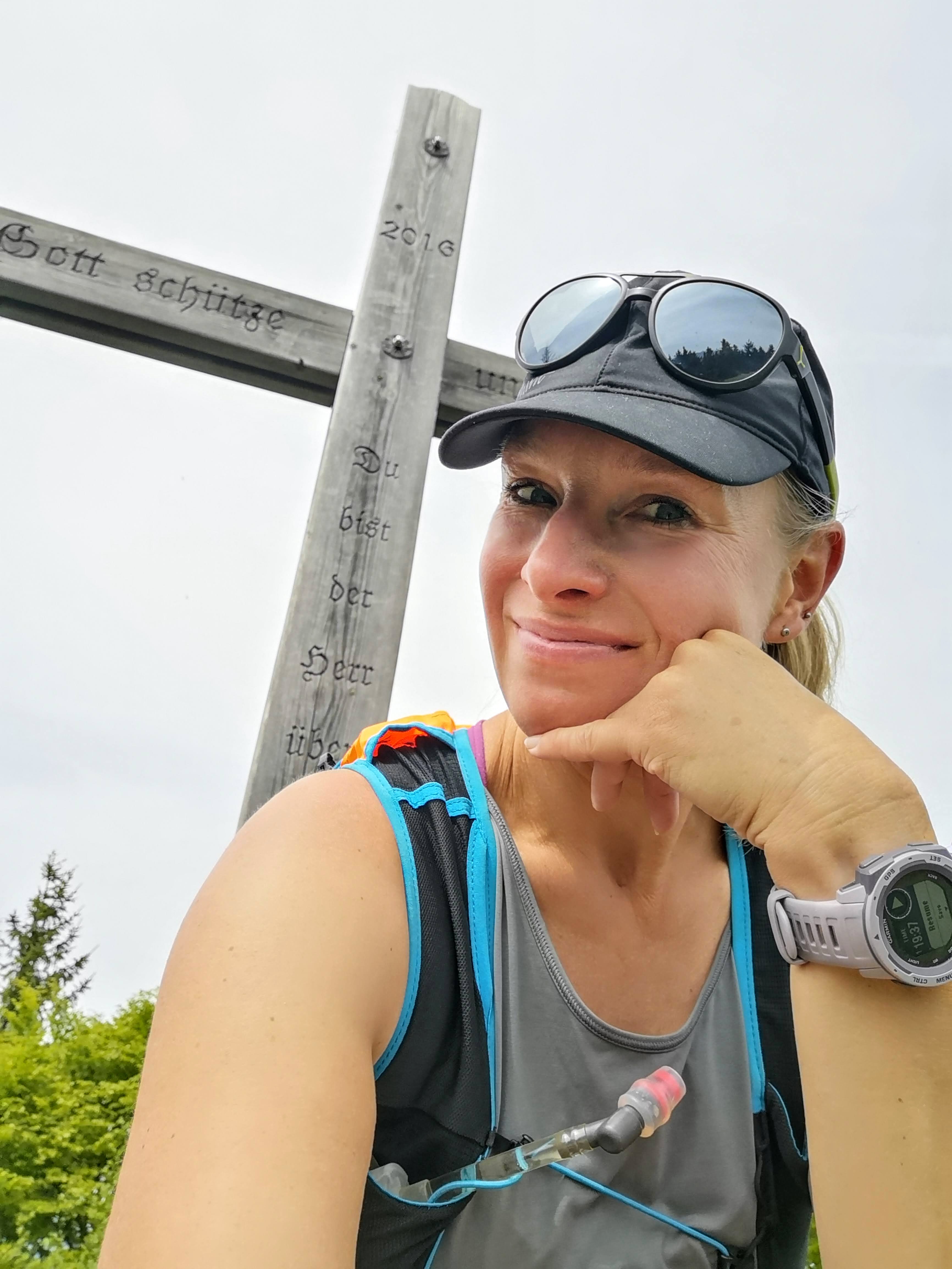 Nach dem See erreicht man schnell die Abzweigung nach Faistenau (linkerhand), rechts führt ein netter Steig im Wald aufwärts und endet am grasigen Grat, der bis zum Gipfelkreuz führt. Rechts unten schimmert der Fuschlsee türkis, links hüpft ein Reh im Wald. Umdrehen nicht vergessen – der Blick geht an klaren Tagen bis zum Dachstein! Beim Gipfelkreuz a kurzes Pauserl und dann fällt die Entscheidung zur Überquerung – der Abstieg in Richtung Hof bei Salzburg sieht bedeutend knieschonender aus. Gesagt getan…