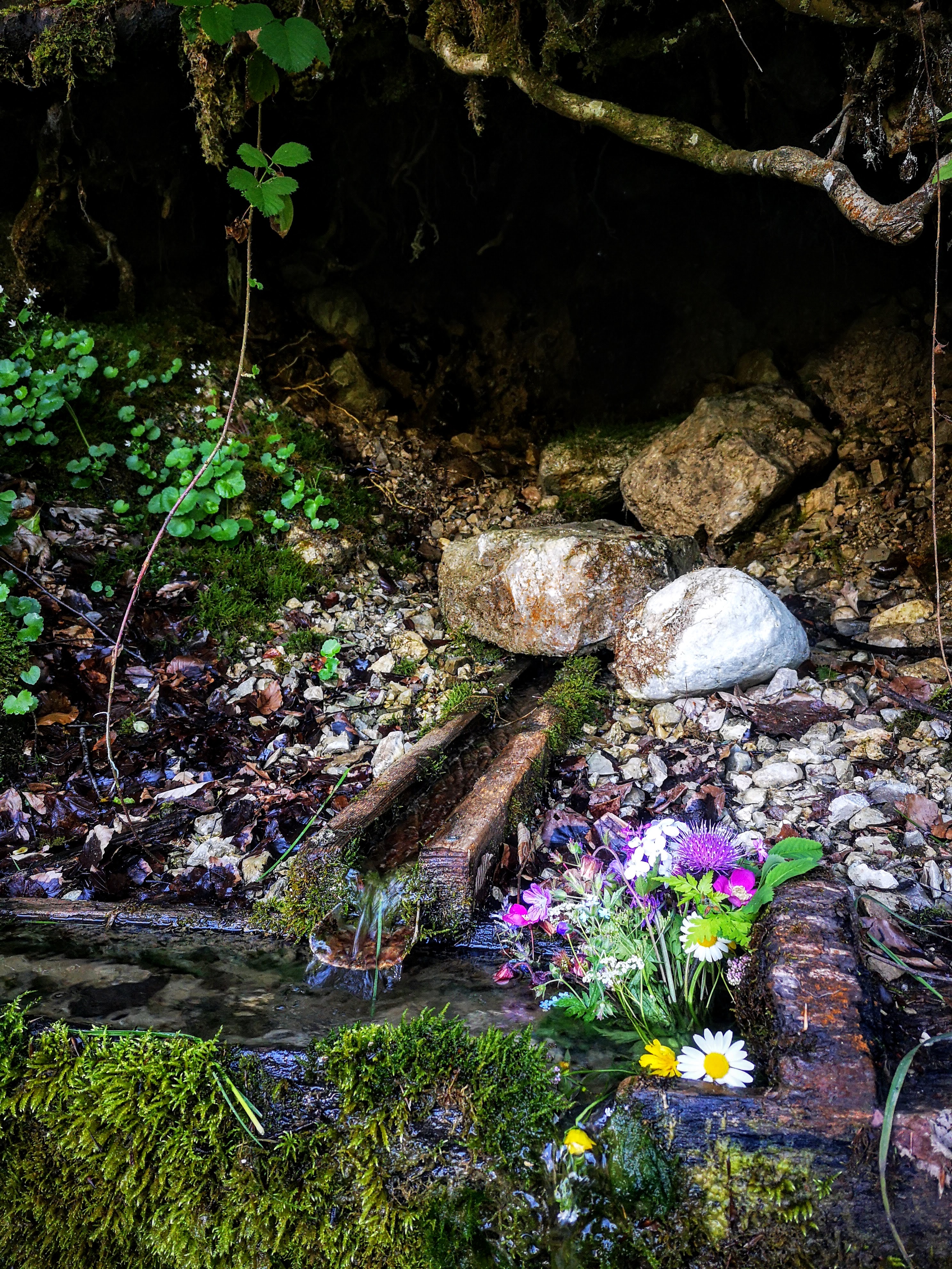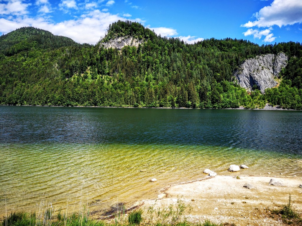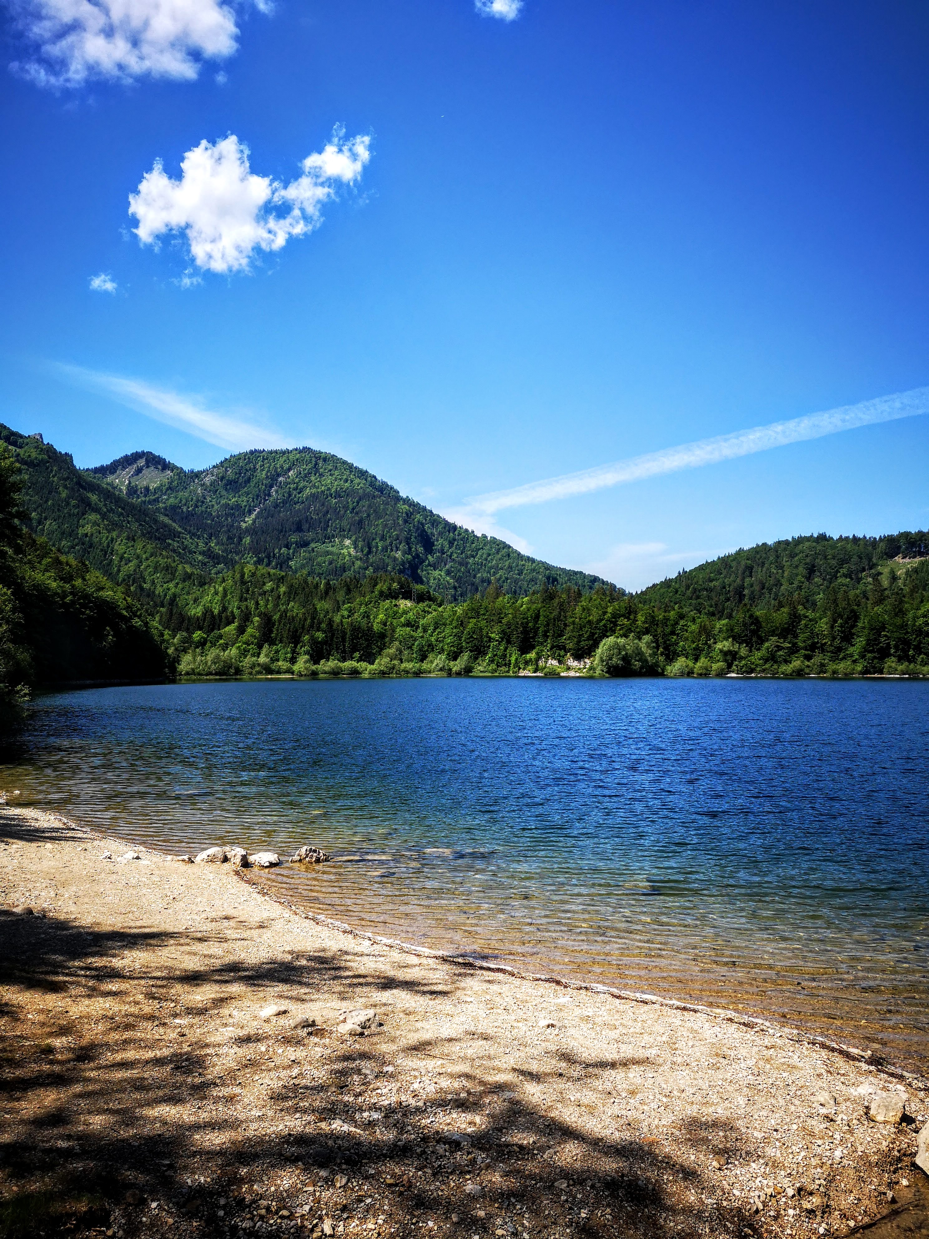 Auf 716m liegt versteckt dieses kleines private Juwel, welches zum Glück trotzdem noch zugänglich ist. Glasklares Wasser – wos anderes san ma jo im Salzkammergut eh nit gewöhnt. Fischen ist nur mit Lizenz (bei Lore od OÖ Fischereiverband) erlaubt, Bootfahren verboten. Vorbei am GH zur Lore zum hinteren Seeende, wo sich das Schongebiet befindet, bitte dort nicht mehr ins Wasser gehen. Weiter, den See im Rücken, vorbei an satt blühenden Wiesen – dem Rauschen gefolgt, Moosbach Wasserfall gefunden.