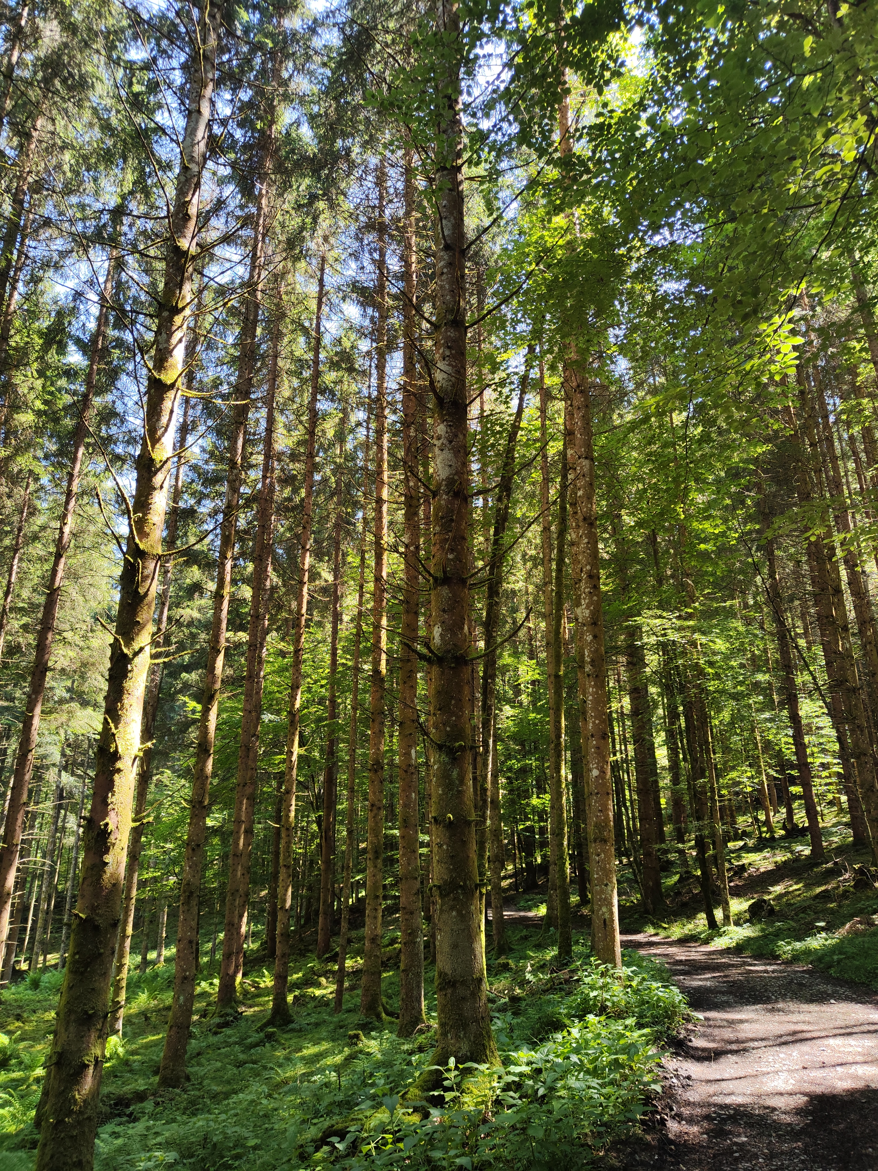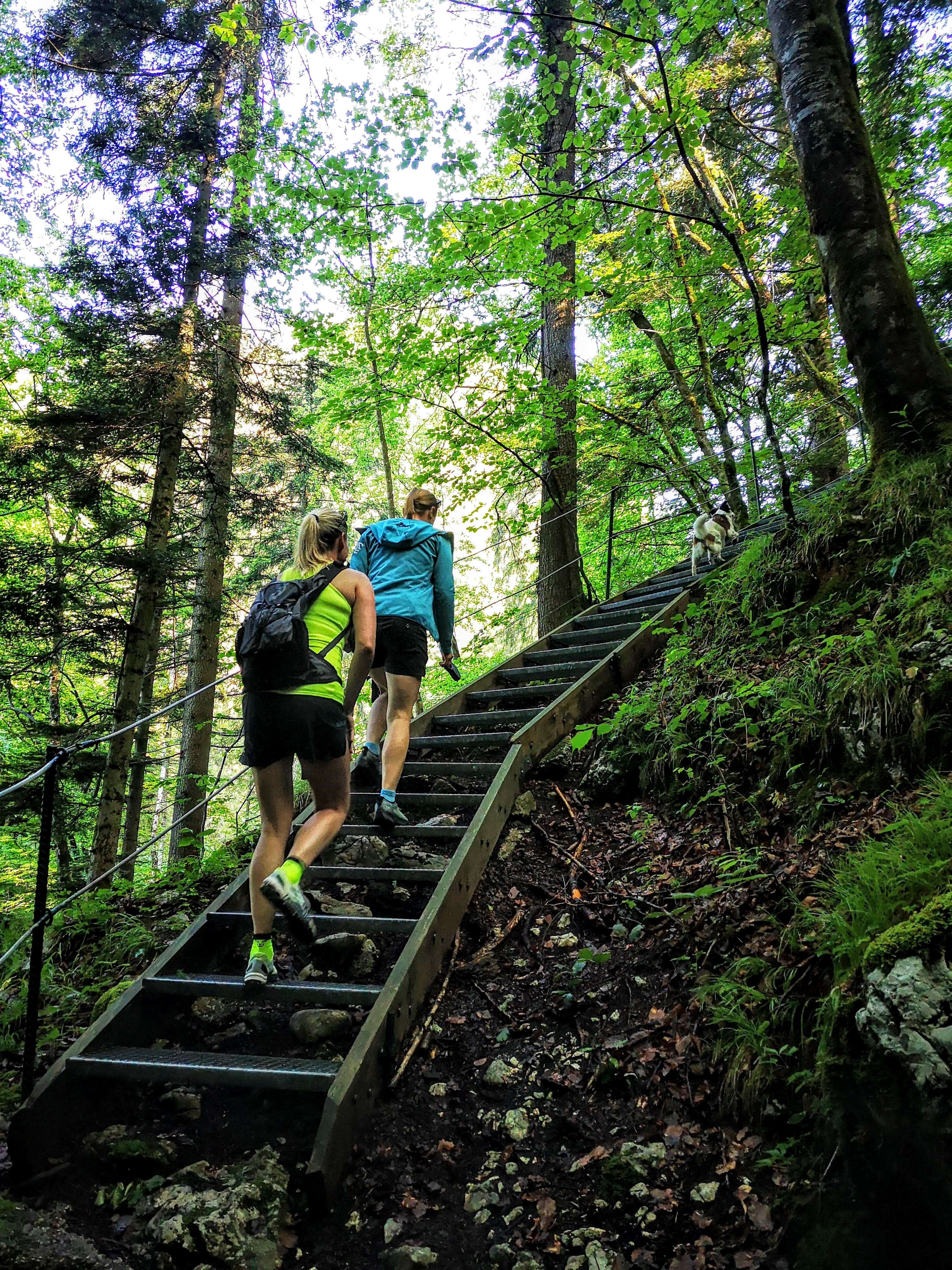 Wer als Frühsport was für seinen Gluteus Maximus tun mag – den Wirersteig mit seinen 410 Stufen kann ich dafür empfehlen. Früher gab’s den Luxus der vielen Eisentreppen und des Stahlseilgeländers dort fix nicht in diesem Ausmass. Er startet beim Kraftwerk in Schwarzenbach, führt zwischen dem Strubeck 850m auf der linken Seite des Lugbergs 916m zum Schwarzensee – er endet genau auf einer Wiese oberhalb des GH Lore.