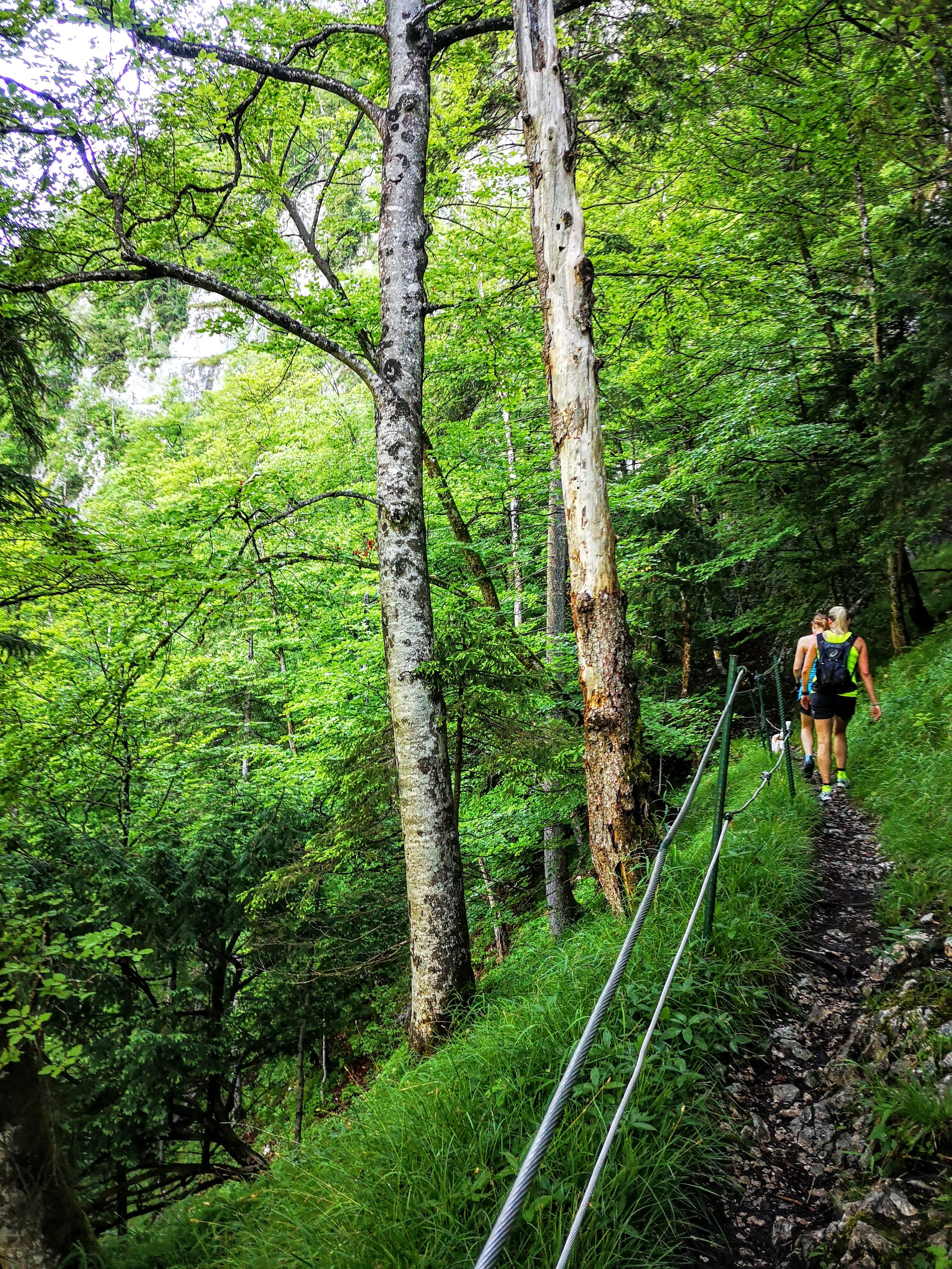 Zwischendrin nur a schmales Wegerl, links gehts zT steil und ausgesetzt in die Tiefe (deswegen wohl auch das fast durchgehende Seil-Geländer) – super schön is der Blick zum Wasserfall über die Schlucht! Im großen und ganzen aber wohl der harmloseste, schwarz markierte Steig, den ich je gegangen bin. Trittsichere Kinder schaffen diesen mühelos. Großer Vorteil: der Wirersteig ist großteils schattig weil im Wald und so an heissen Sommertagen wirklich empfehlenswert!