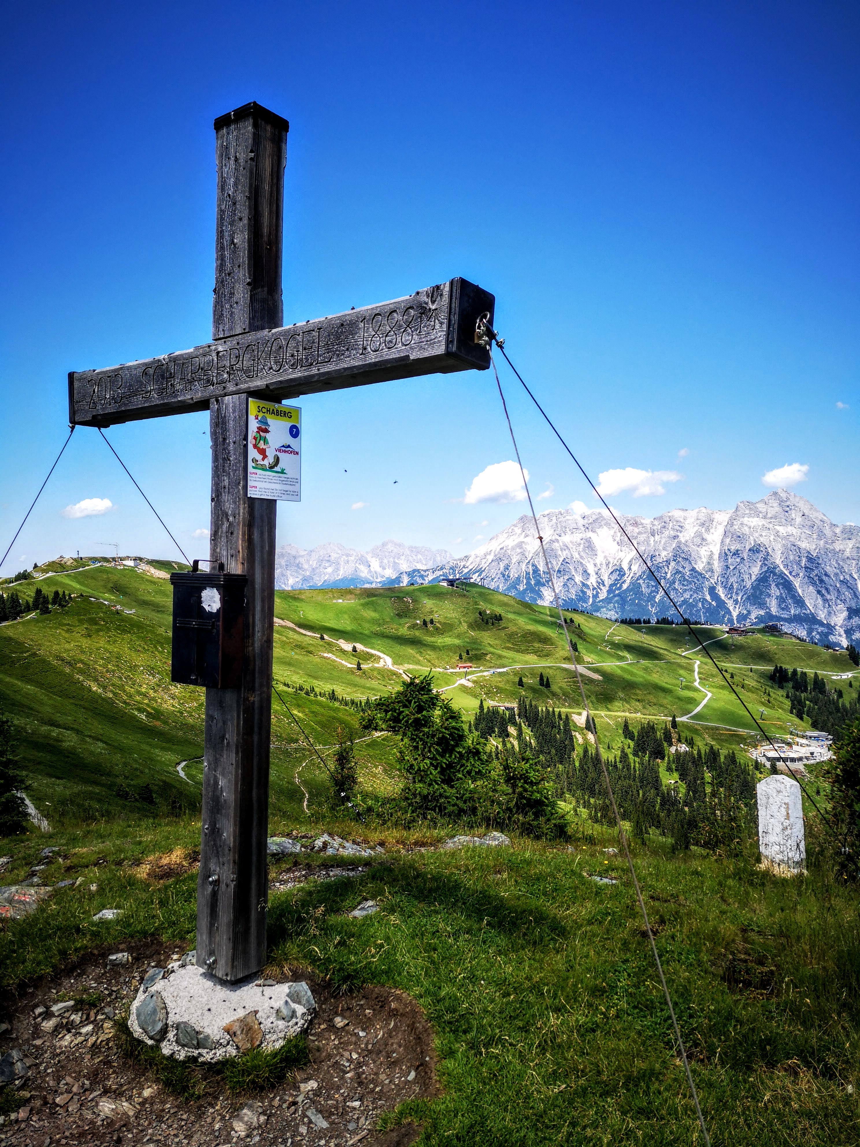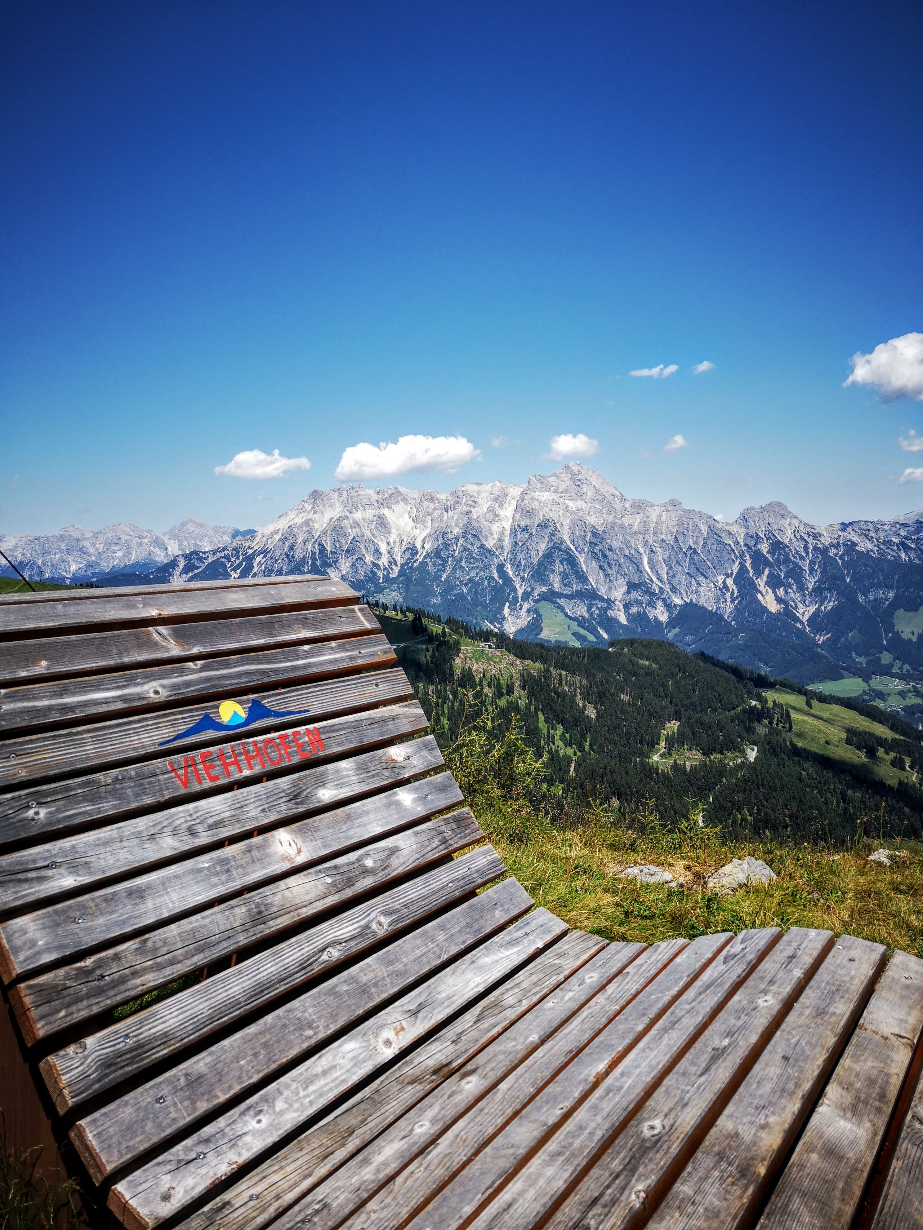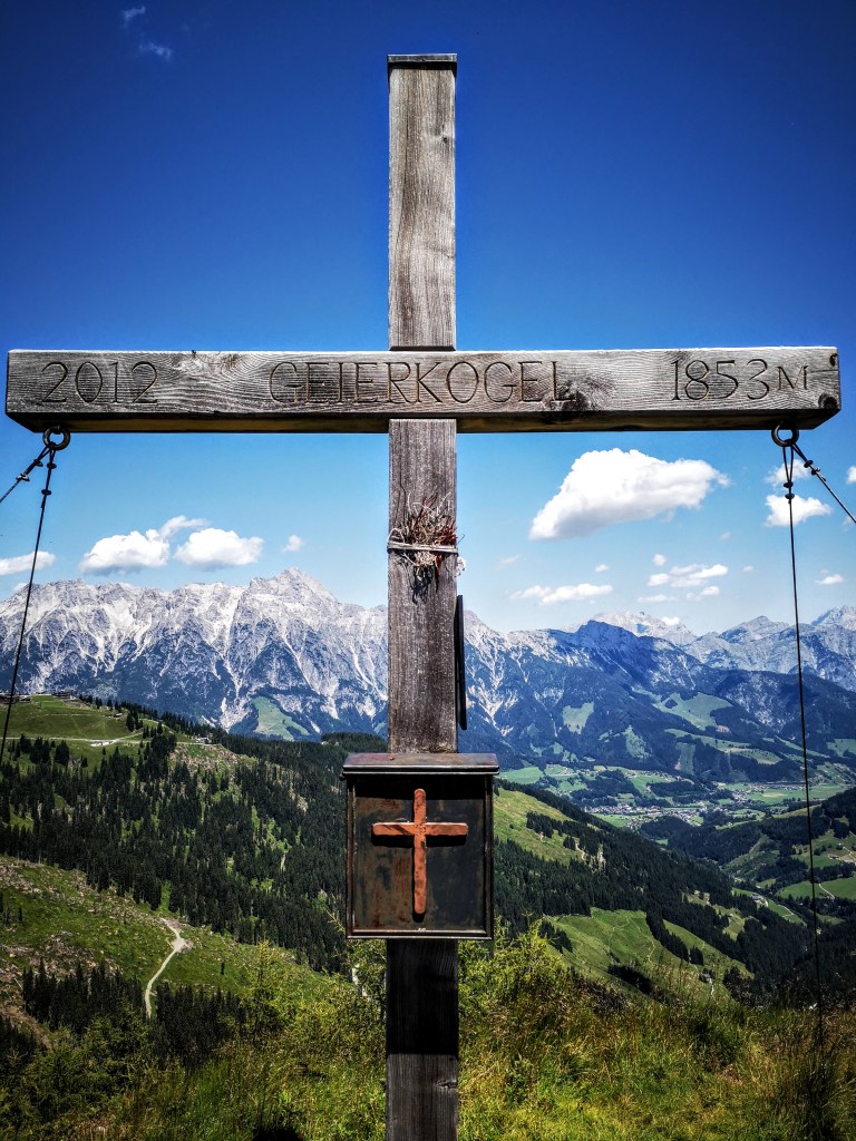 Über die Hecherhütte gelangt man auf weichen Waldsteigen zur Geierkogelhütte (eine Unterstandshütte ohne Bewirtschaftung), ein Katzensprung vom Gipfel entfernt. Dieser wartet mit einem echt spektakulären Ausblick, einer Ruheliege und einer Käfer-Invasion. Deswegen statt Pause am Geierkogel Flucht nach vorne. Am Schabergkogel 1888m vorbei, danach quer durchs Skigebiet via zum Naturkino am Asitz, Seidlalm / Schönleitenhütte zur Wildenkarhütte und ihrem Speicherteich (ehrlich gesagt, mehr Augen zu und schnell rüber). Dort gibt es das kleine, hübsche Gipfelkreuz nicht mehr, stattdessen eine weitere Baustelle im Skigebiet. Scho irgendwie a bissi traurig – des Kreuz war fia mi a besonderes. Aber guad, is so. Dafür wartet danach wieder ein super schöner Abschnitt, der über den Saalachtaler Höhenweg bis zur Kohlmais Bergstation führt. Eine Wiedergutmachung für meine Augen und die Haxn freuen sich auch…