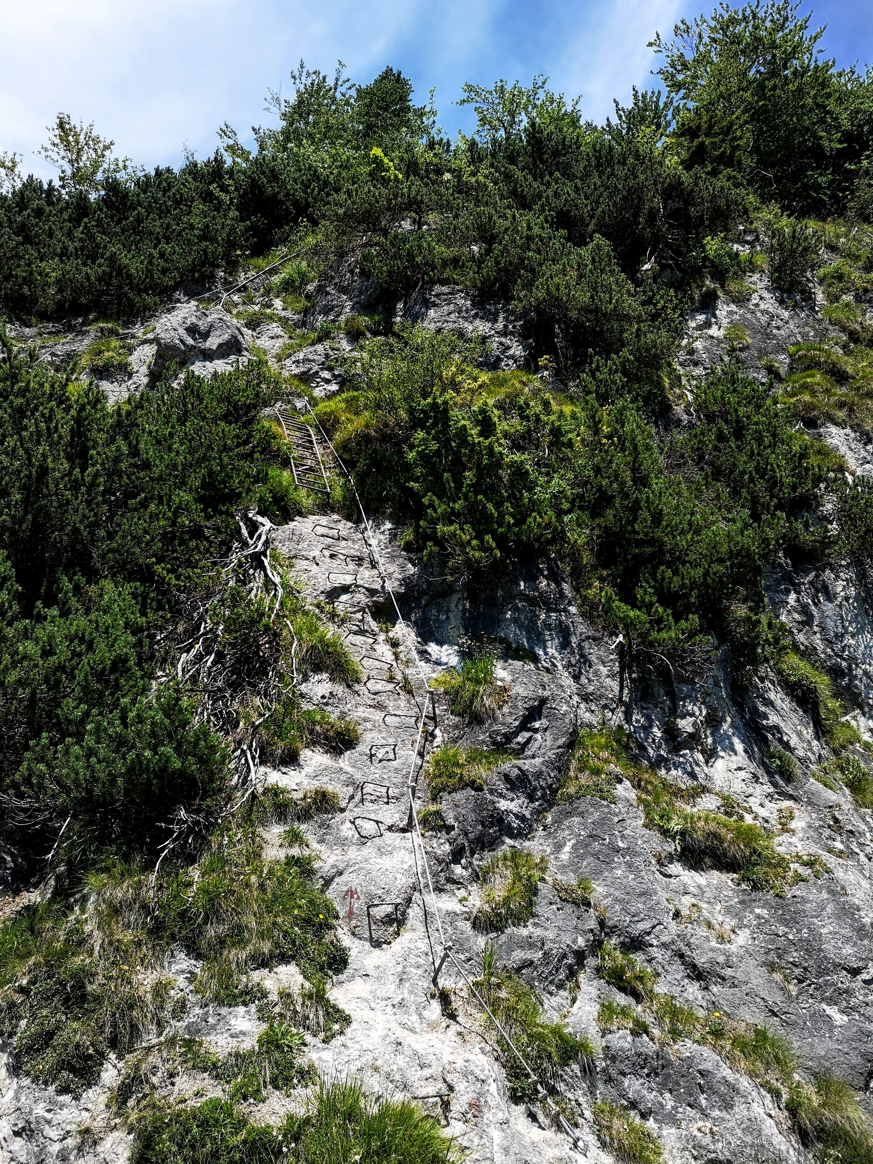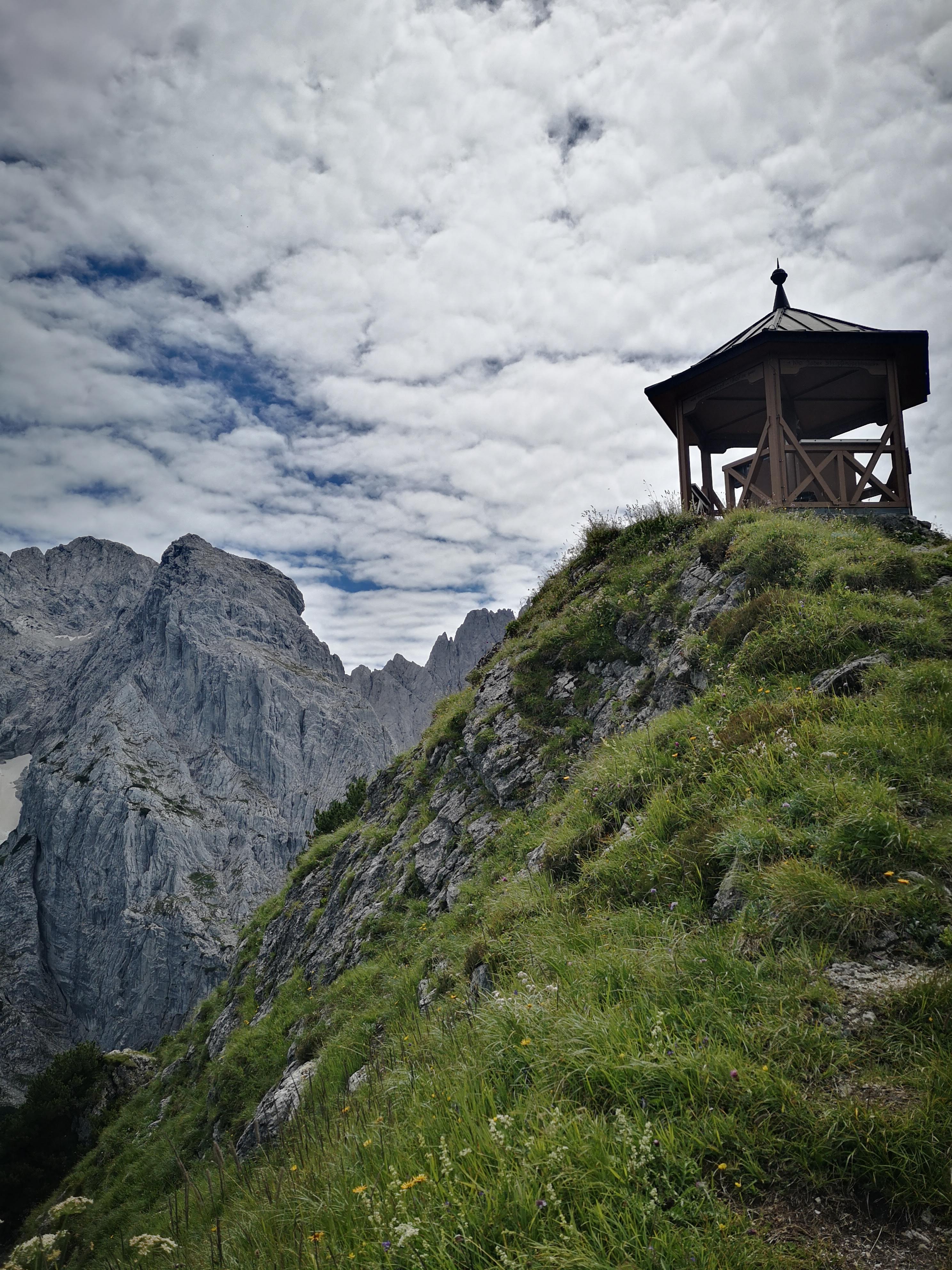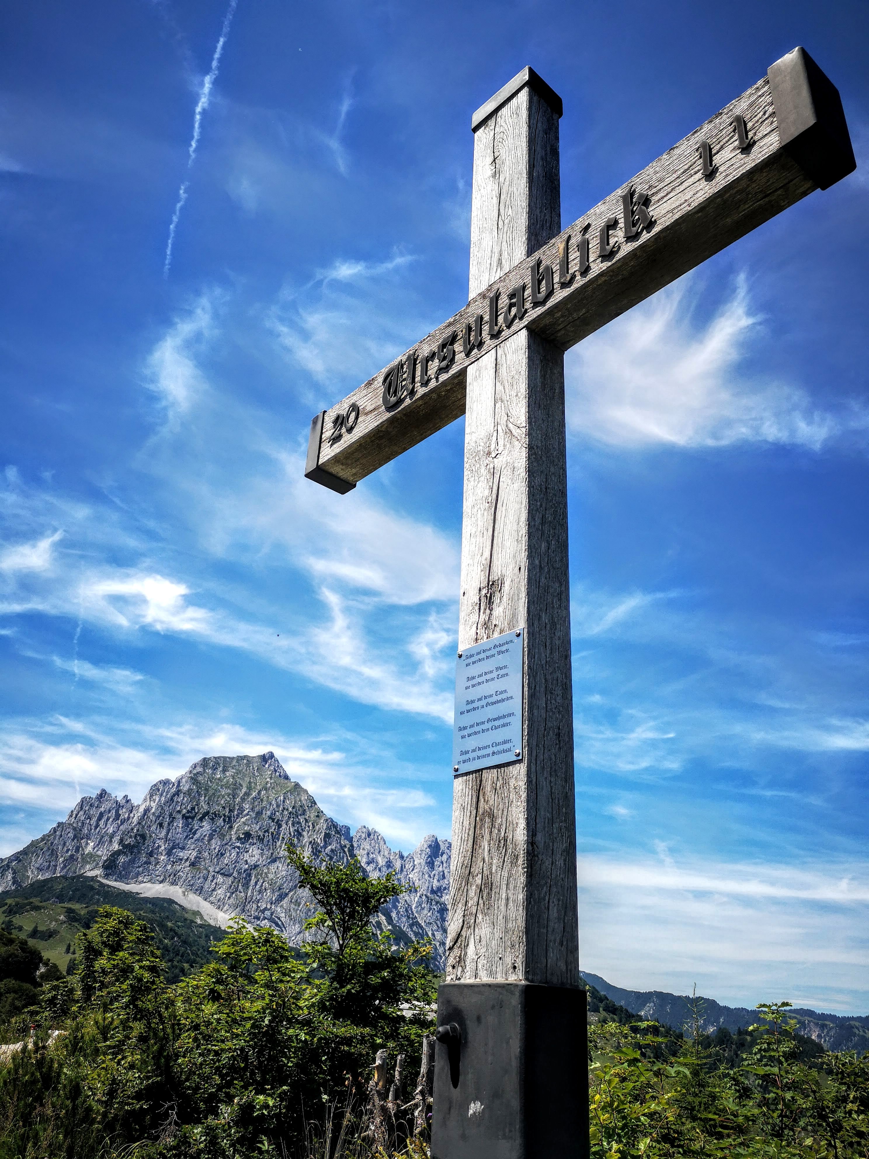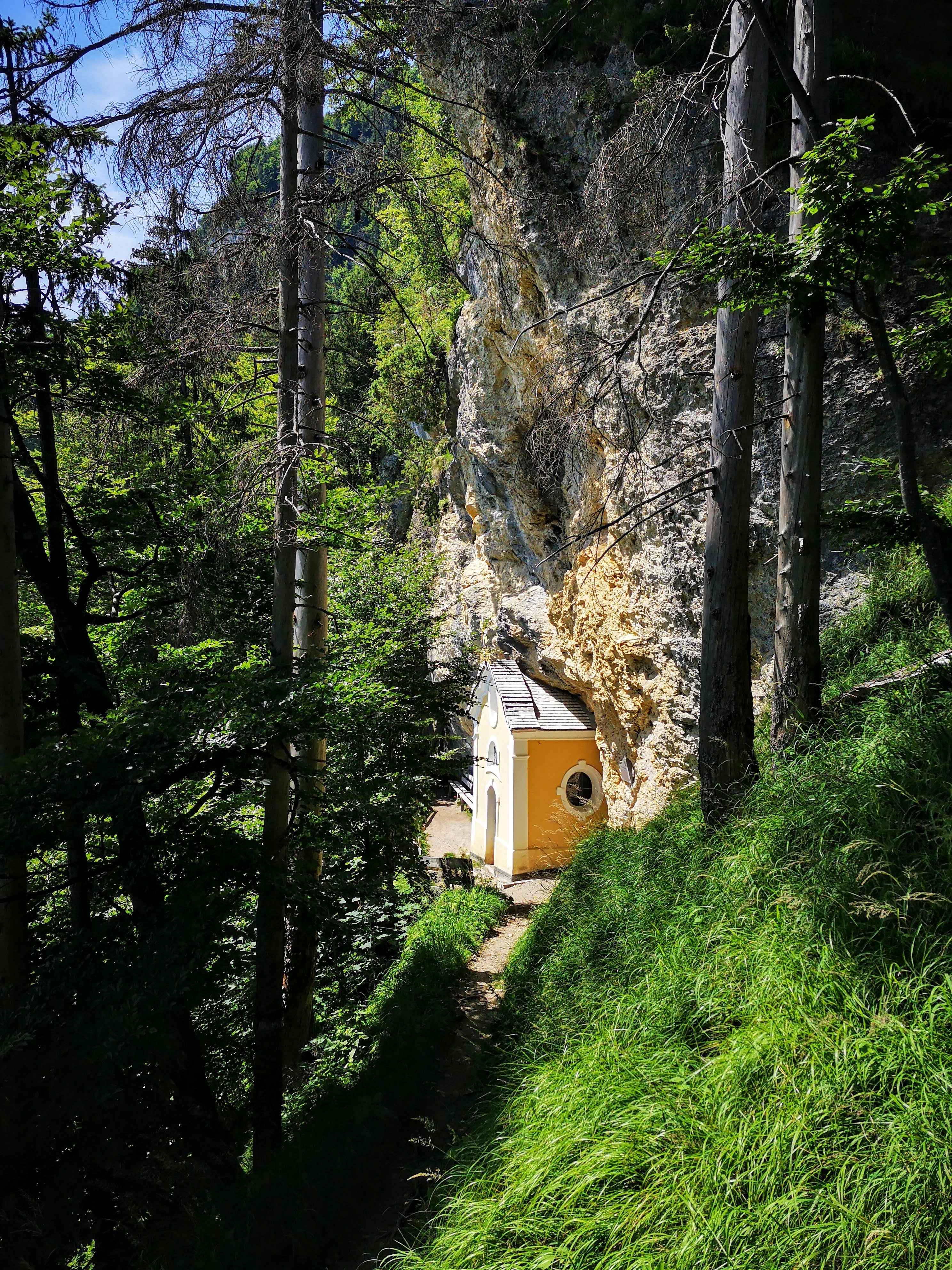 Knackig steiler & im oberen Teil seilversicherter Aufstieg (bis zum Einstieg 300hm auf 0,9km) zu einem besonderen Platzal über St. Johann, dem Ursulablick auf 1245m (bei Trittsicherheit & Schwindelfreiheit kein Klettersteigset nötig). Hitzeschlacht aber trotzdem super, weil die Überschreitung großteils im Schatten (Wald, bewaldeter Kamm) zu gehen ist. Details seilversicherter Aufstieg: es geht nur kurz steil bergauf, mit Trittklammern & 3 Leitern überwindet man die letzten Meter auf den Niederkaiserkamm schnell. Würde man oben nach links überschreiten, kommt man zum Schleierwasserfall. Nach rechts gehts zum Ursulablick. Nach dem Gipfelkreuz geht es im auf & ab weiter über den Schatterberg 1274m und zT steil bergab zur Gmailkapelle, diese wurde 1782 halb in den Fels gebaut – der Name stammt von dem Wort Gemälde und hat nix mit mailen zu tun. Ein Ort der Stille, im Sturm der Zeit – genau das ist sie. Über die alte Einsiedlerei Maria Blut geht es dann unterhalb des Niederkaisers über Almwiesen retour.